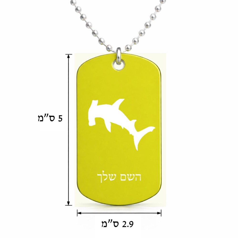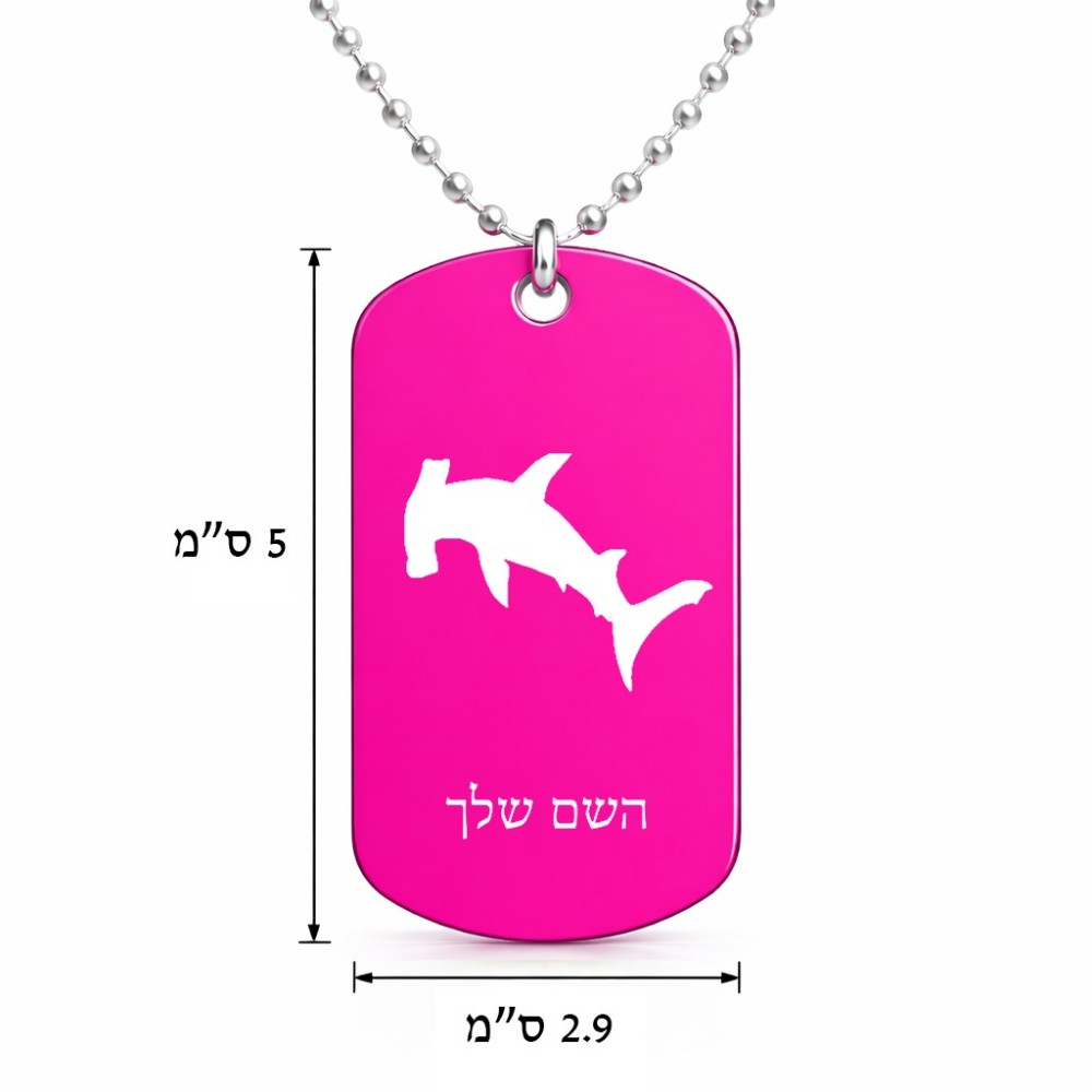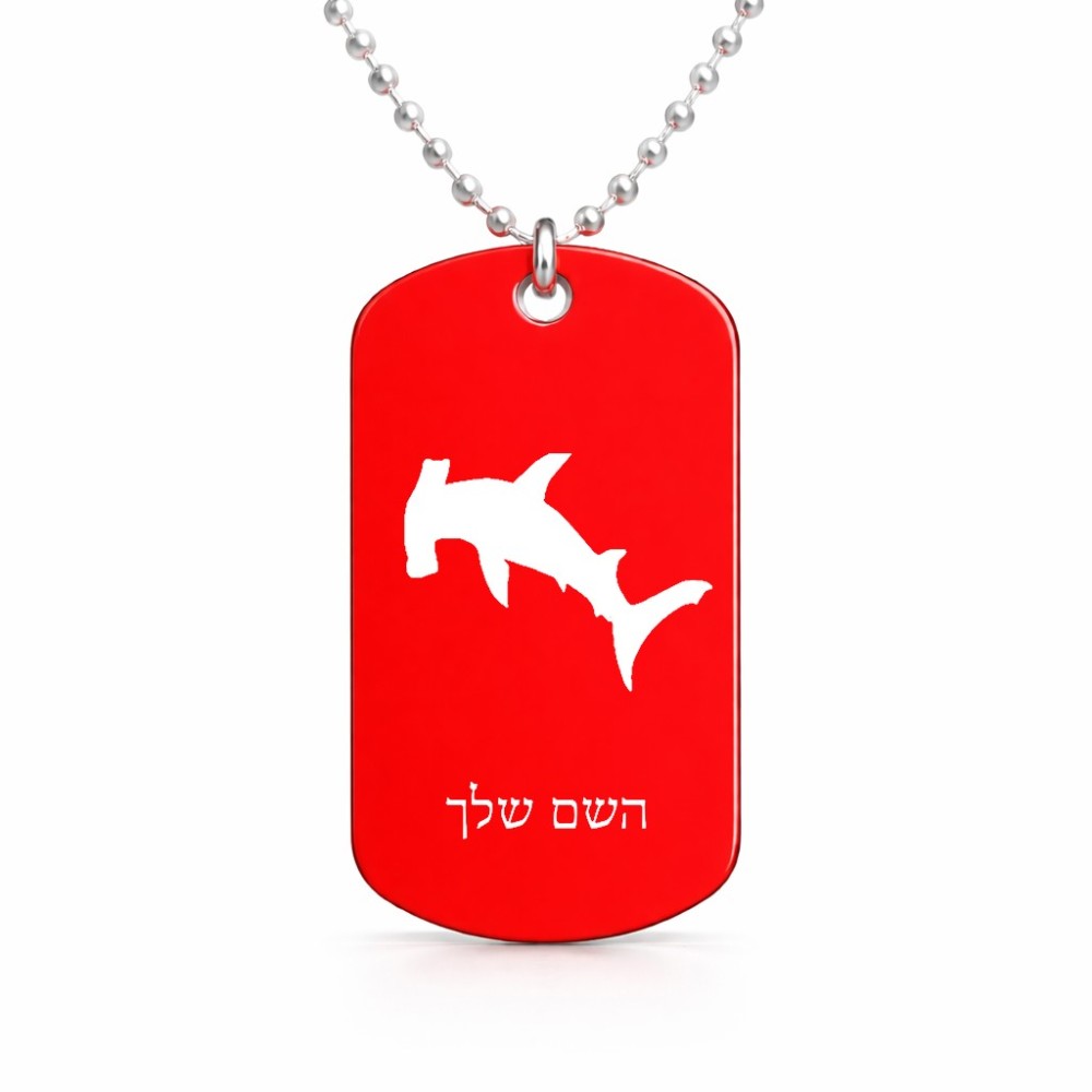 שרשרת דיסקיט מאלומיניום בעיצוב אישי עם השם שלך בעיצוב כריש ראש פטיש גודל הדיסקיט 2.9 × 5 ס"מ. את השם המבוקש ניתן לציין בהזמנה, אם לא צויין אנחנו ניצור קשר לבירור.