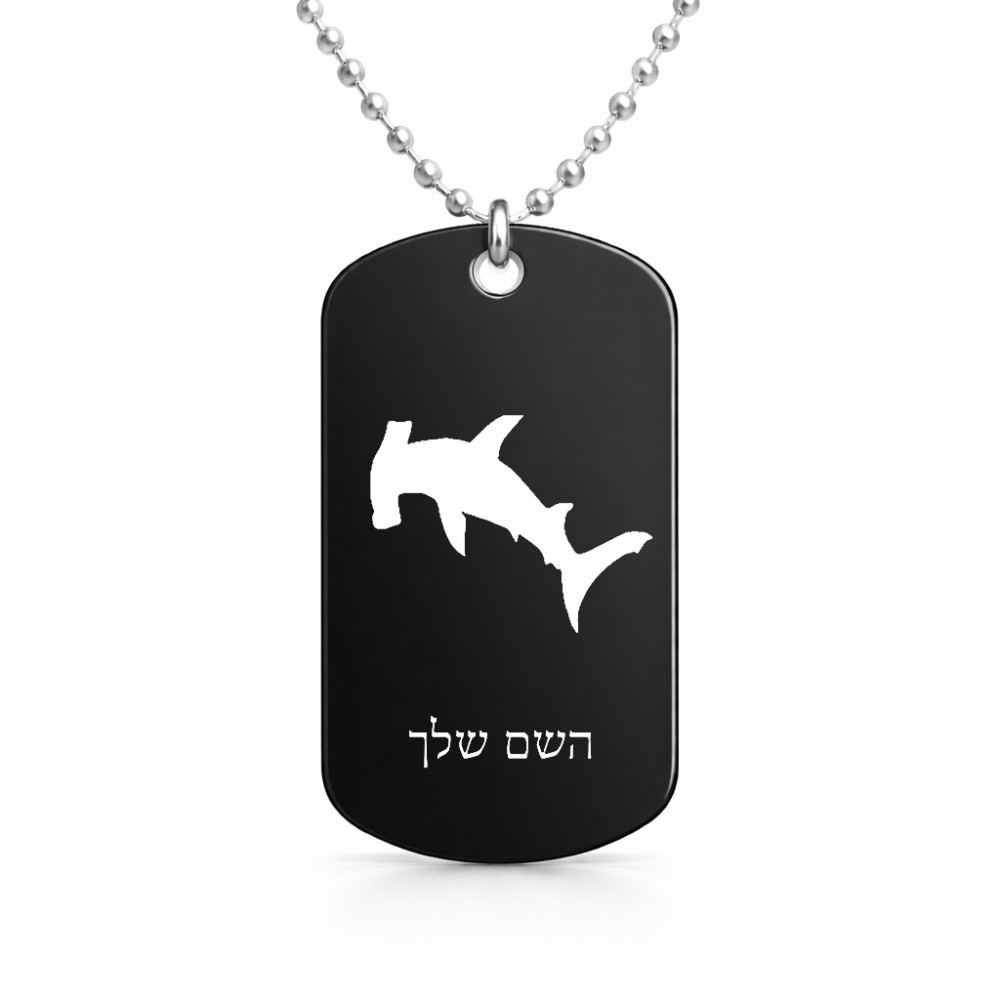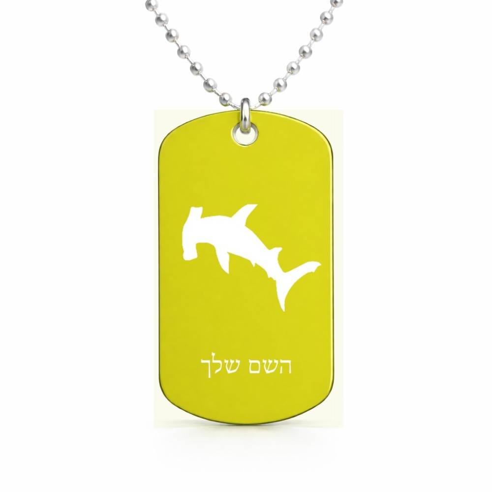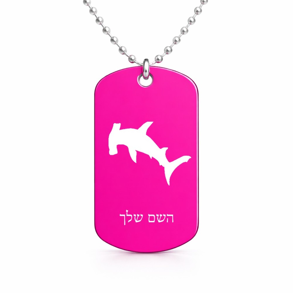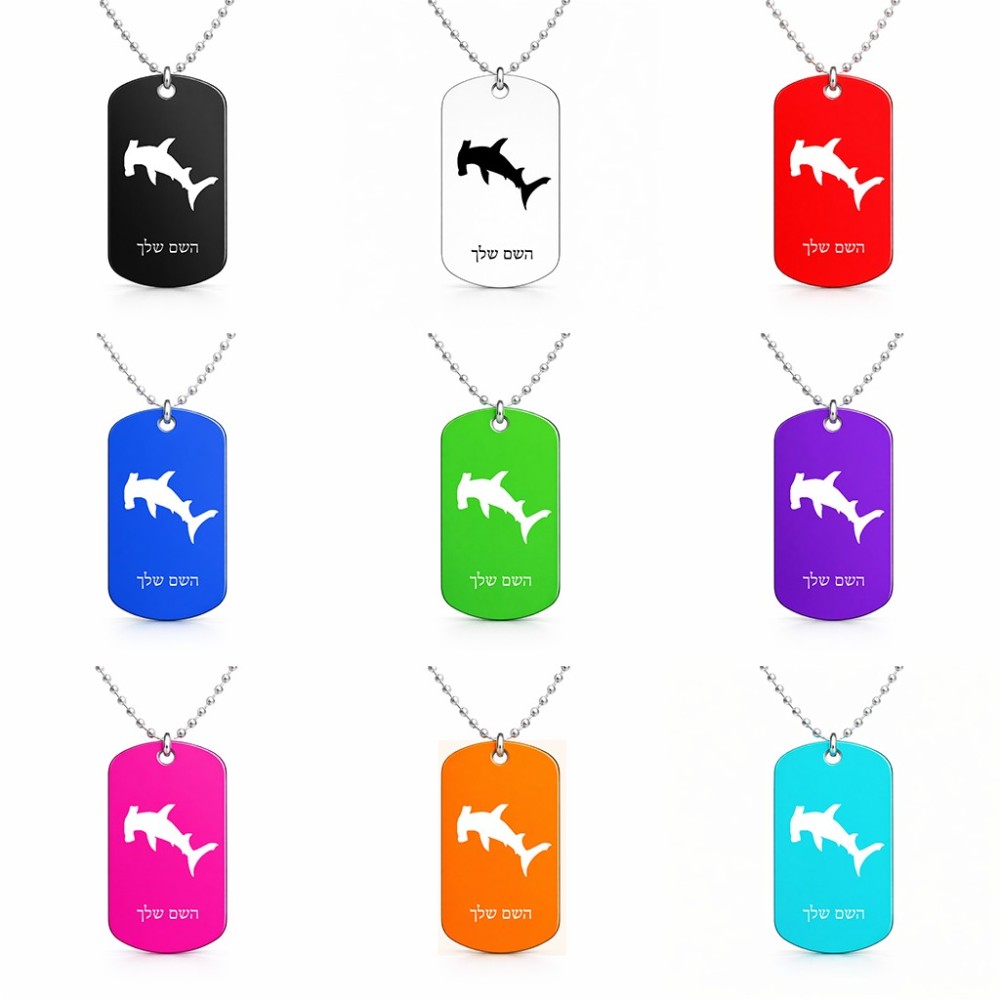 שרשרת דיסקיט מאלומיניום בעיצוב אישי עם השם שלך בעיצוב כריש ראש פטיש גודל הדיסקיט 2.9 × 5 ס"מ. את השם המבוקש ניתן לציין בהזמנה, אם לא צויין אנחנו ניצור קשר לבירור.