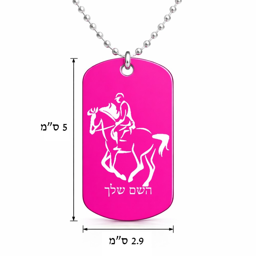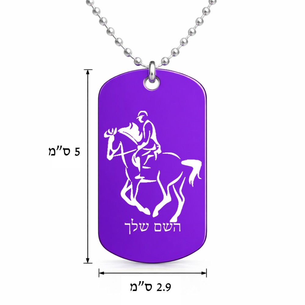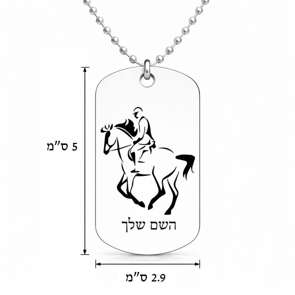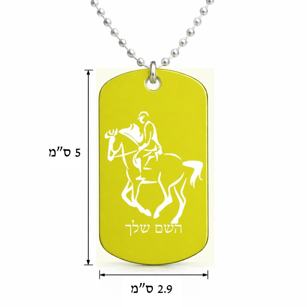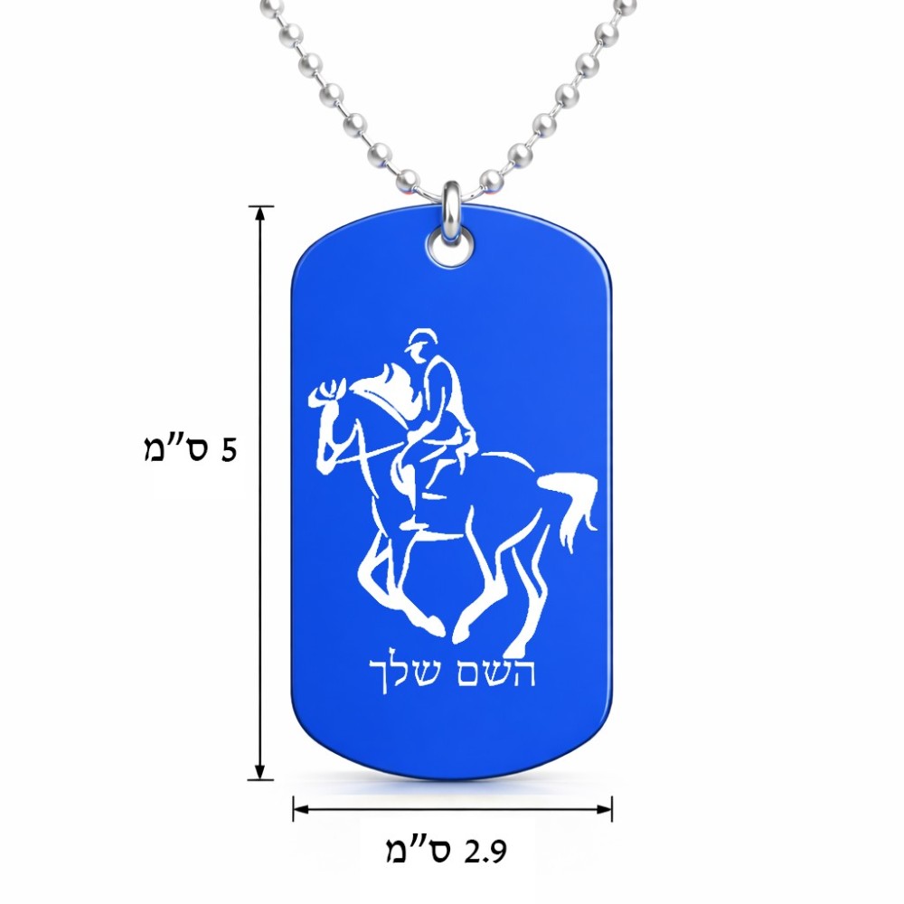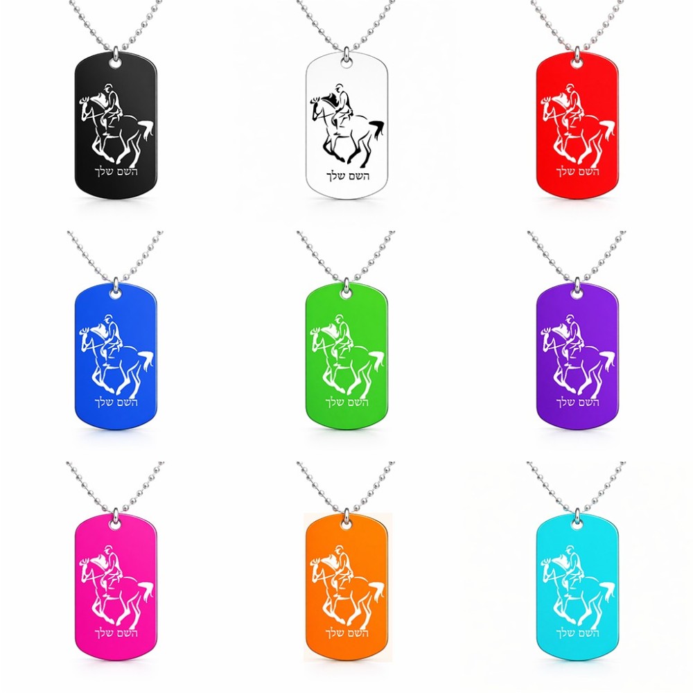 שרשרת דיסקיט מאלומיניום בעיצוב אישי עם השם שלך בעיצוב רוכב סוסים 2 גודל הדיסקיט 2.9 × 5 ס"מ. את השם המבוקש ניתן לציין בהזמנה, אם לא צויין אנחנו ניצור קשר לבירור.