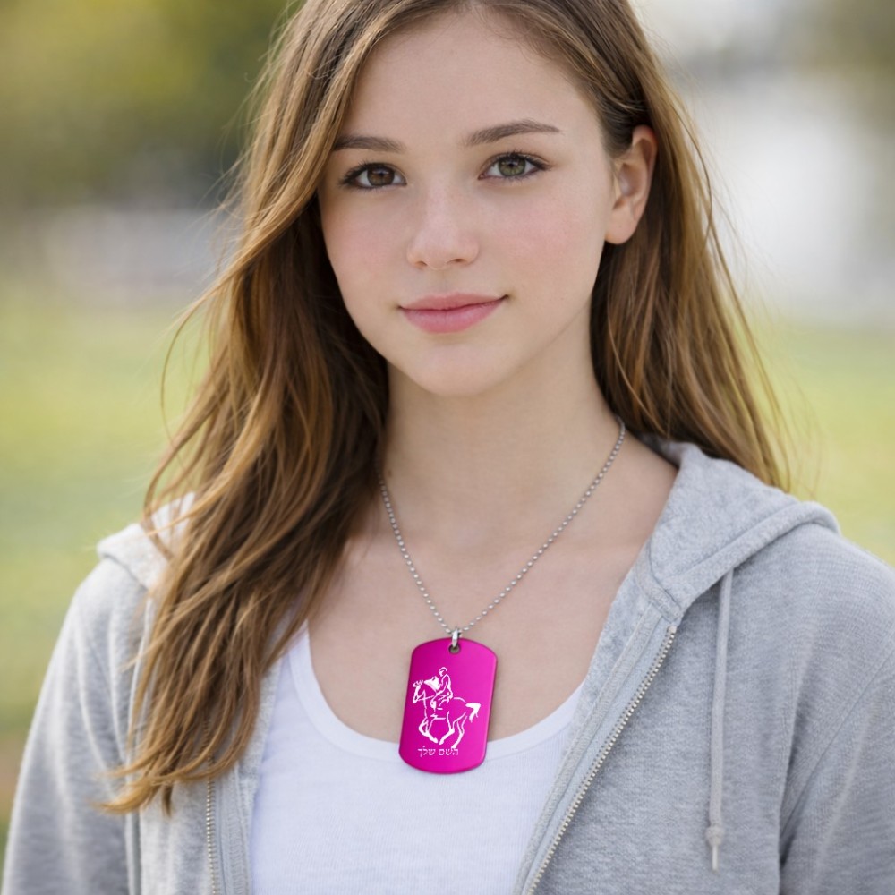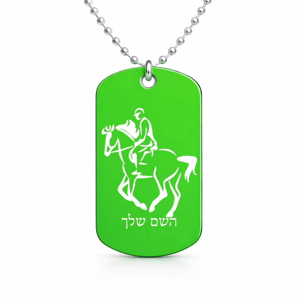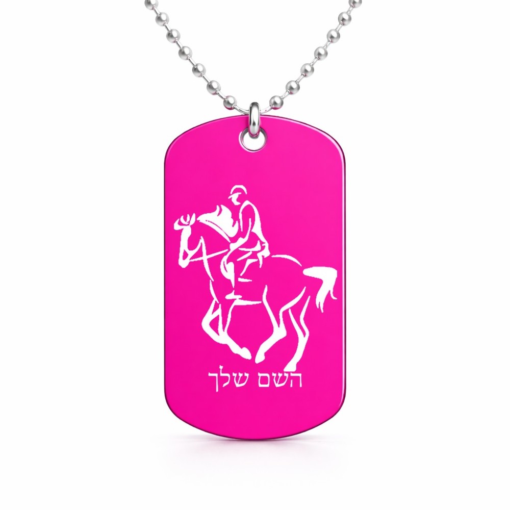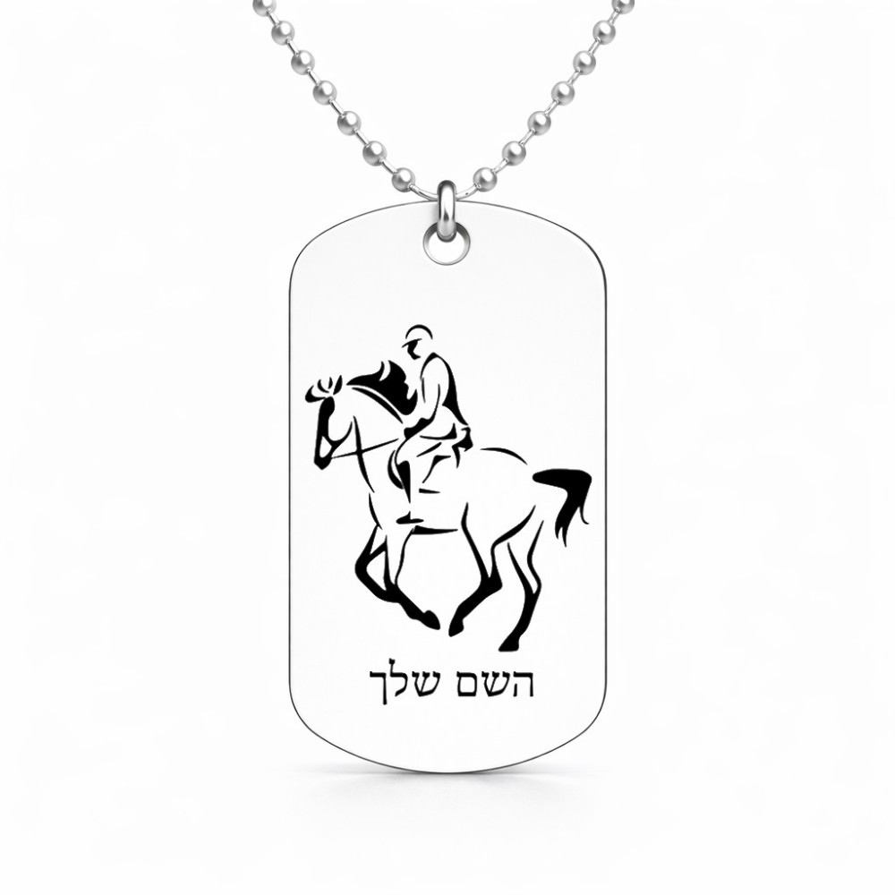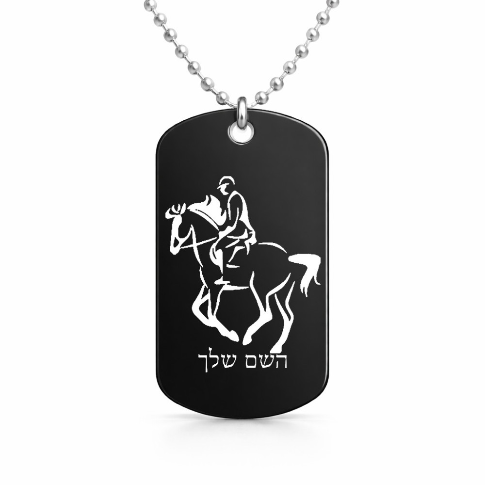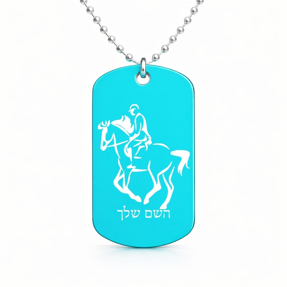 שרשרת דיסקיט מאלומיניום בעיצוב אישי עם השם שלך בעיצוב רוכב סוסים 2 גודל הדיסקיט 2.9 × 5 ס"מ. את השם המבוקש ניתן לציין בהזמנה, אם לא צויין אנחנו ניצור קשר לבירור.