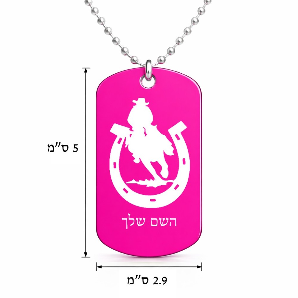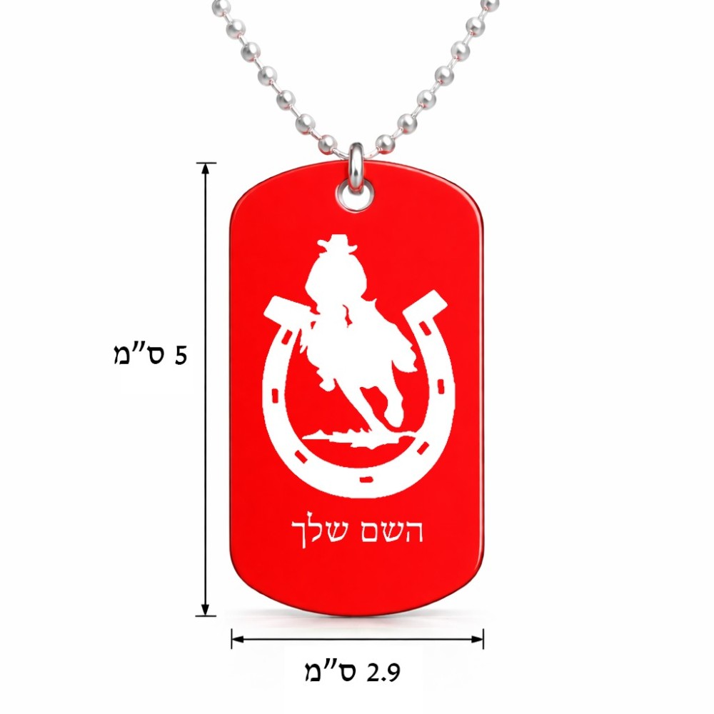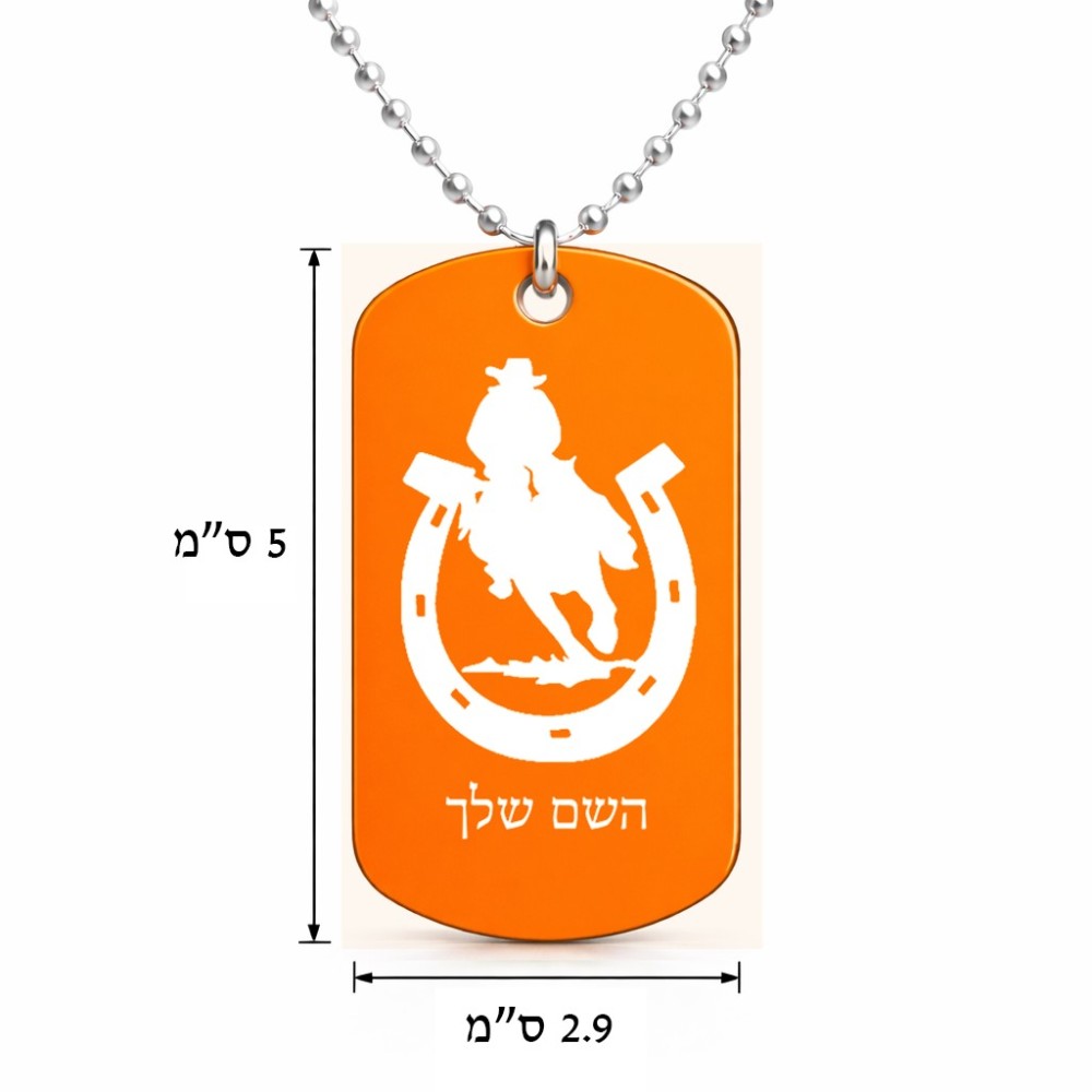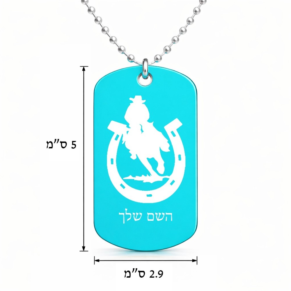 שרשרת דיסקיט מאלומיניום בעיצוב אישי עם השם שלך בעיצוב פרסה וסוס גודל הדיסקיט 2.9 × 5 ס"מ. את השם המבוקש ניתן לציין בהזמנה, אם לא צויין אנחנו ניצור קשר לבירור.