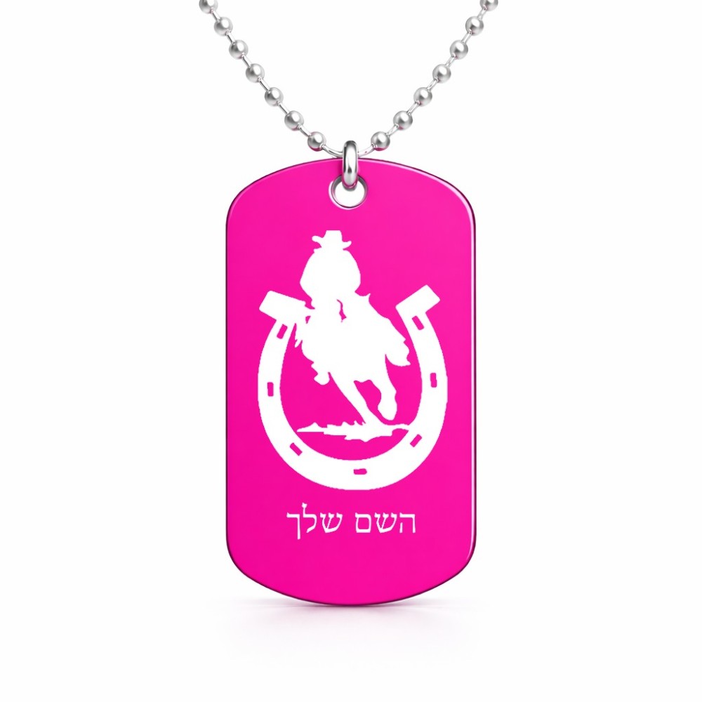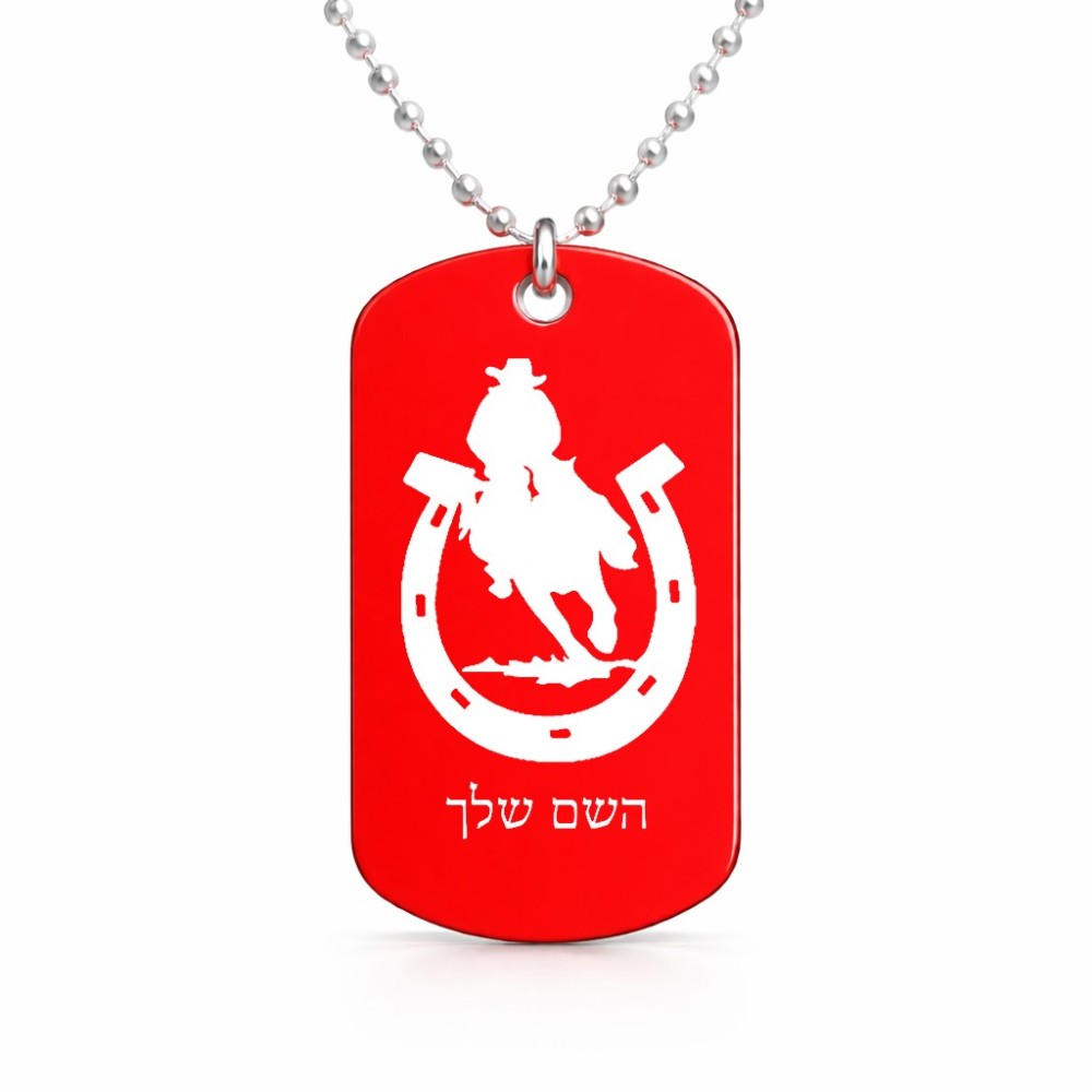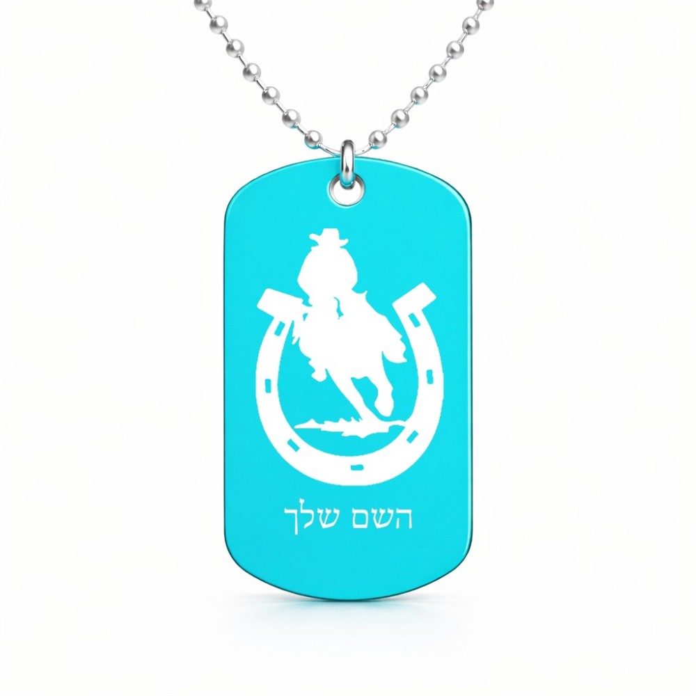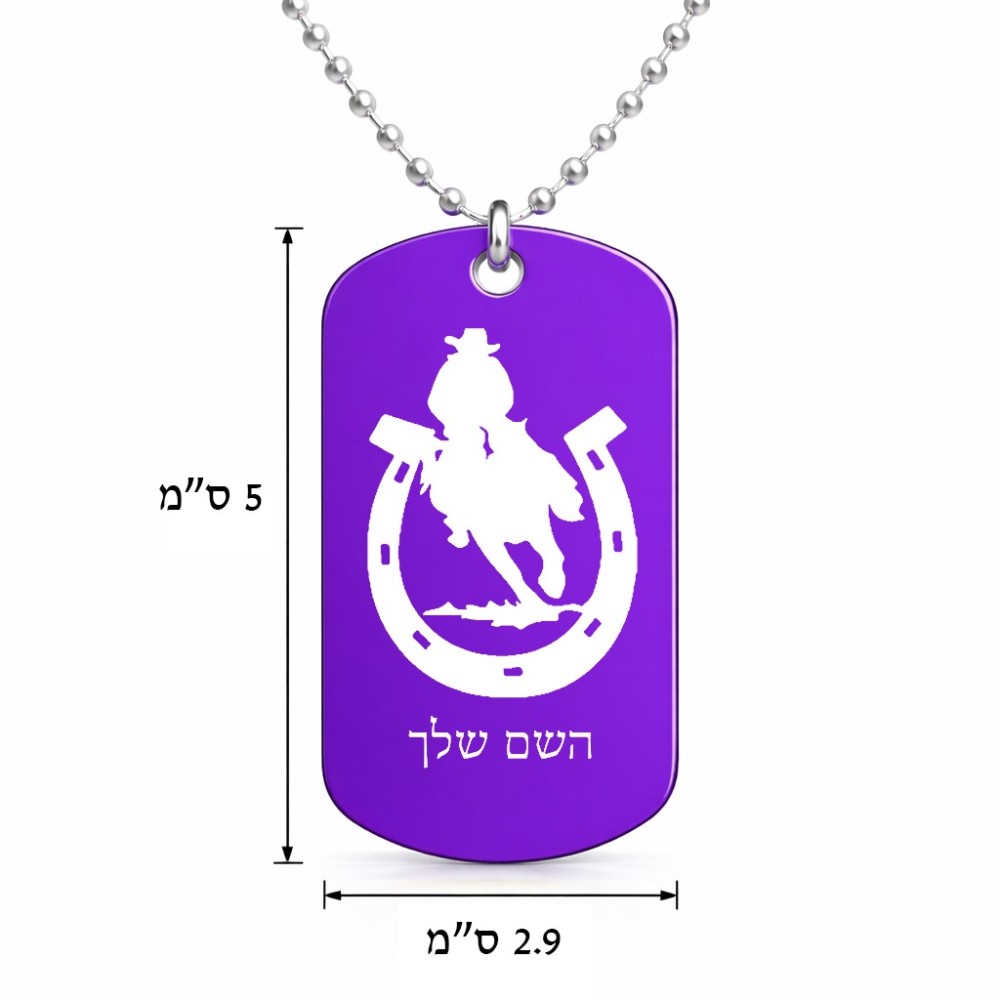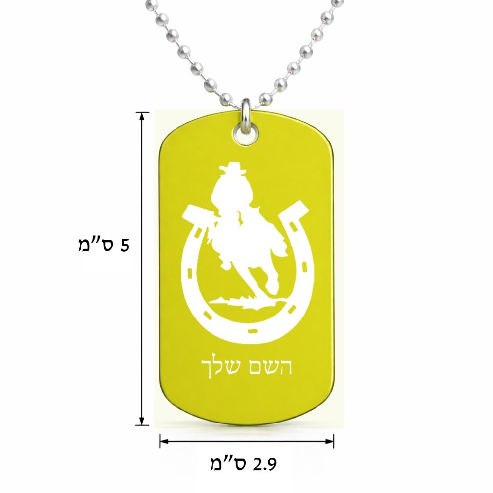 שרשרת דיסקיט מאלומיניום בעיצוב אישי עם השם שלך בעיצוב פרסה וסוס גודל הדיסקיט 2.9 × 5 ס"מ. את השם המבוקש ניתן לציין בהזמנה, אם לא צויין אנחנו ניצור קשר לבירור.
