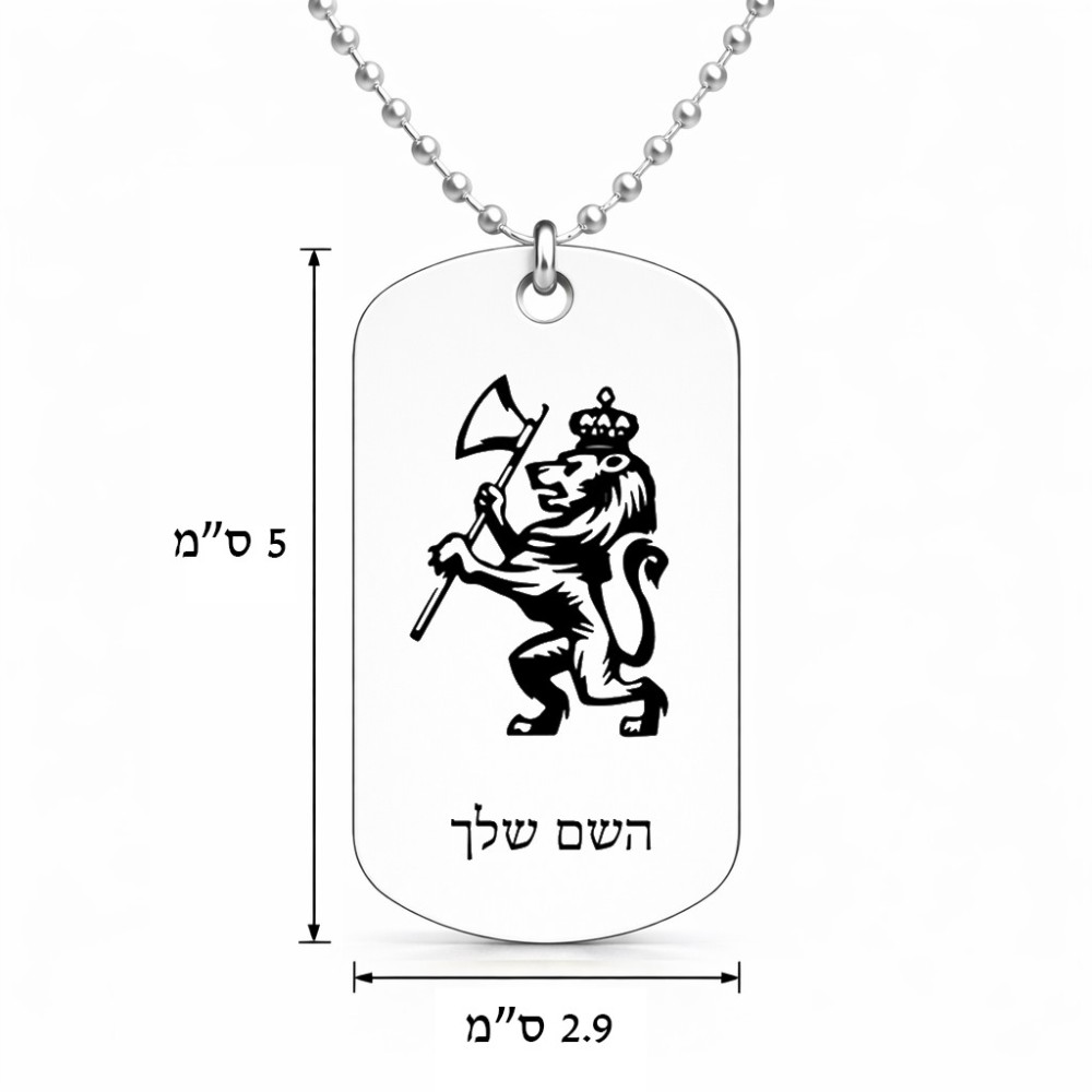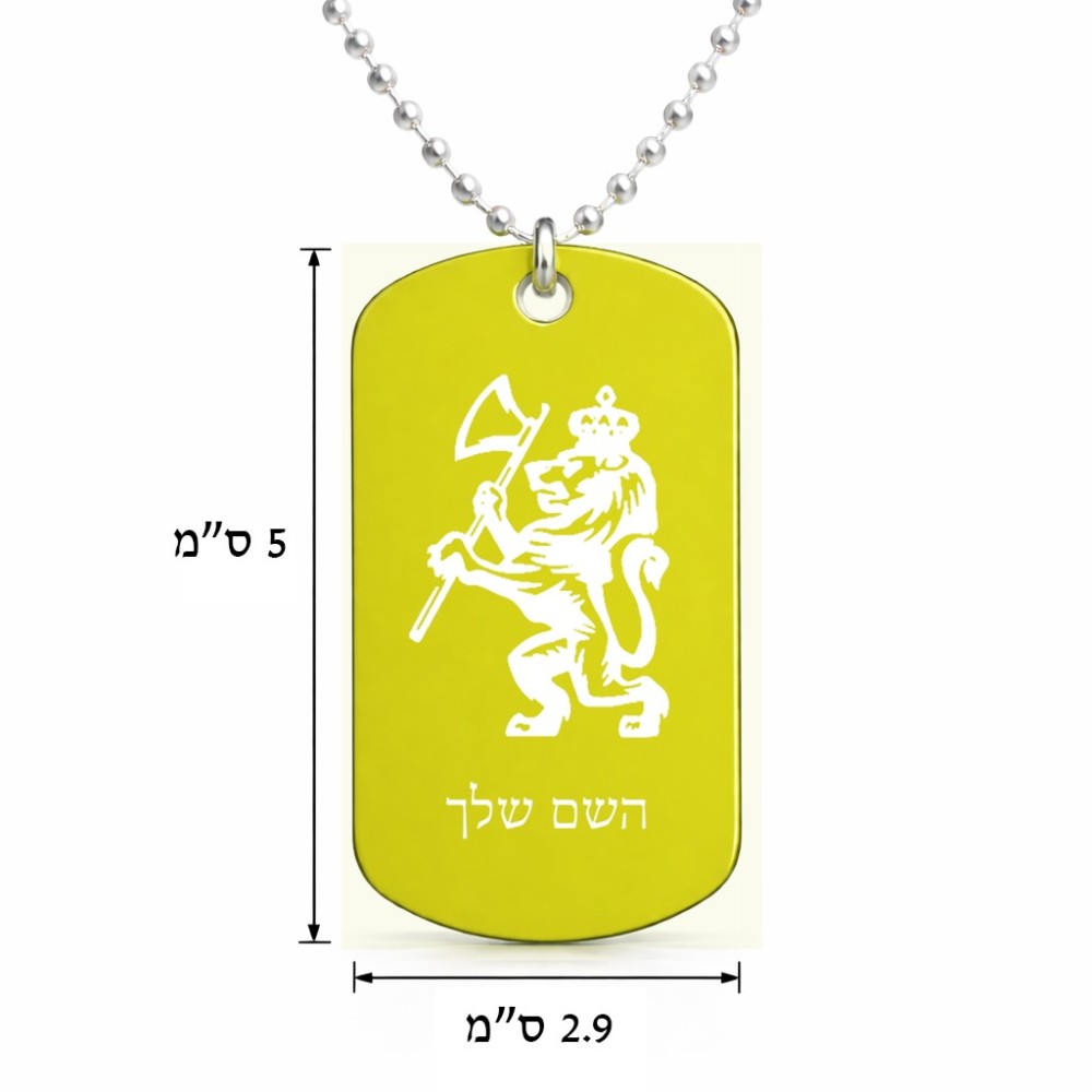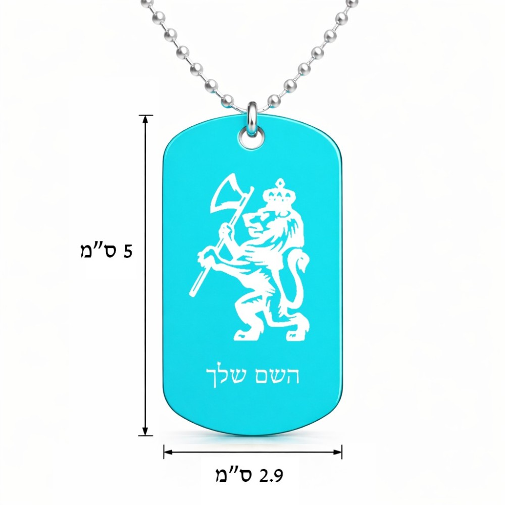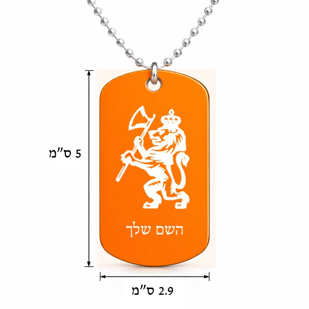 שרשרת דיסקיט מאלומיניום בעיצוב אישי עם השם שלך בעיצוב אריה גודל הדיסקיט 2.9 × 5 ס"מ. את השם המבוקש ניתן לציין בהזמנה, אם לא צויין אנחנו ניצור קשר לבירור.