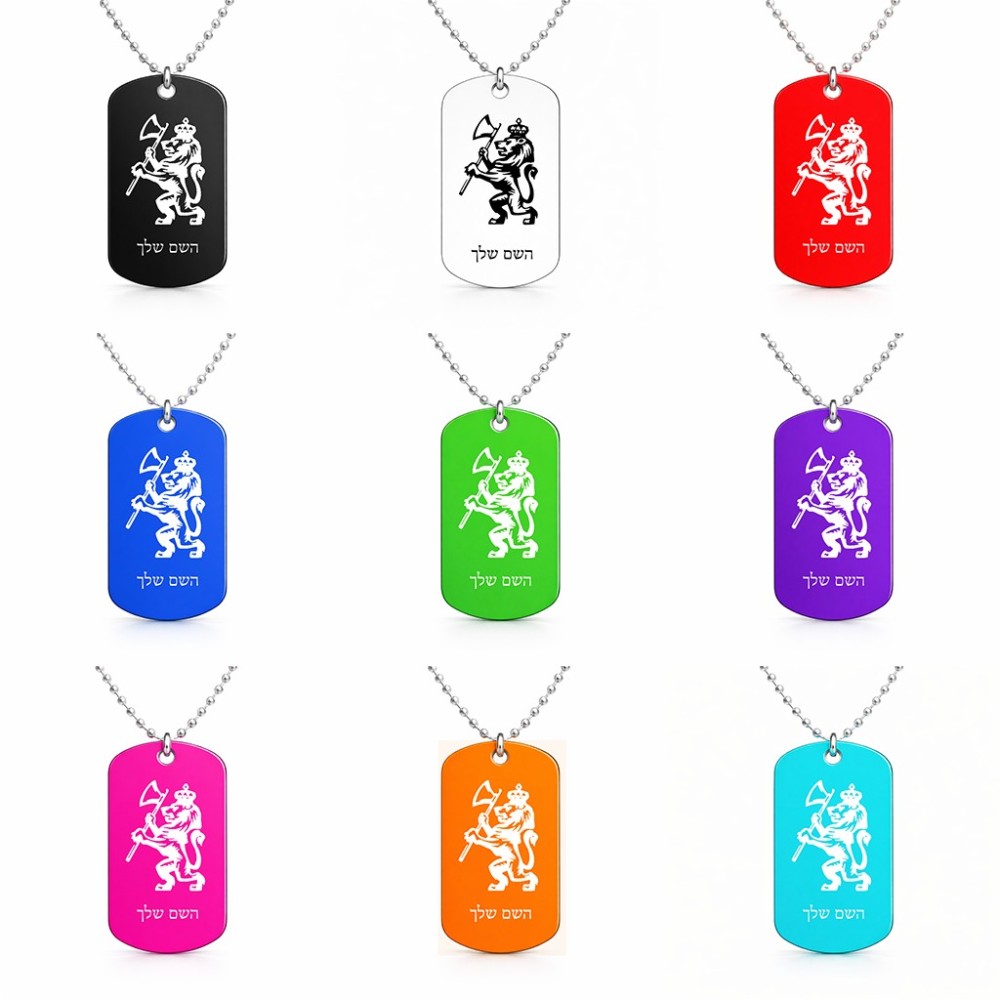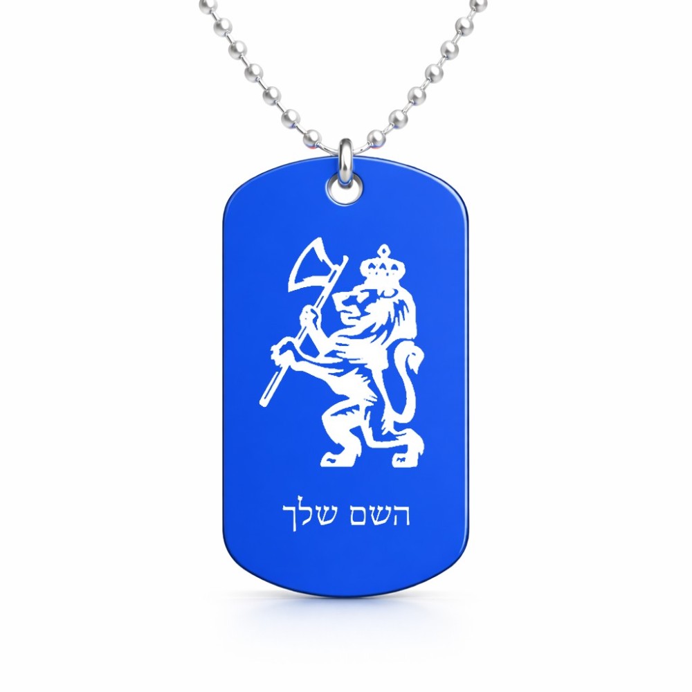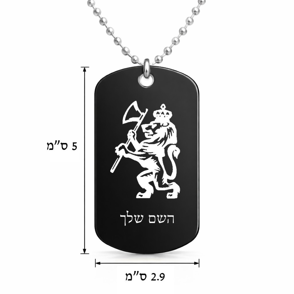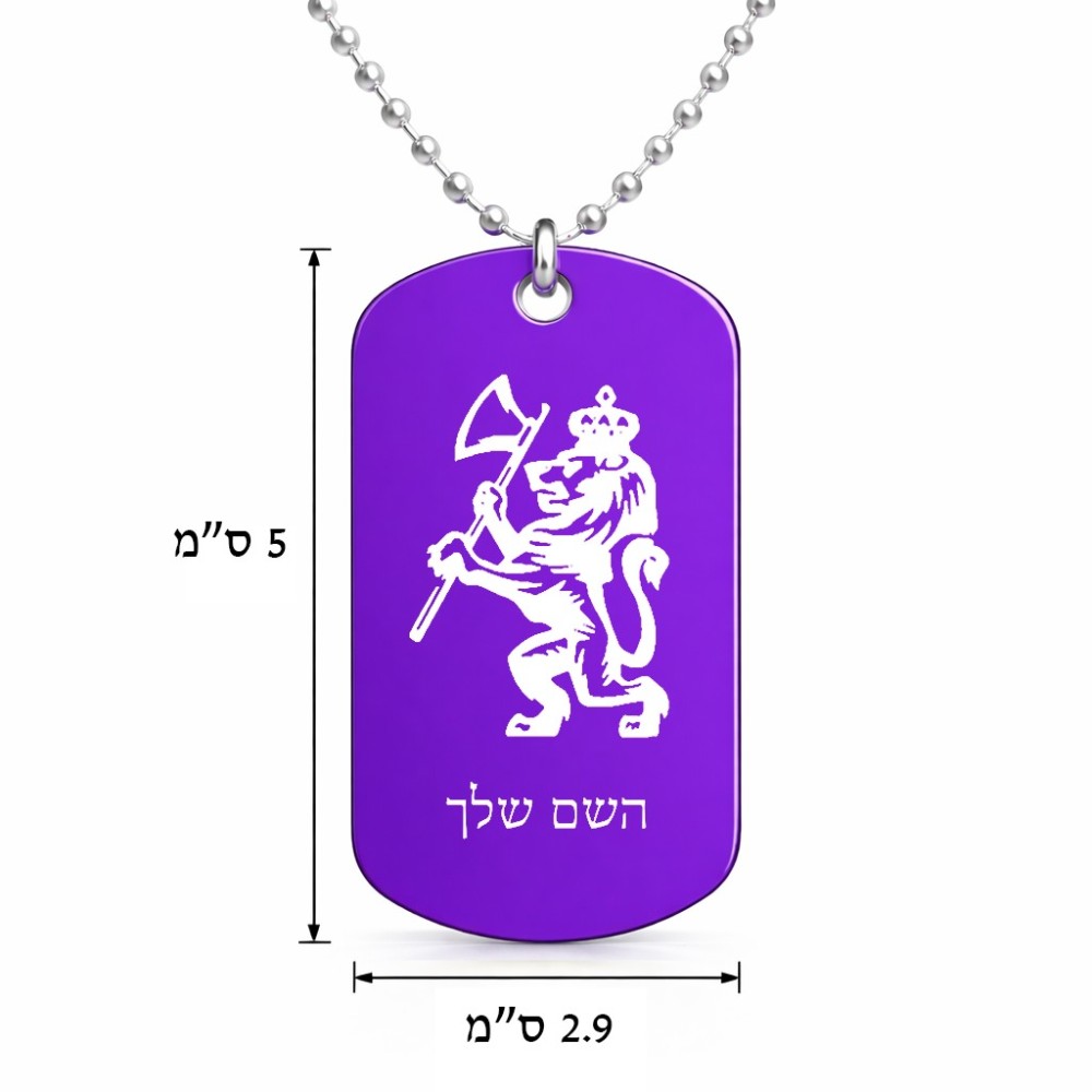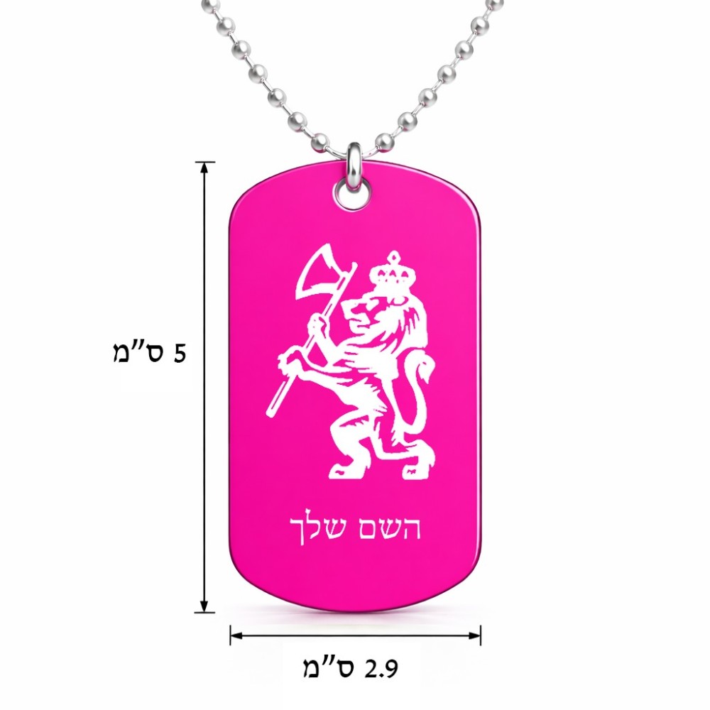 שרשרת דיסקיט מאלומיניום בעיצוב אישי עם השם שלך בעיצוב אריה גודל הדיסקיט 2.9 × 5 ס"מ. את השם המבוקש ניתן לציין בהזמנה, אם לא צויין אנחנו ניצור קשר לבירור.