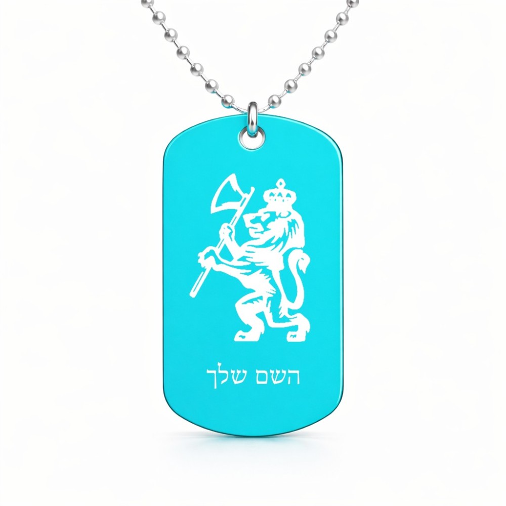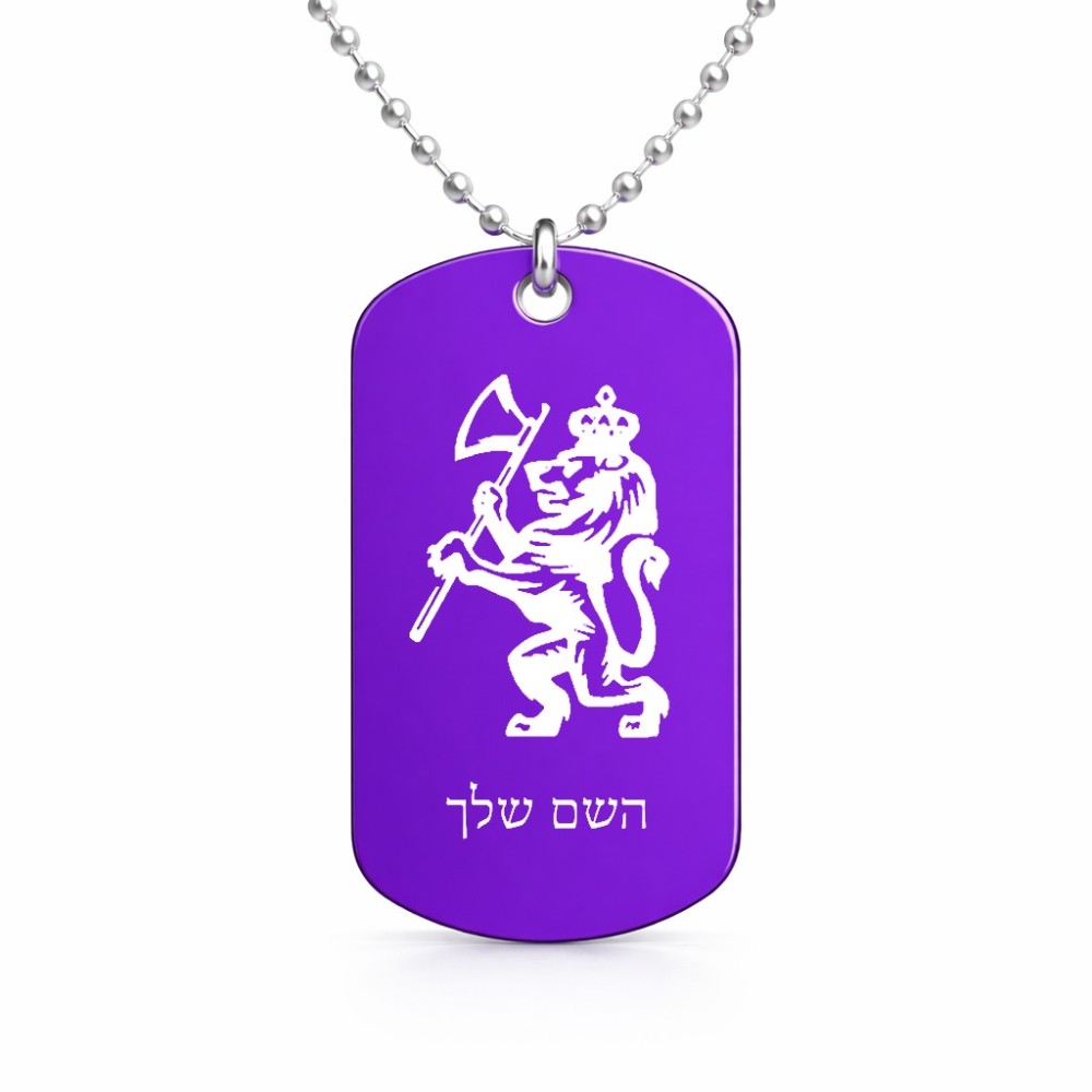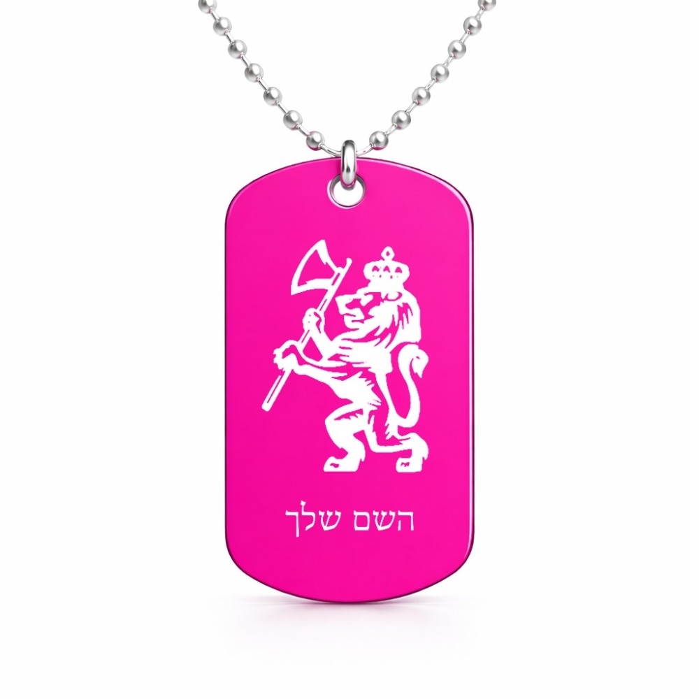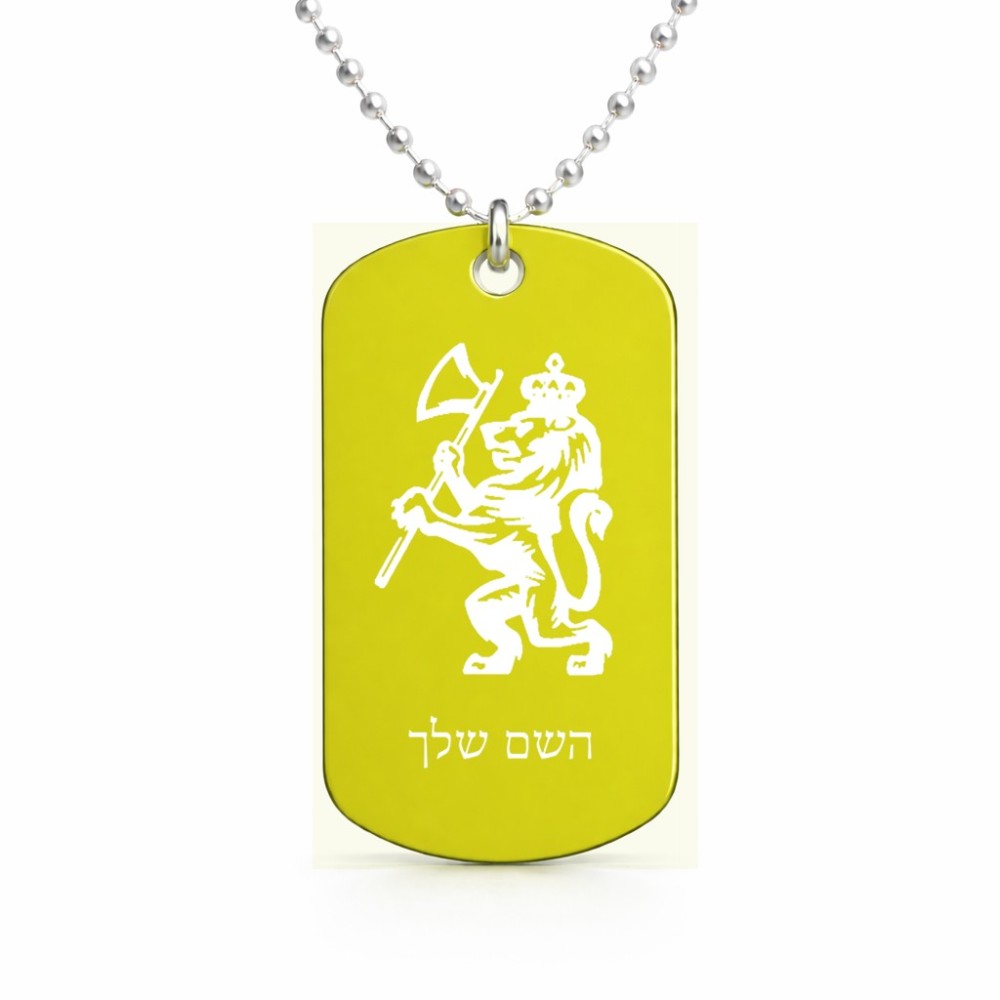 שרשרת דיסקיט מאלומיניום בעיצוב אישי עם השם שלך בעיצוב אריה גודל הדיסקיט 2.9 × 5 ס"מ. את השם המבוקש ניתן לציין בהזמנה, אם לא צויין אנחנו ניצור קשר לבירור.