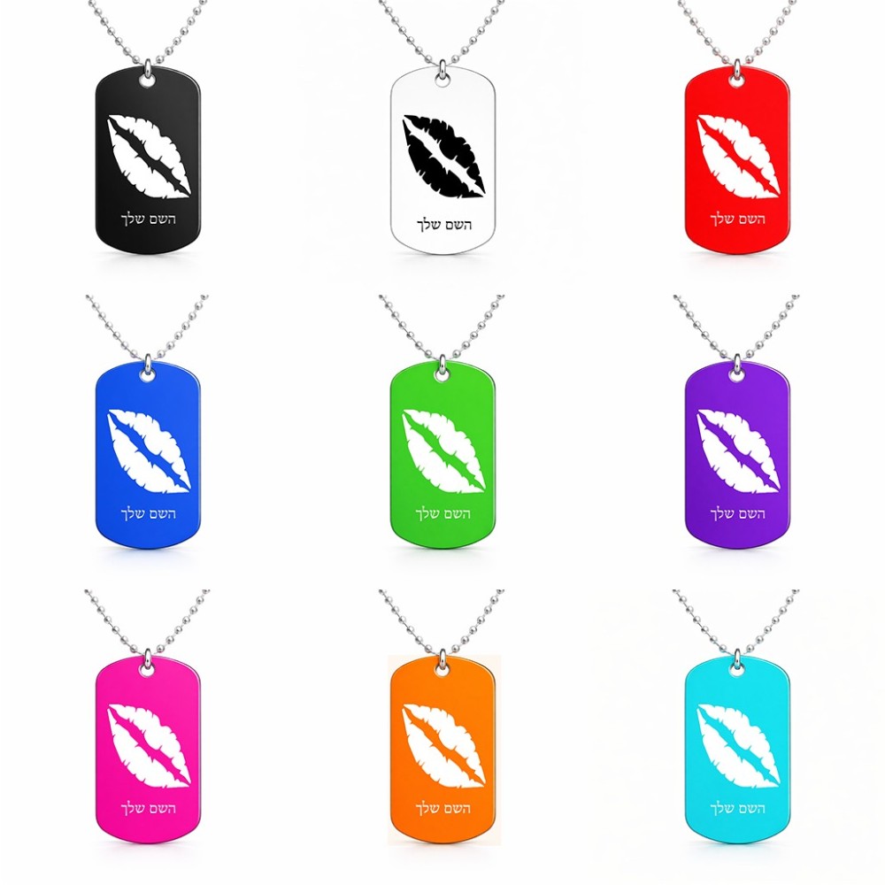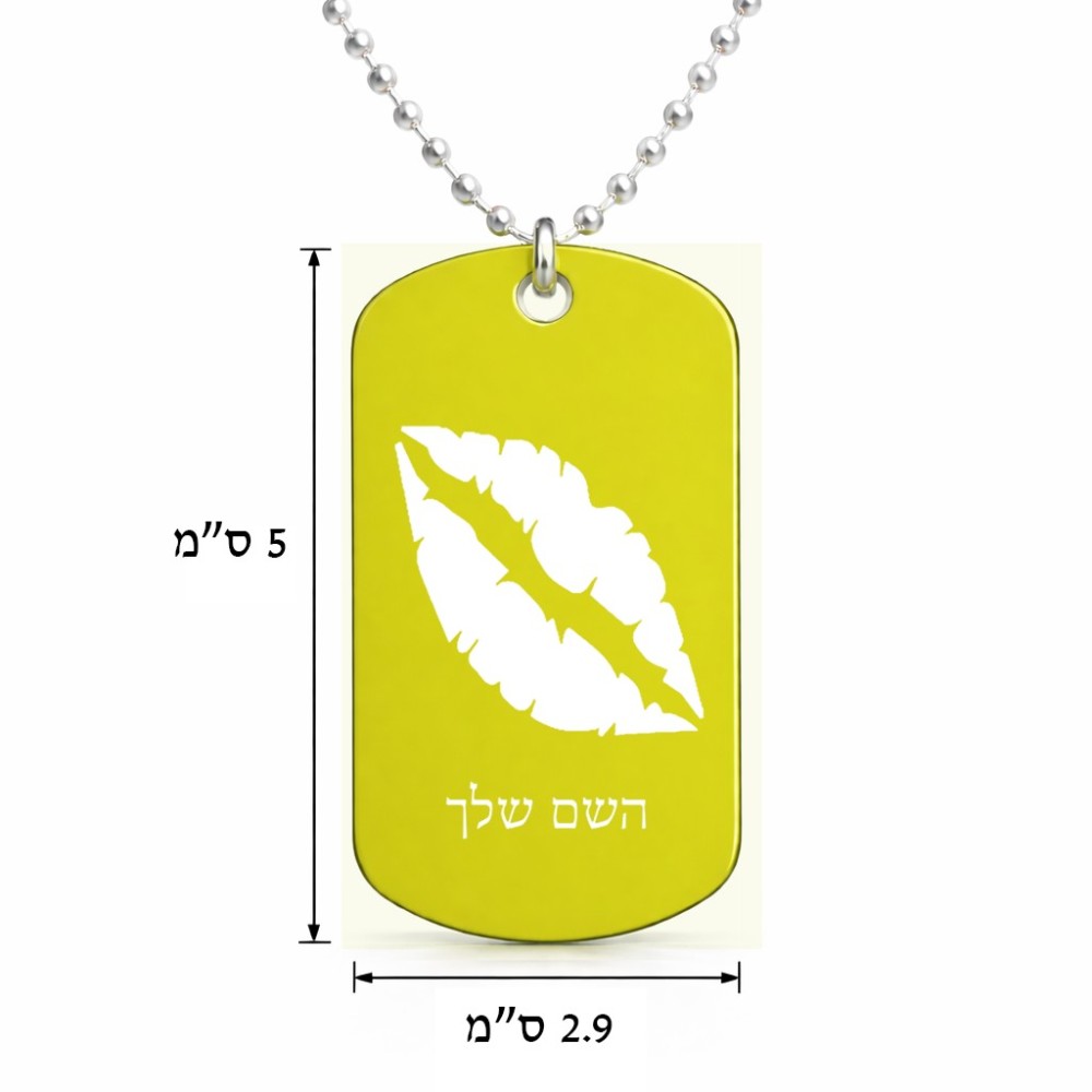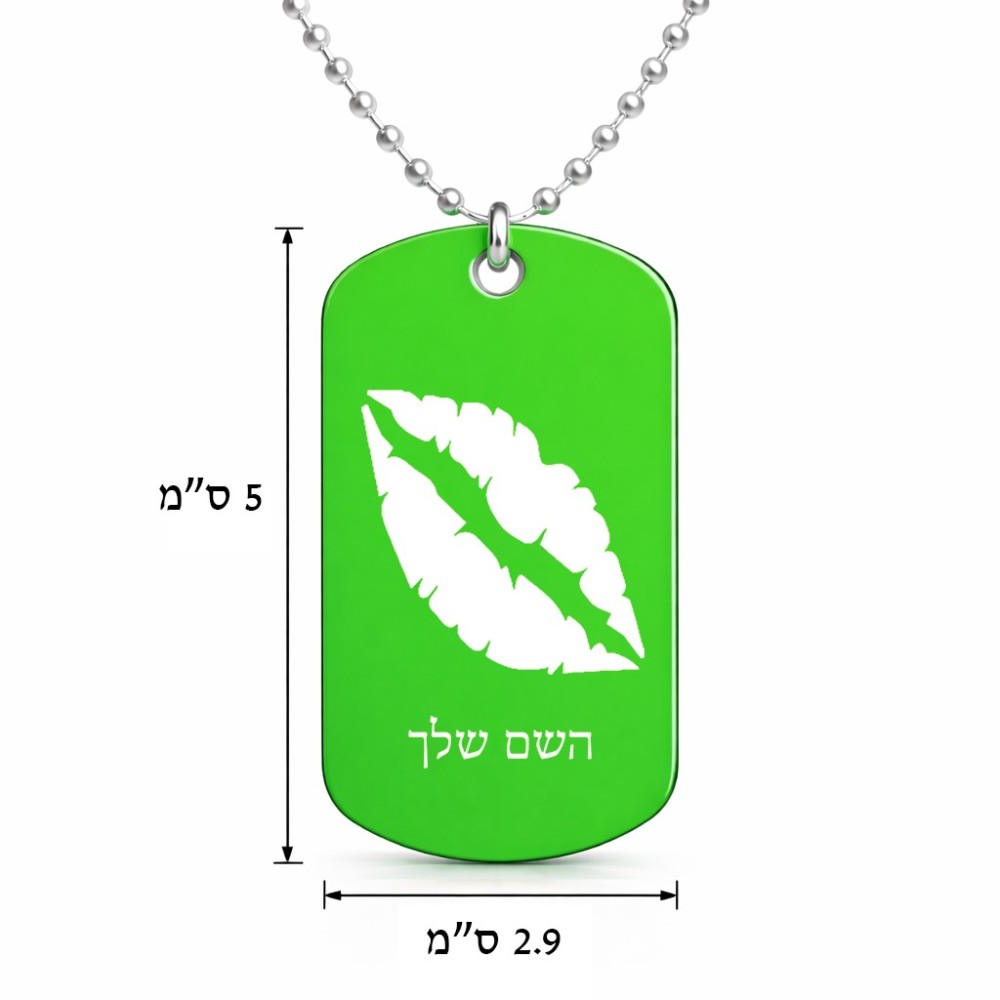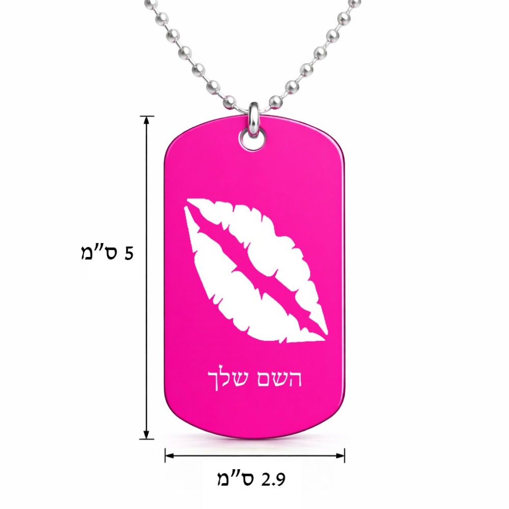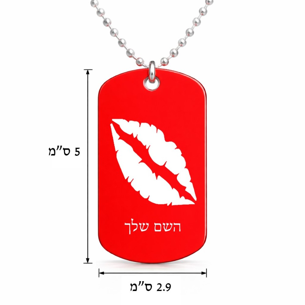 שרשרת דיסקיט מאלומיניום בעיצוב אישי עם השם שלך בעיצוב שפתיים - נשיקה גודל הדיסקיט 2.9 × 5 ס"מ. את השם המבוקש ניתן לציין בהזמנה, אם לא צויין אנחנו ניצור קשר לבירור.