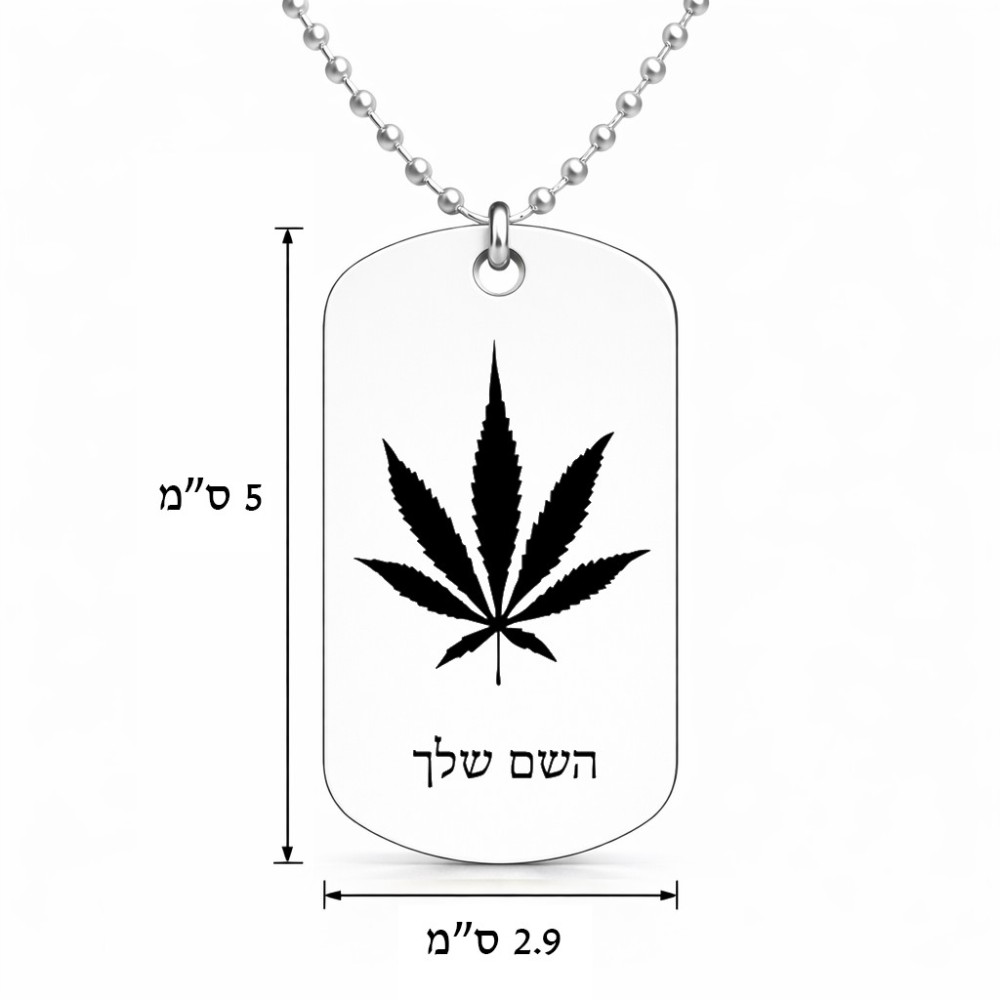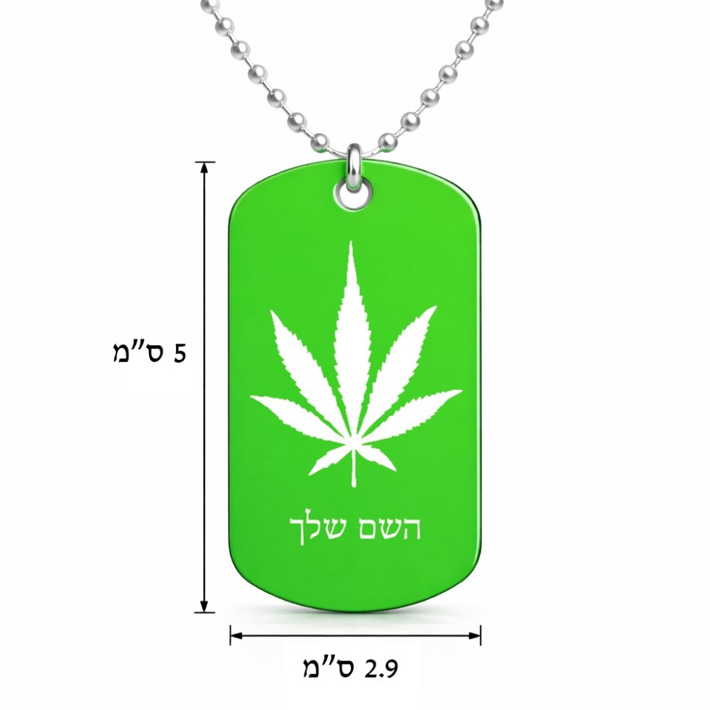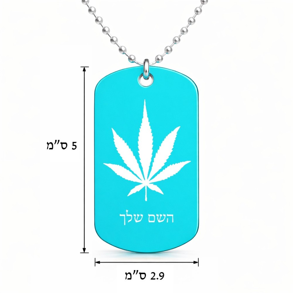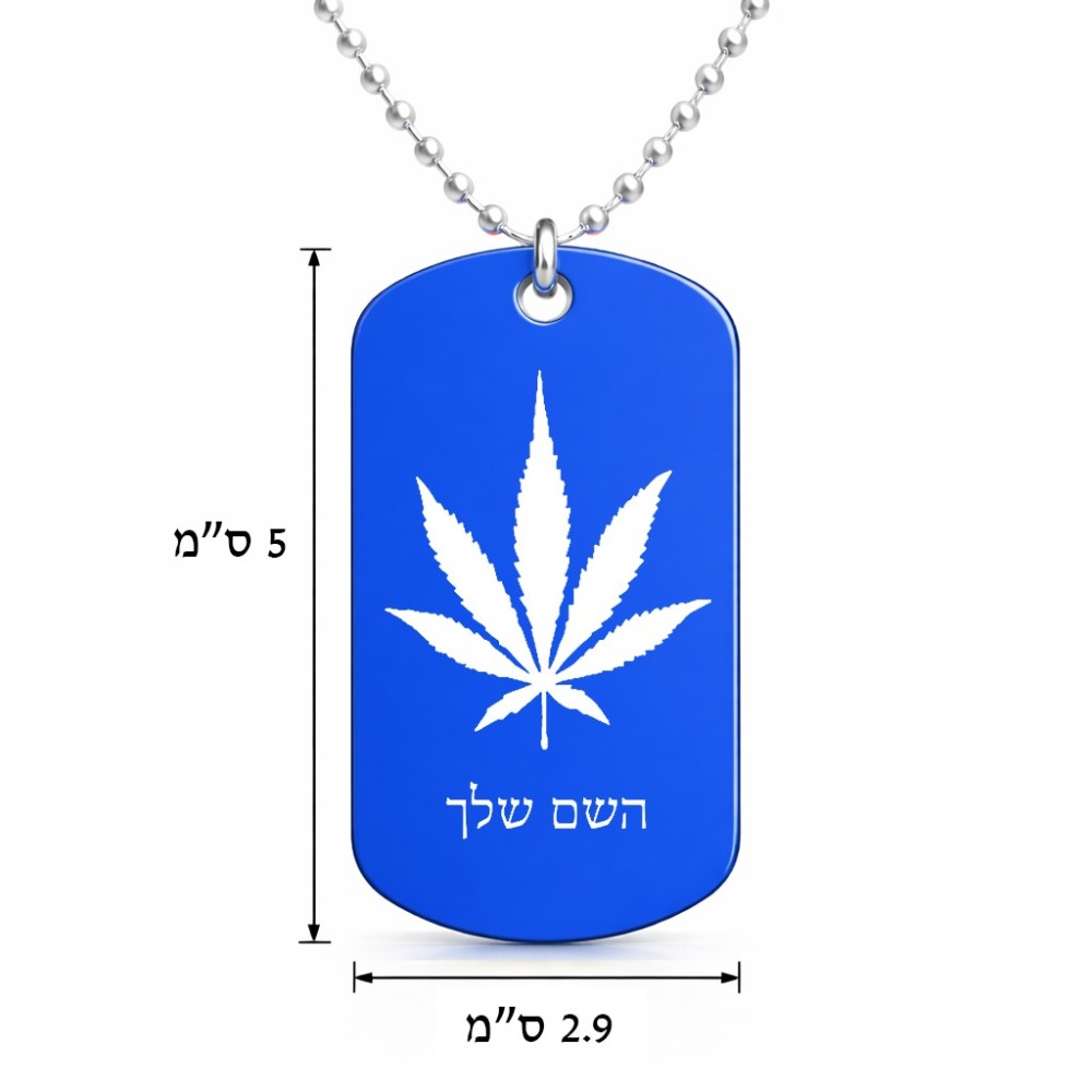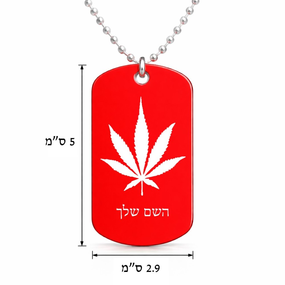 שרשרת דיסקיט מאלומיניום בעיצוב אישי עם השם שלך בעיצוב עלה מריחואנה - גראס גודל הדיסקיט 2.9 × 5 ס"מ. את השם המבוקש ניתן לציין בהזמנה, אם לא צויין אנחנו ניצור קשר לבירור.