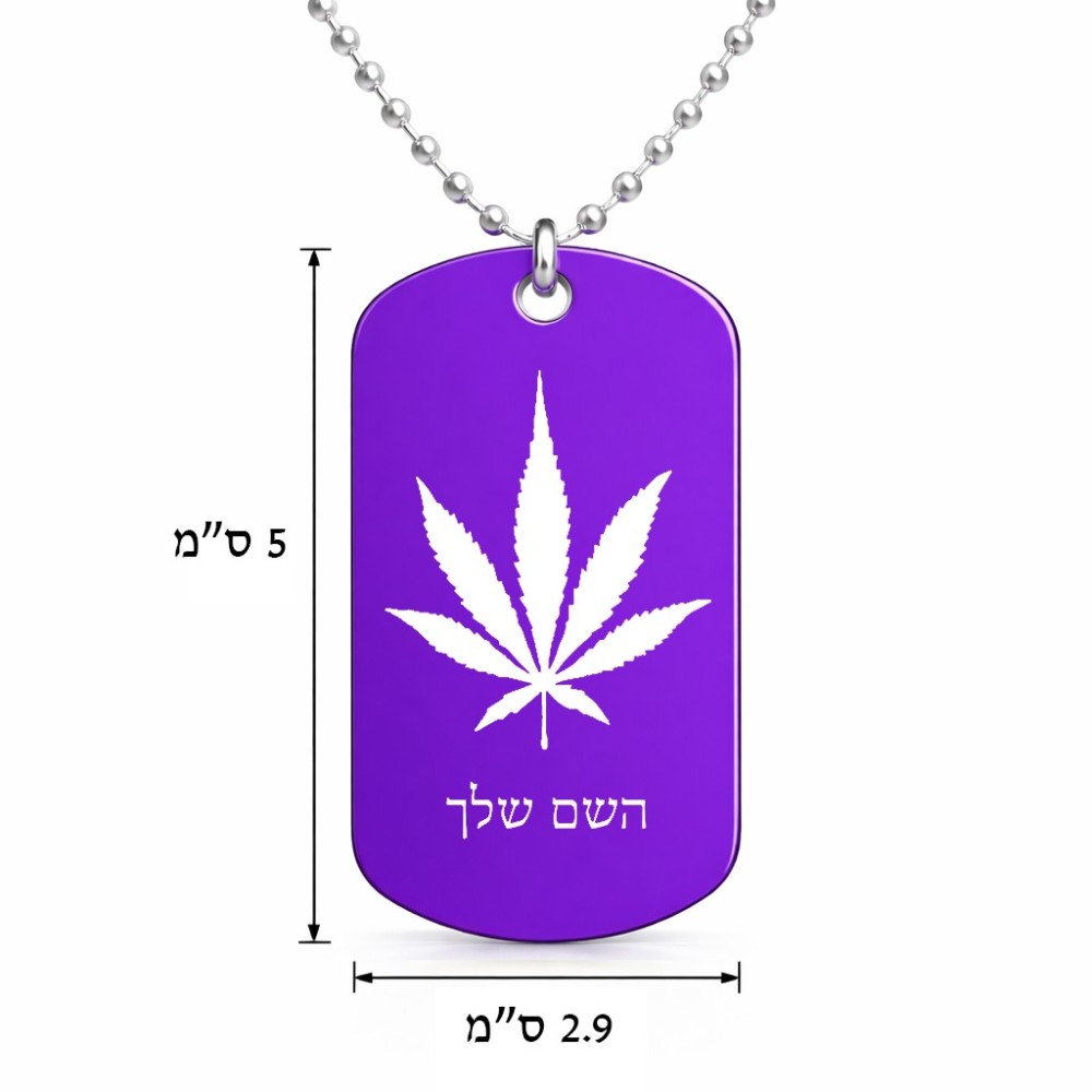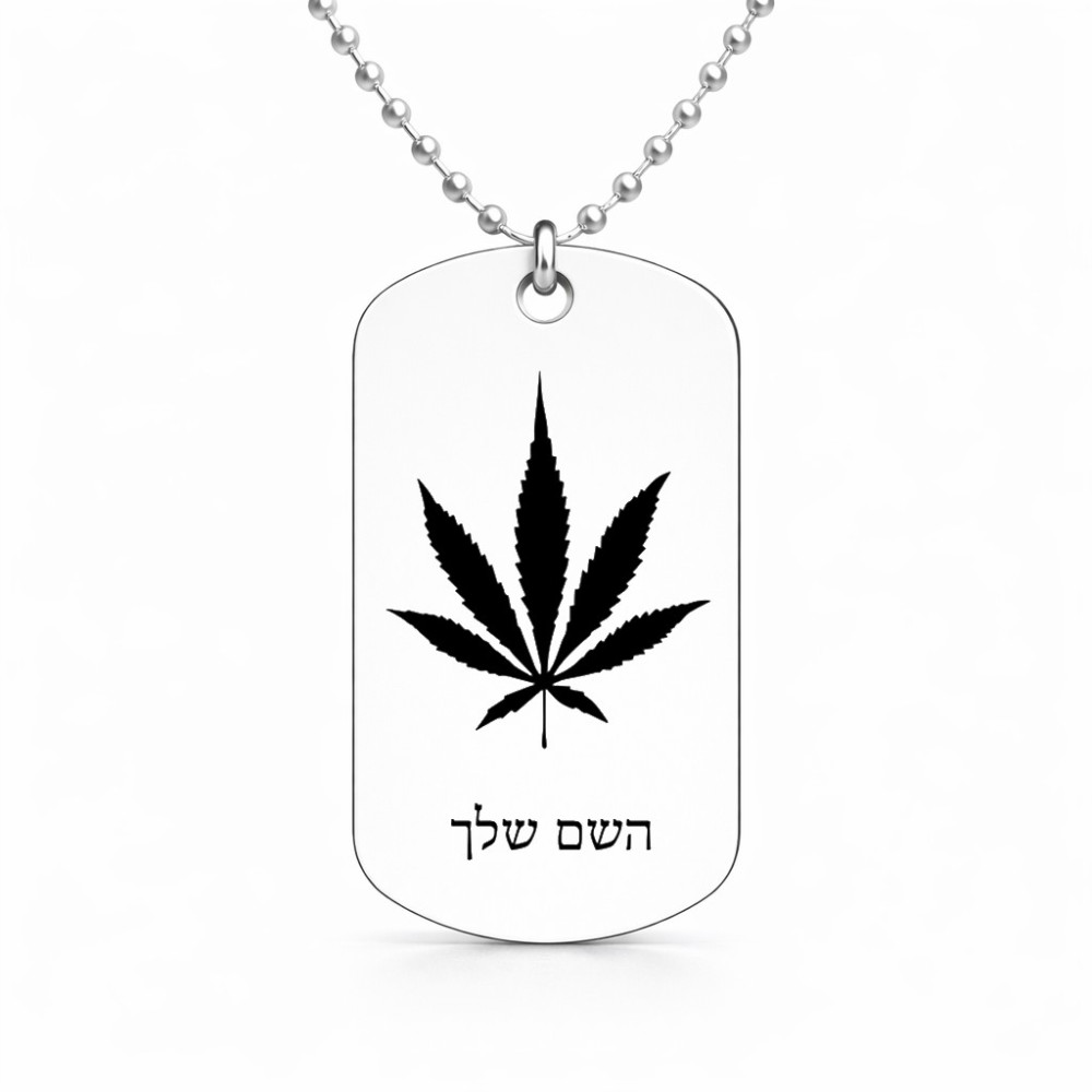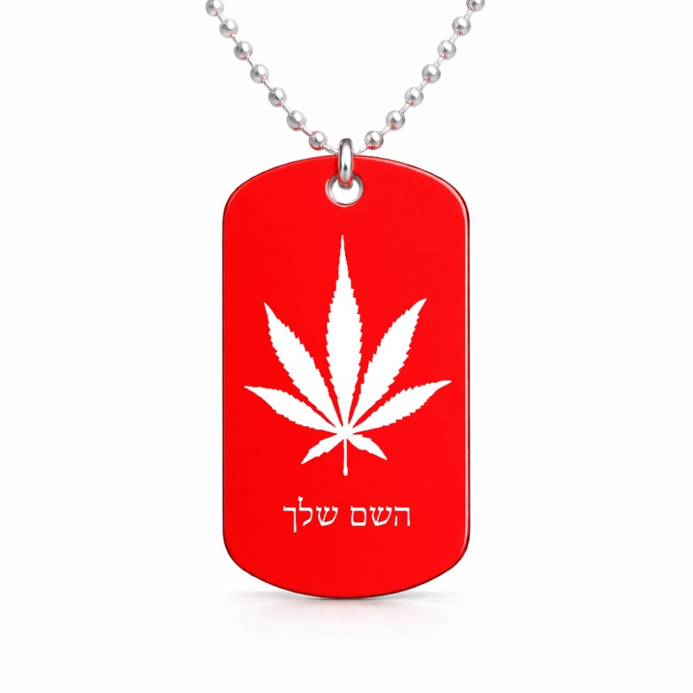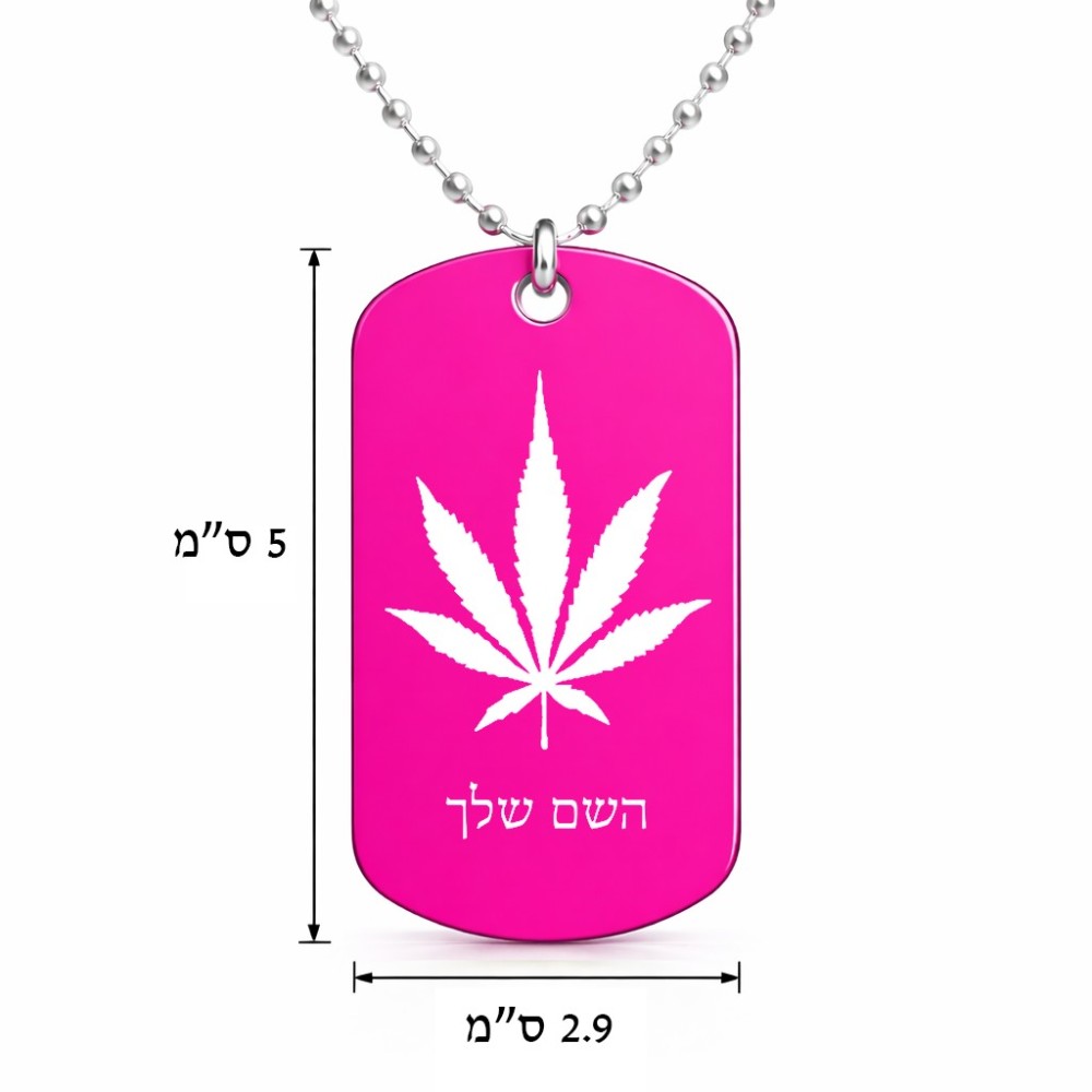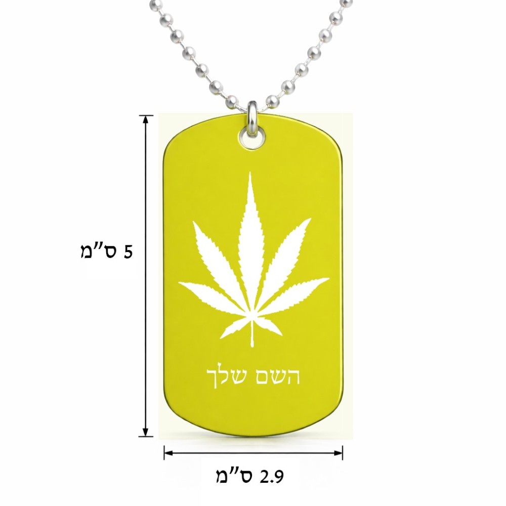 שרשרת דיסקיט מאלומיניום בעיצוב אישי עם השם שלך בעיצוב עלה מריחואנה - גראס גודל הדיסקיט 2.9 × 5 ס"מ. את השם המבוקש ניתן לציין בהזמנה, אם לא צויין אנחנו ניצור קשר לבירור.