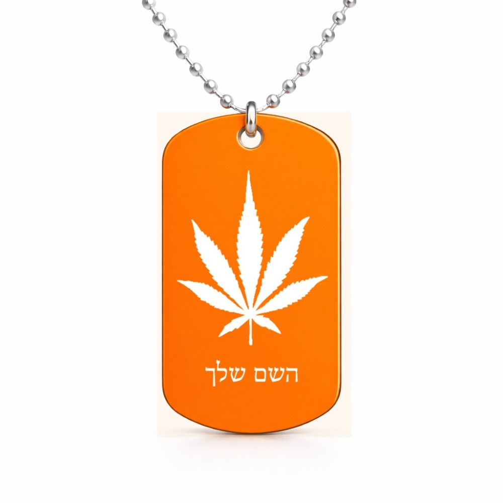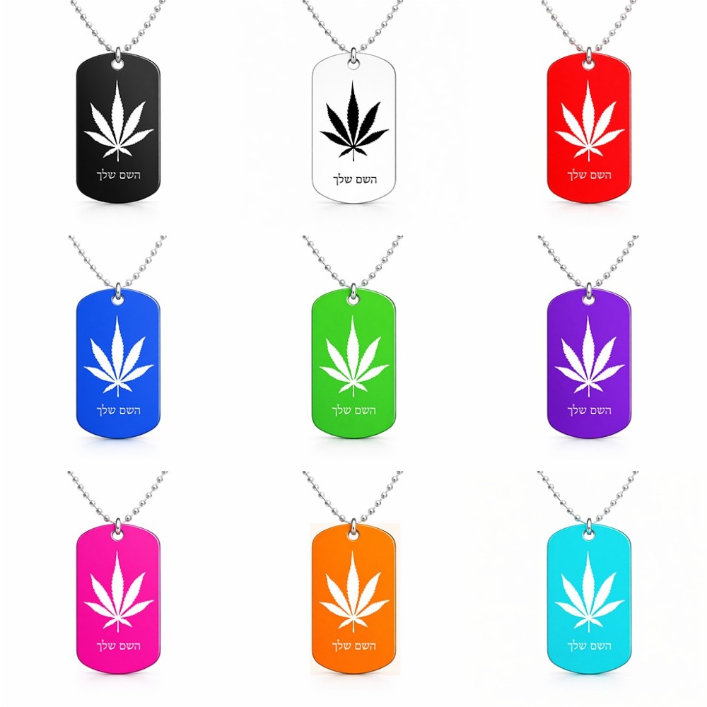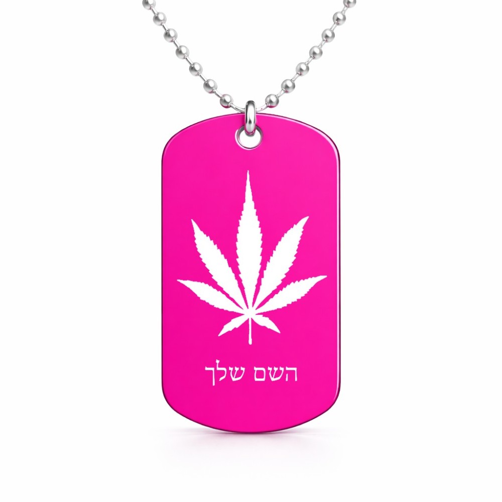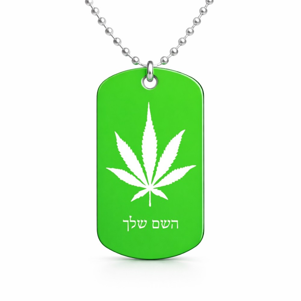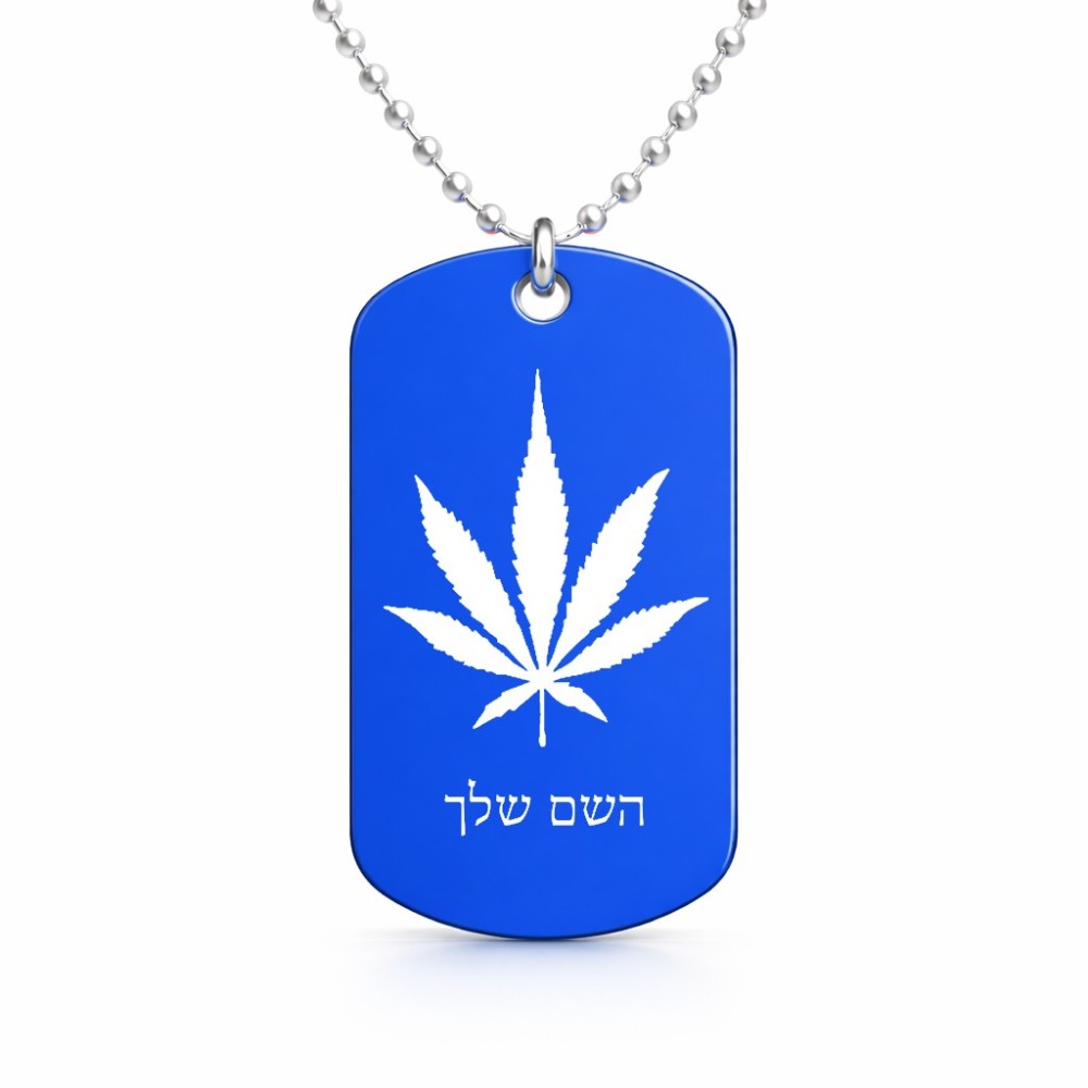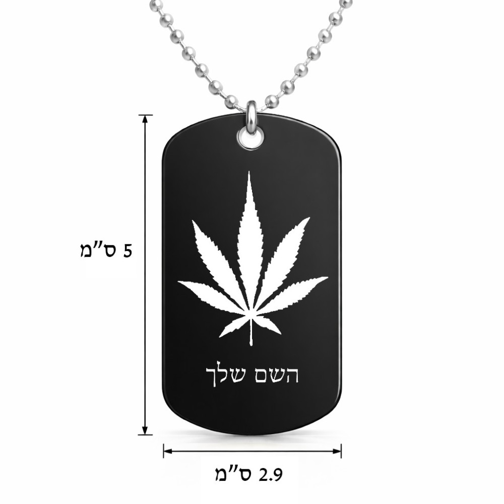 שרשרת דיסקיט מאלומיניום בעיצוב אישי עם השם שלך בעיצוב עלה מריחואנה - גראס גודל הדיסקיט 2.9 × 5 ס"מ. את השם המבוקש ניתן לציין בהזמנה, אם לא צויין אנחנו ניצור קשר לבירור.