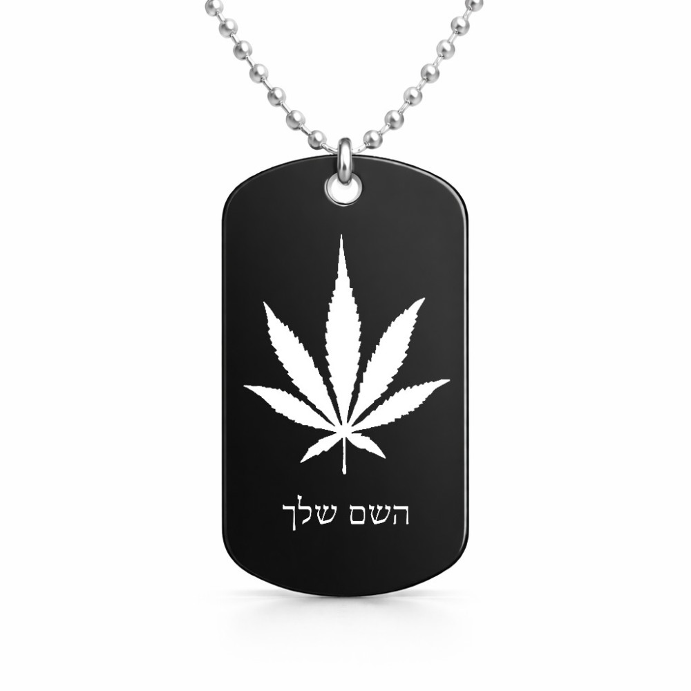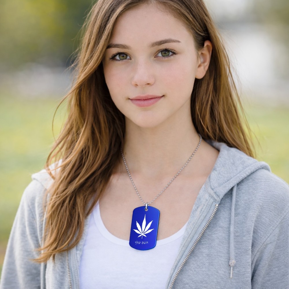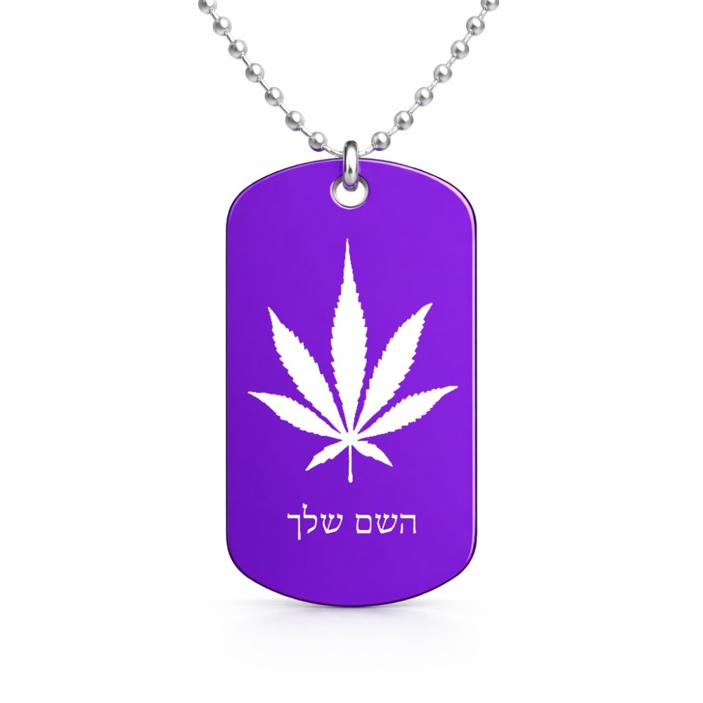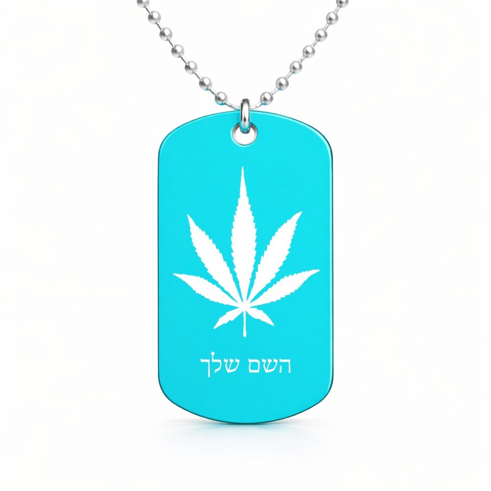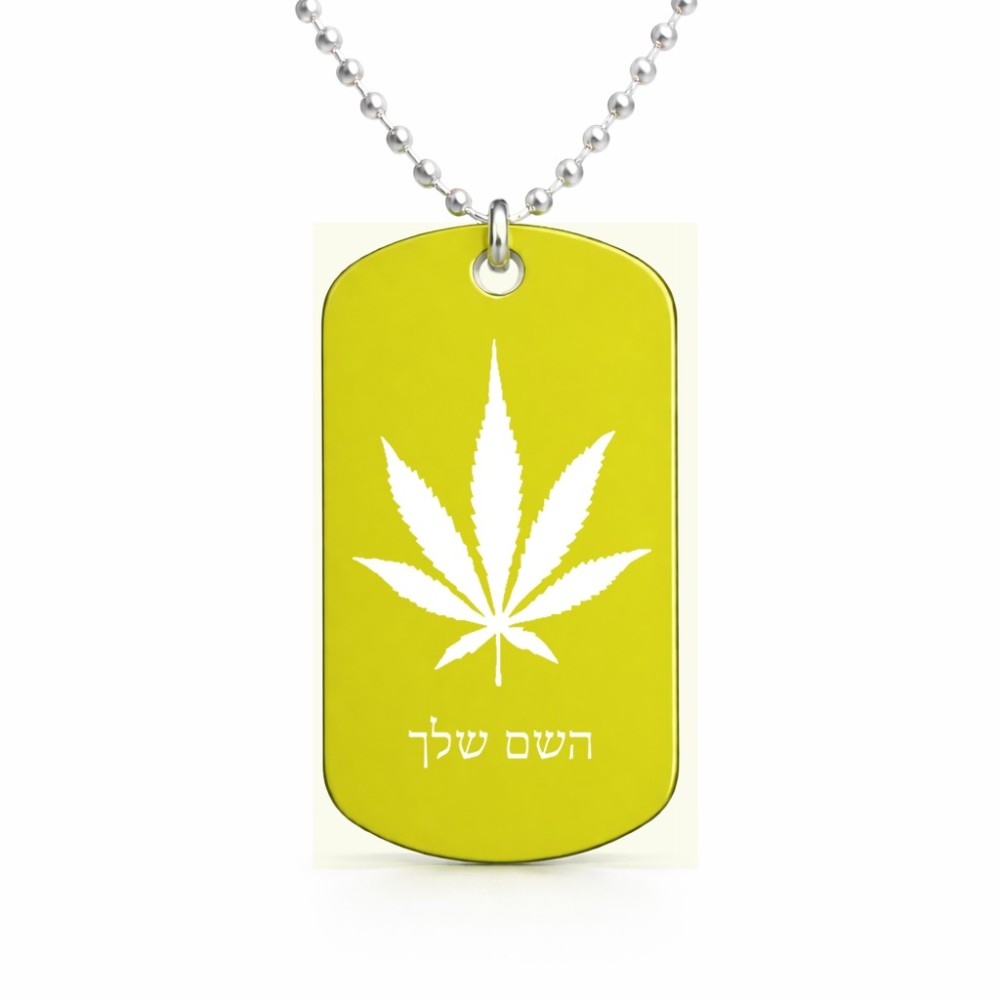 שרשרת דיסקיט מאלומיניום בעיצוב אישי עם השם שלך בעיצוב עלה מריחואנה - גראס גודל הדיסקיט 2.9 × 5 ס"מ. את השם המבוקש ניתן לציין בהזמנה, אם לא צויין אנחנו ניצור קשר לבירור.