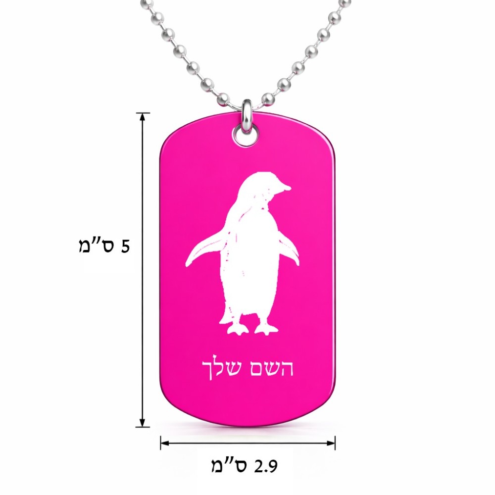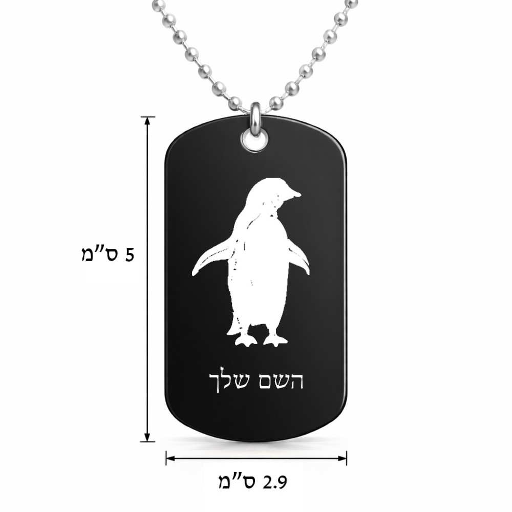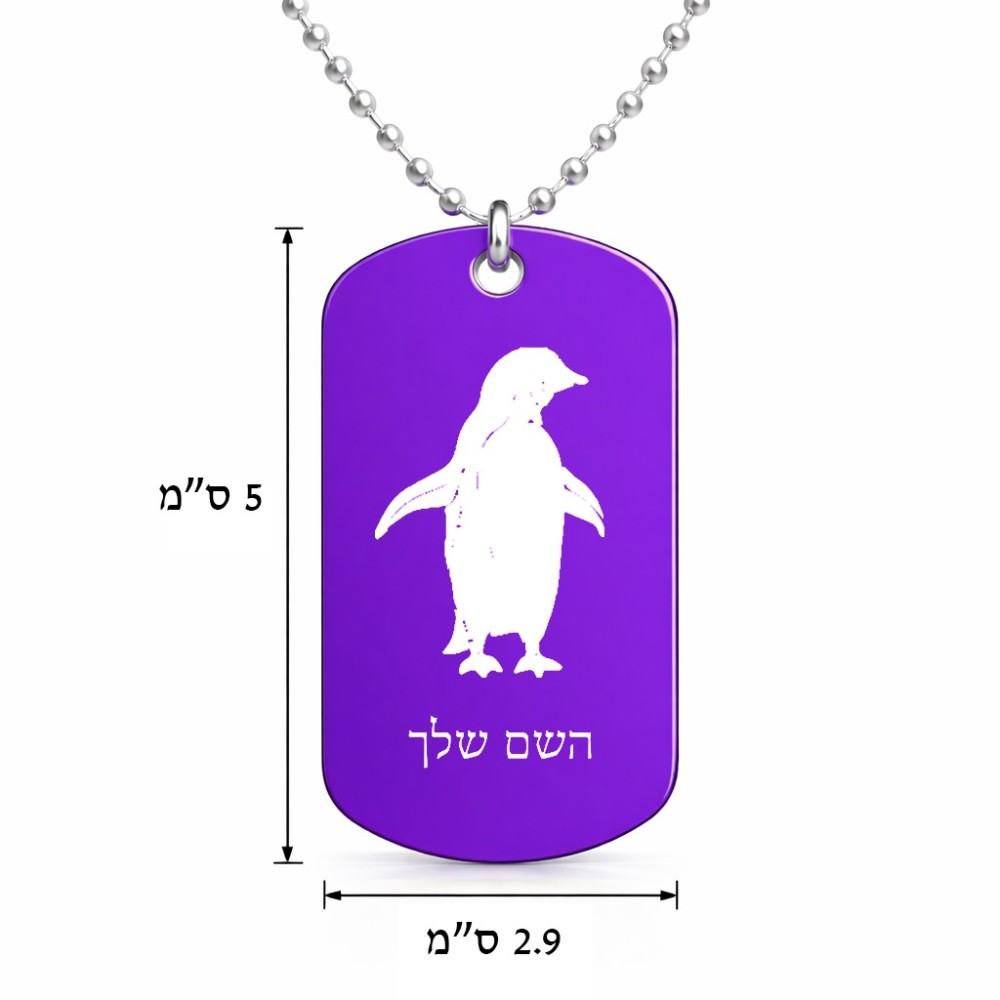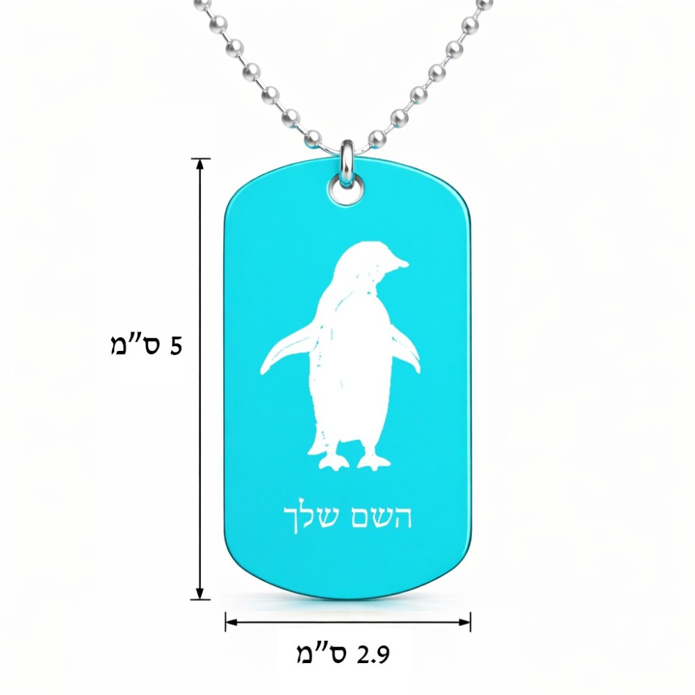 שרשרת דיסקיט מאלומיניום בעיצוב אישי עם השם שלך בעיצוב פינגווין גודל הדיסקיט 2.9 × 5 ס"מ. את השם המבוקש ניתן לציין בהזמנה, אם לא צויין אנחנו ניצור קשר לבירור.