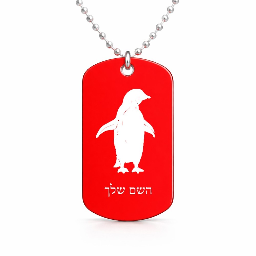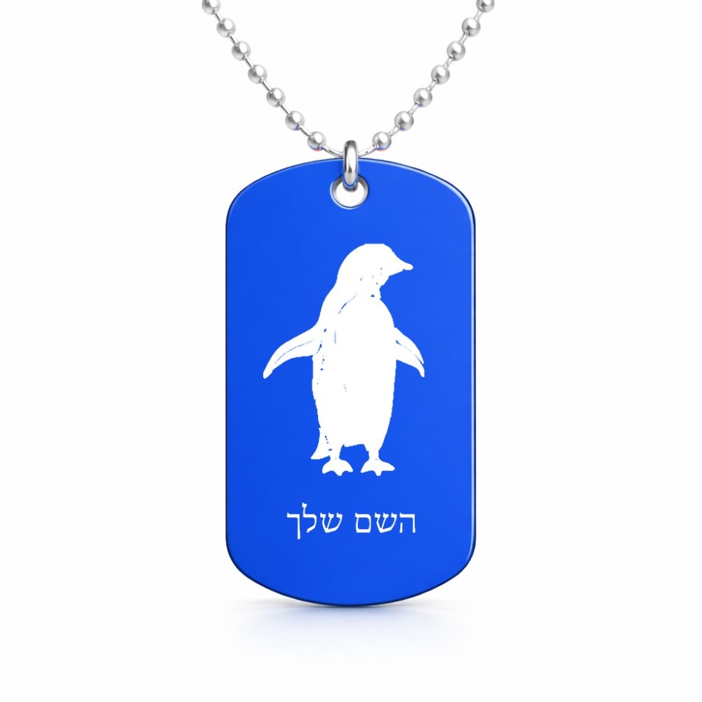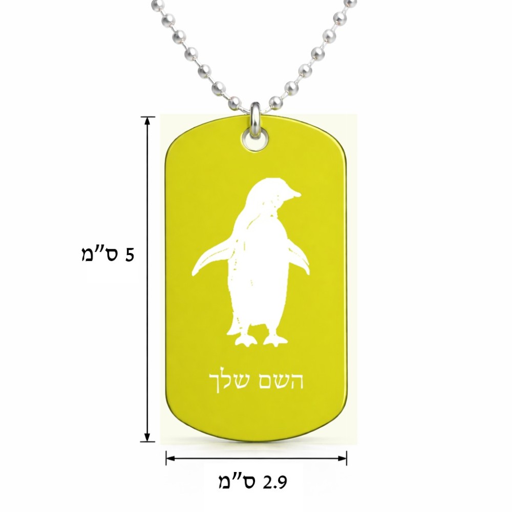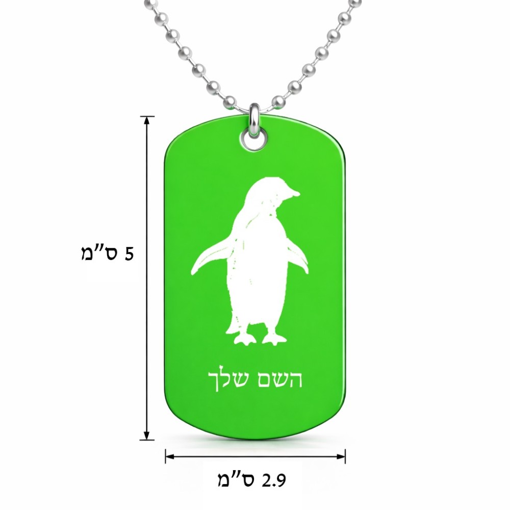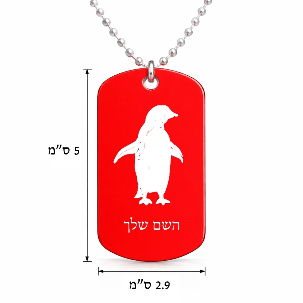 שרשרת דיסקיט מאלומיניום בעיצוב אישי עם השם שלך בעיצוב פינגווין גודל הדיסקיט 2.9 × 5 ס"מ. את השם המבוקש ניתן לציין בהזמנה, אם לא צויין אנחנו ניצור קשר לבירור.