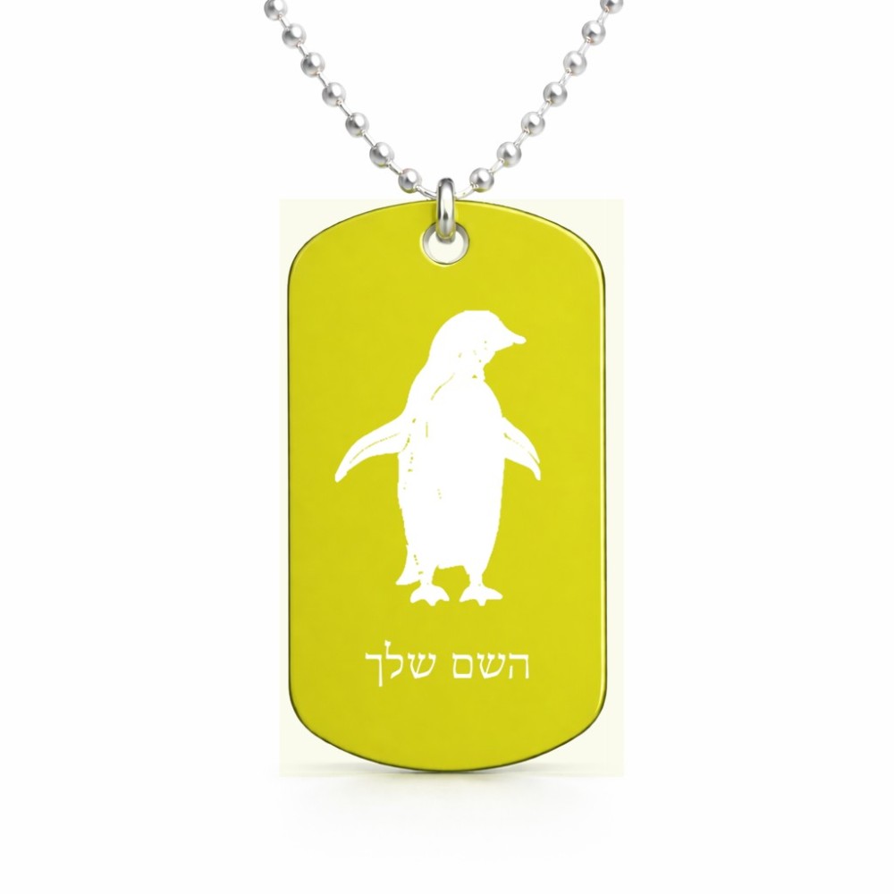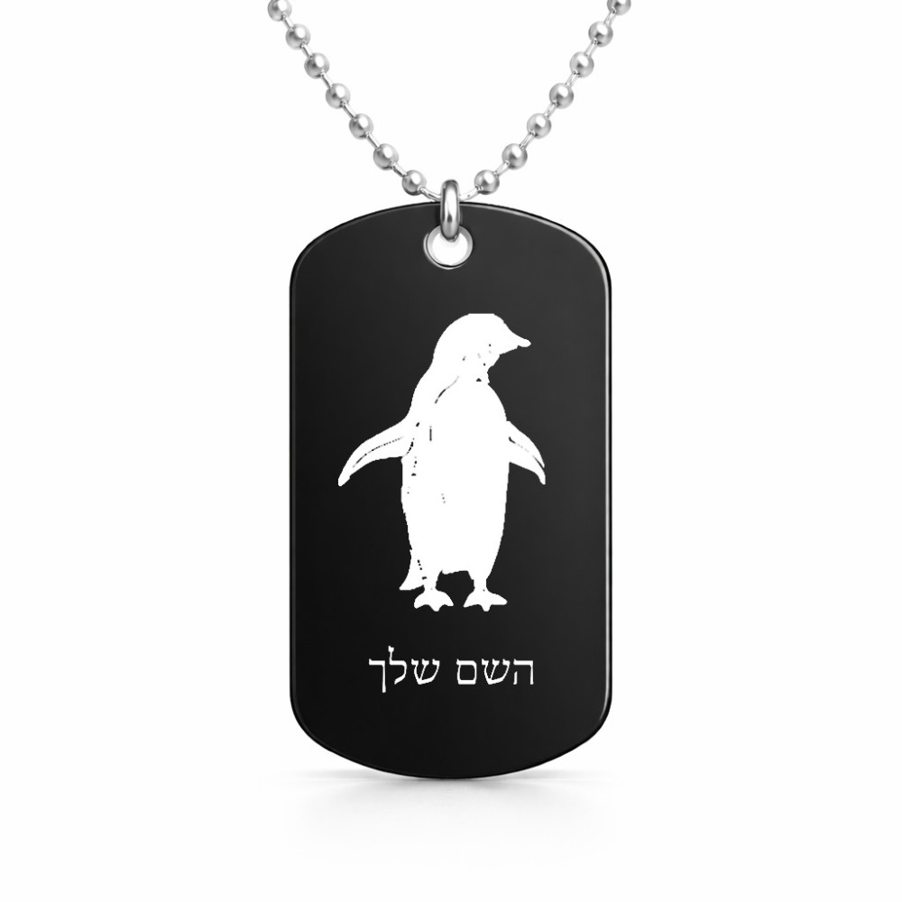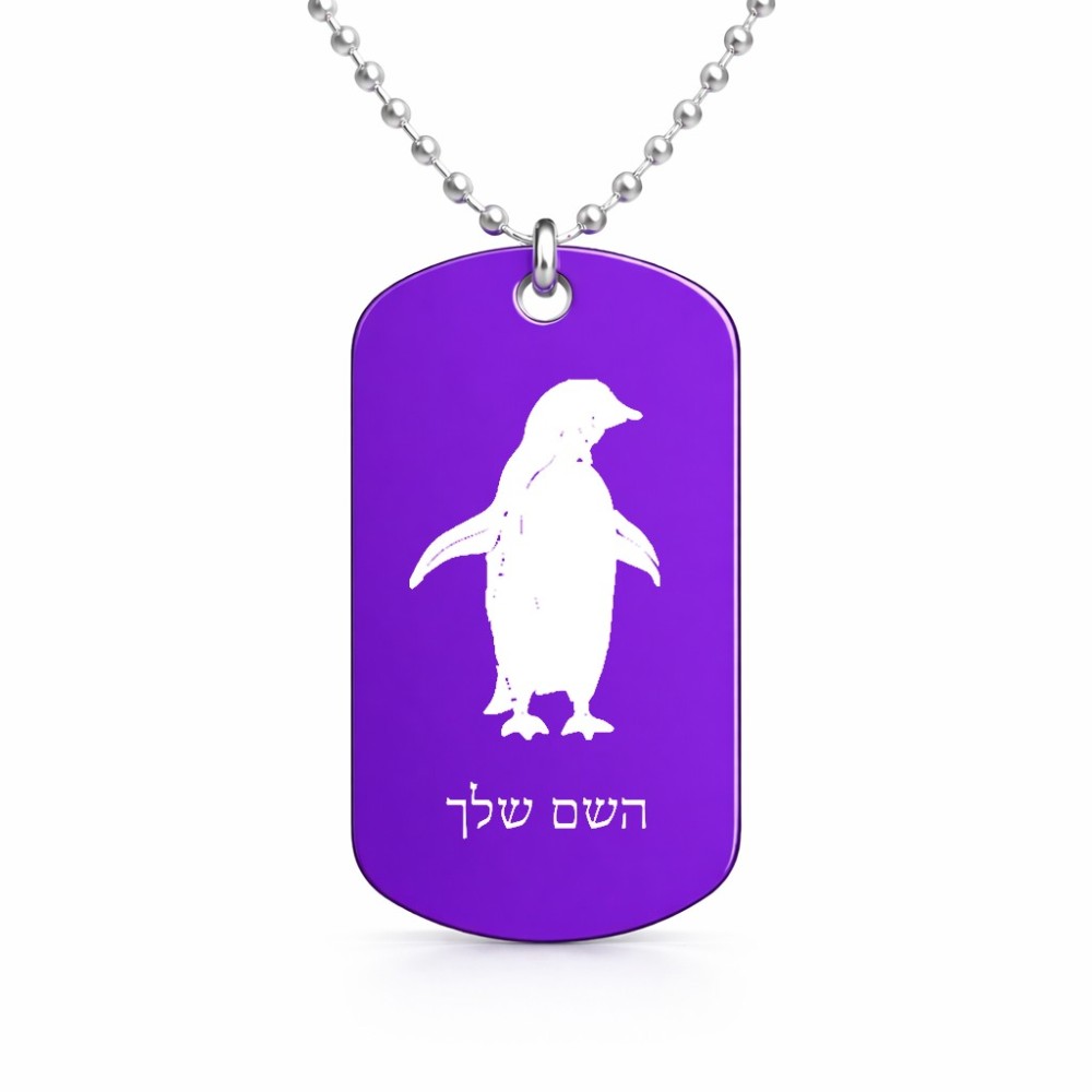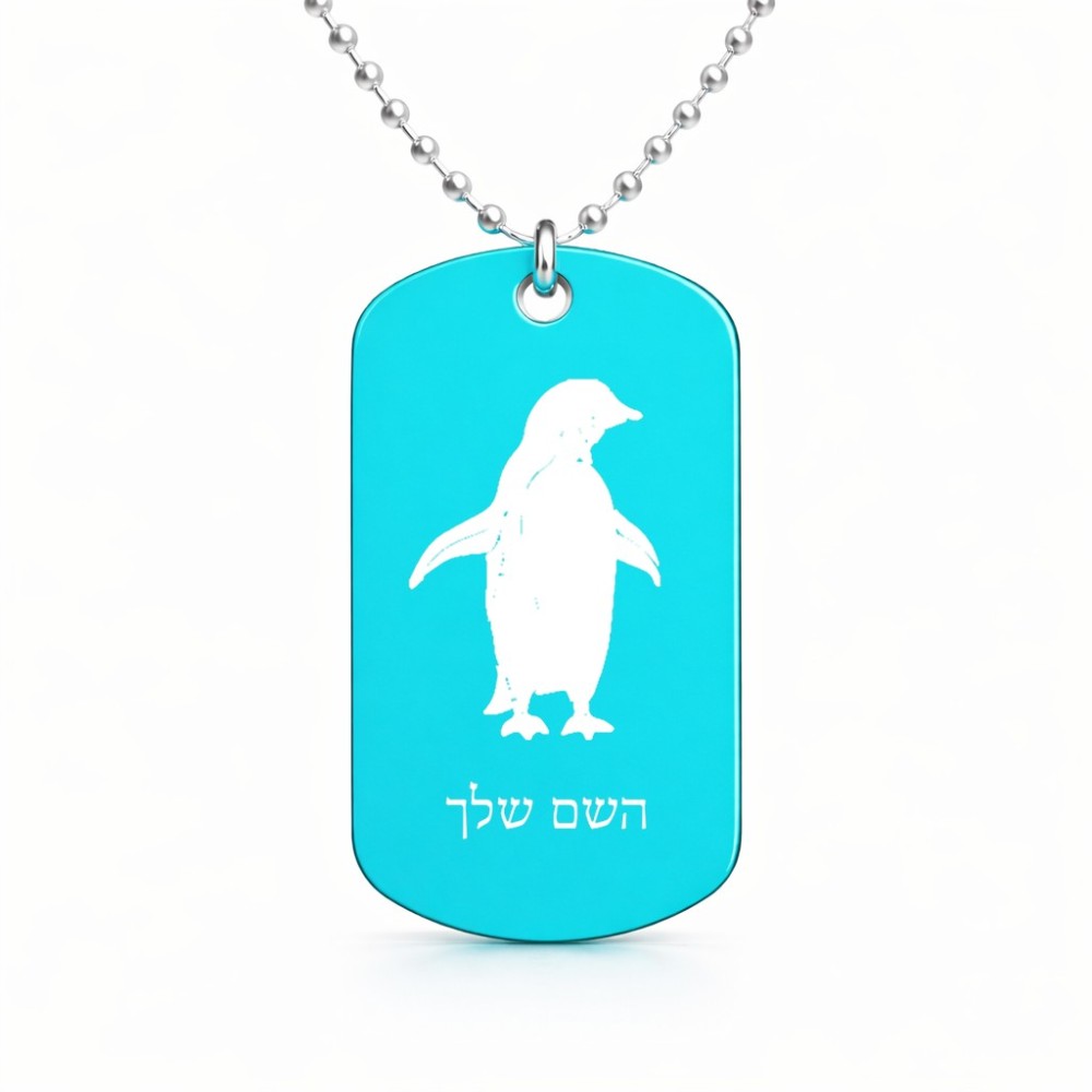 שרשרת דיסקיט מאלומיניום בעיצוב אישי עם השם שלך בעיצוב פינגווין גודל הדיסקיט 2.9 × 5 ס"מ. את השם המבוקש ניתן לציין בהזמנה, אם לא צויין אנחנו ניצור קשר לבירור.