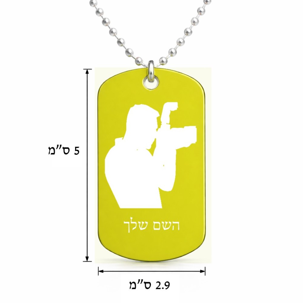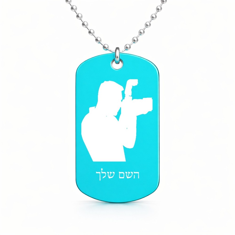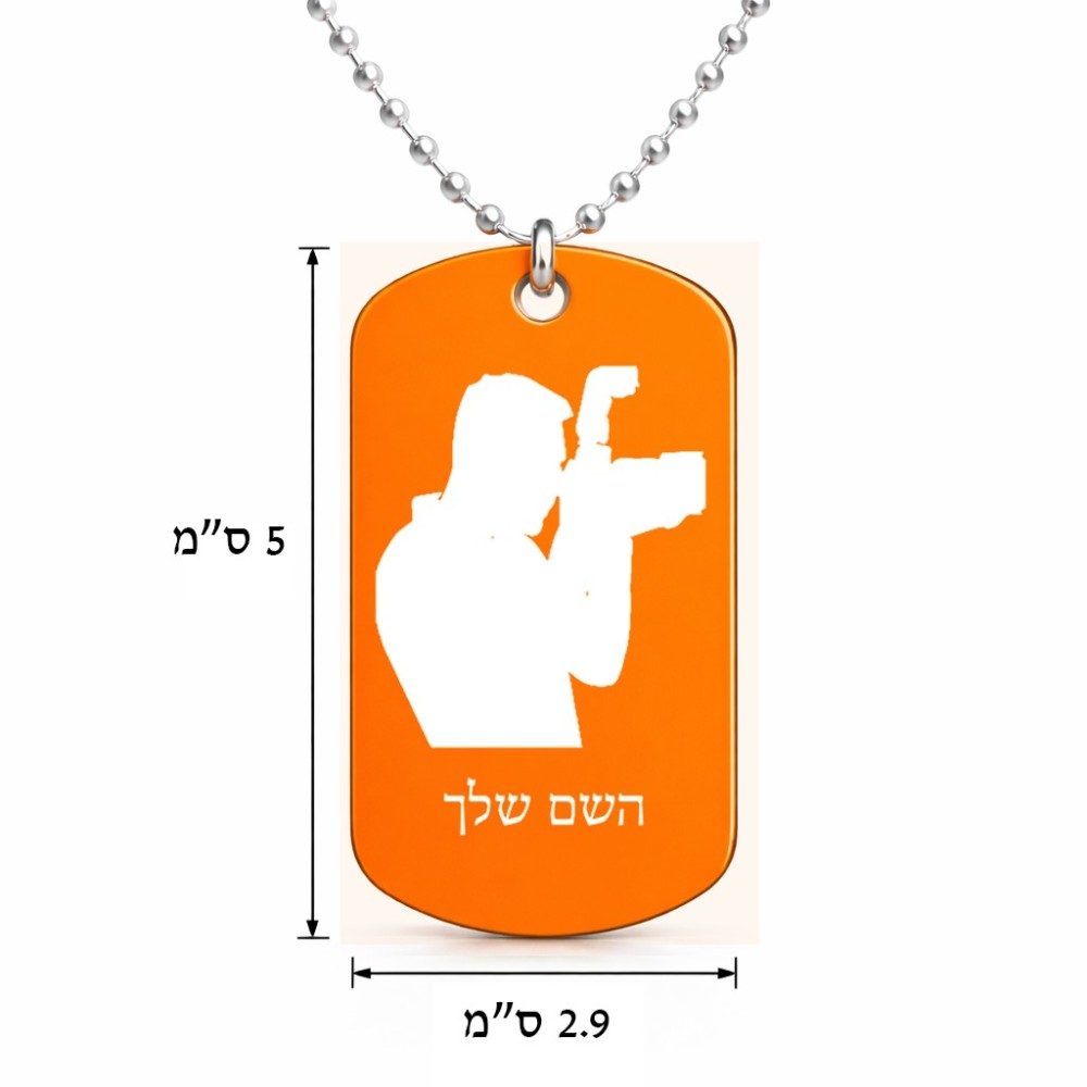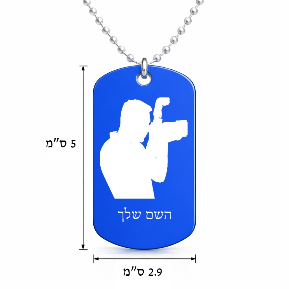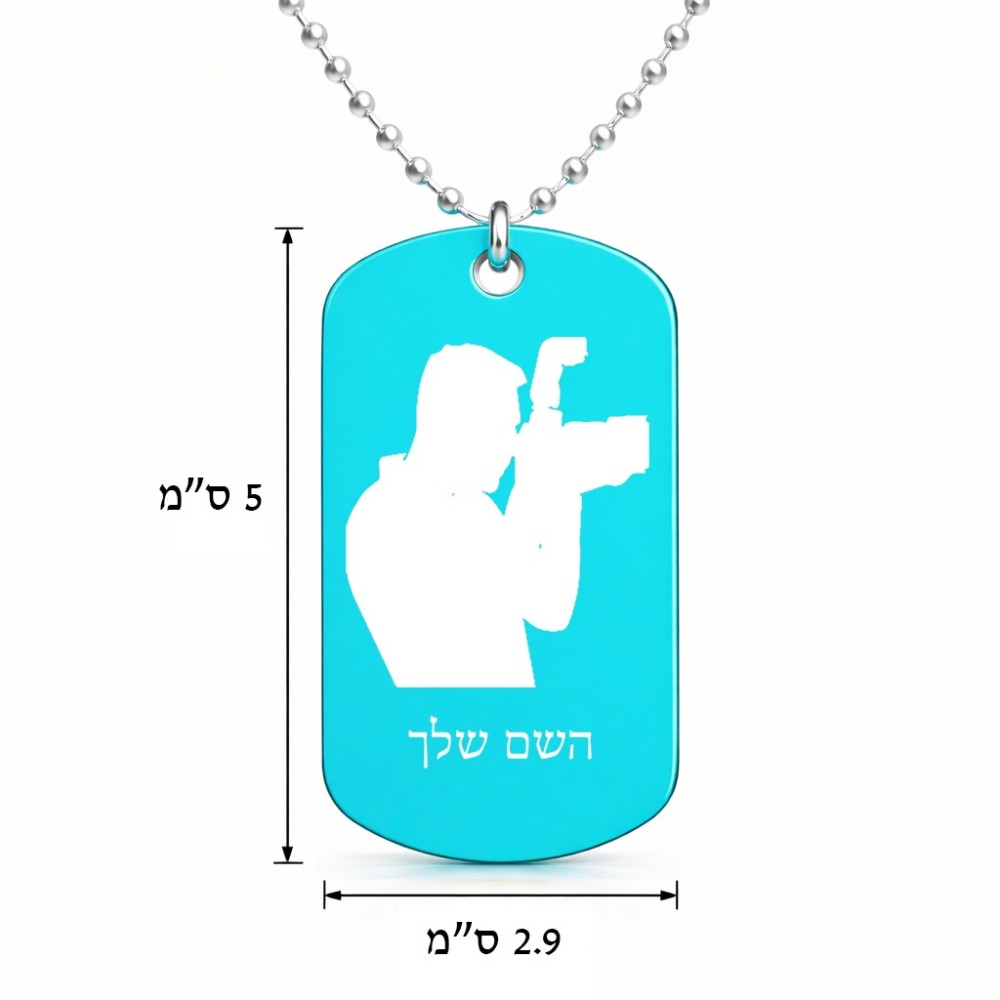 שרשרת דיסקיט מאלומיניום בעיצוב אישי עם השם שלך בעיצוב צלם - גברים גודל הדיסקיט 2.9 × 5 ס"מ. את השם המבוקש ניתן לציין בהזמנה, אם לא צויין אנחנו ניצור קשר לבירור.