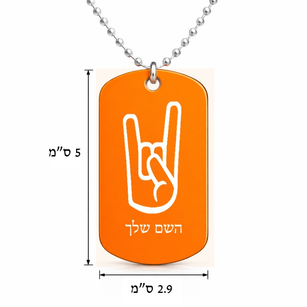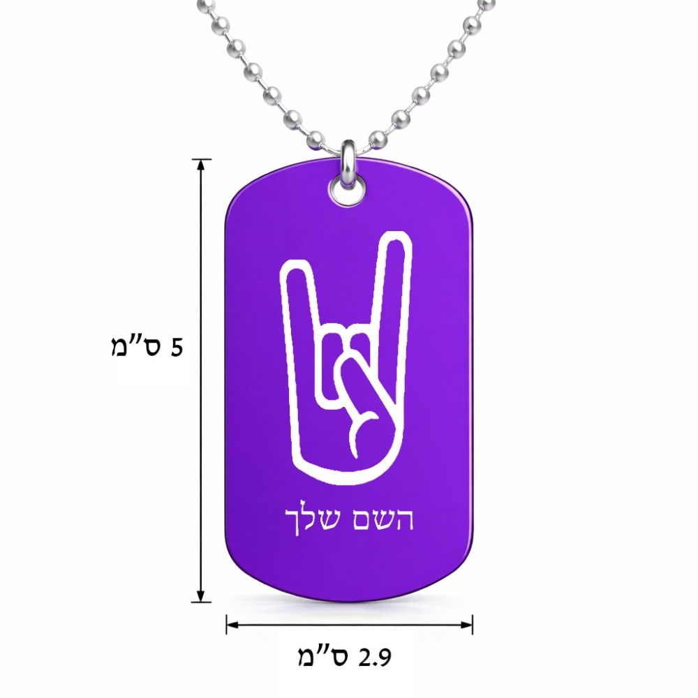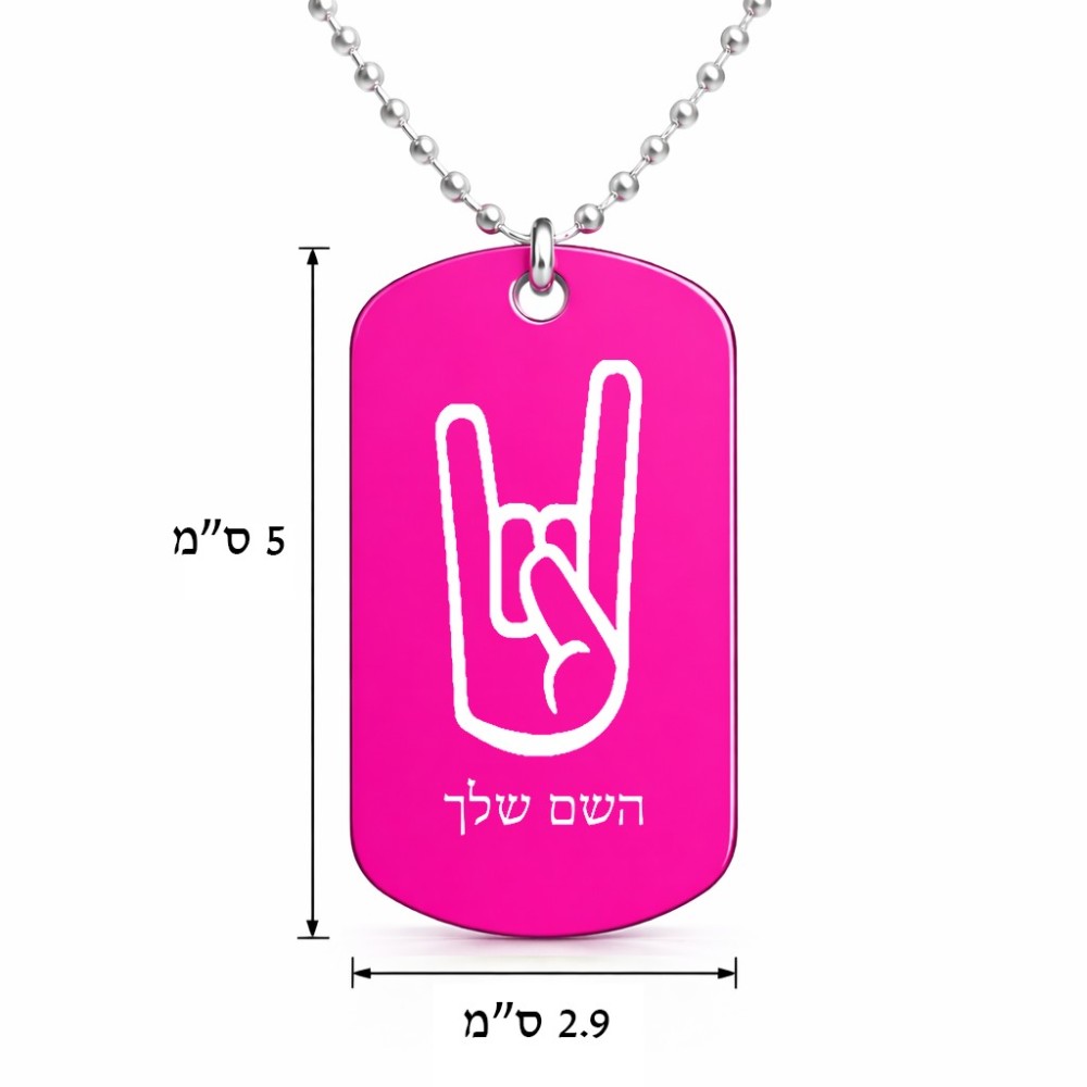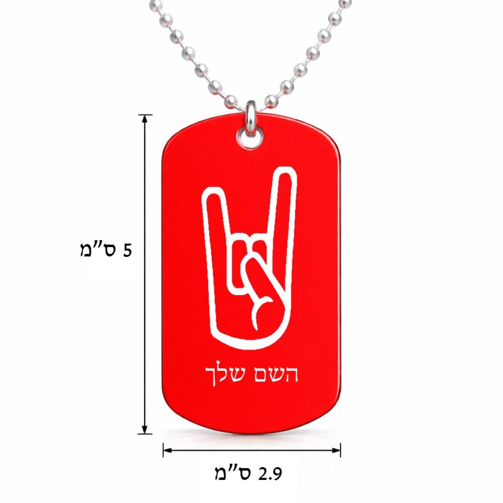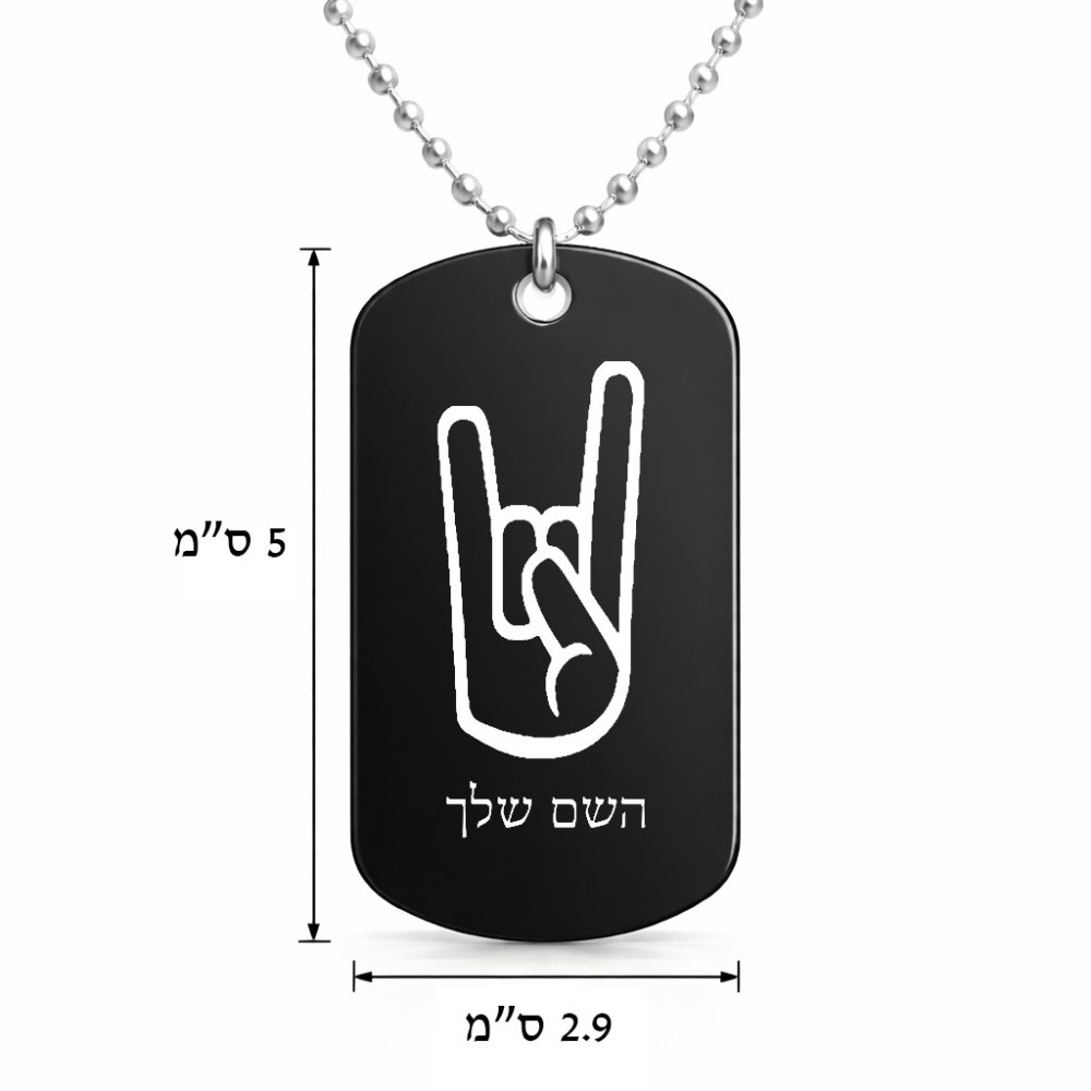 שרשרת דיסקיט מאלומיניום בעיצוב אישי עם השם שלך בעיצוב יד סלע גודל הדיסקיט 2.9 × 5 ס"מ. את השם המבוקש ניתן לציין בהזמנה, אם לא צויין אנחנו ניצור קשר לבירור.