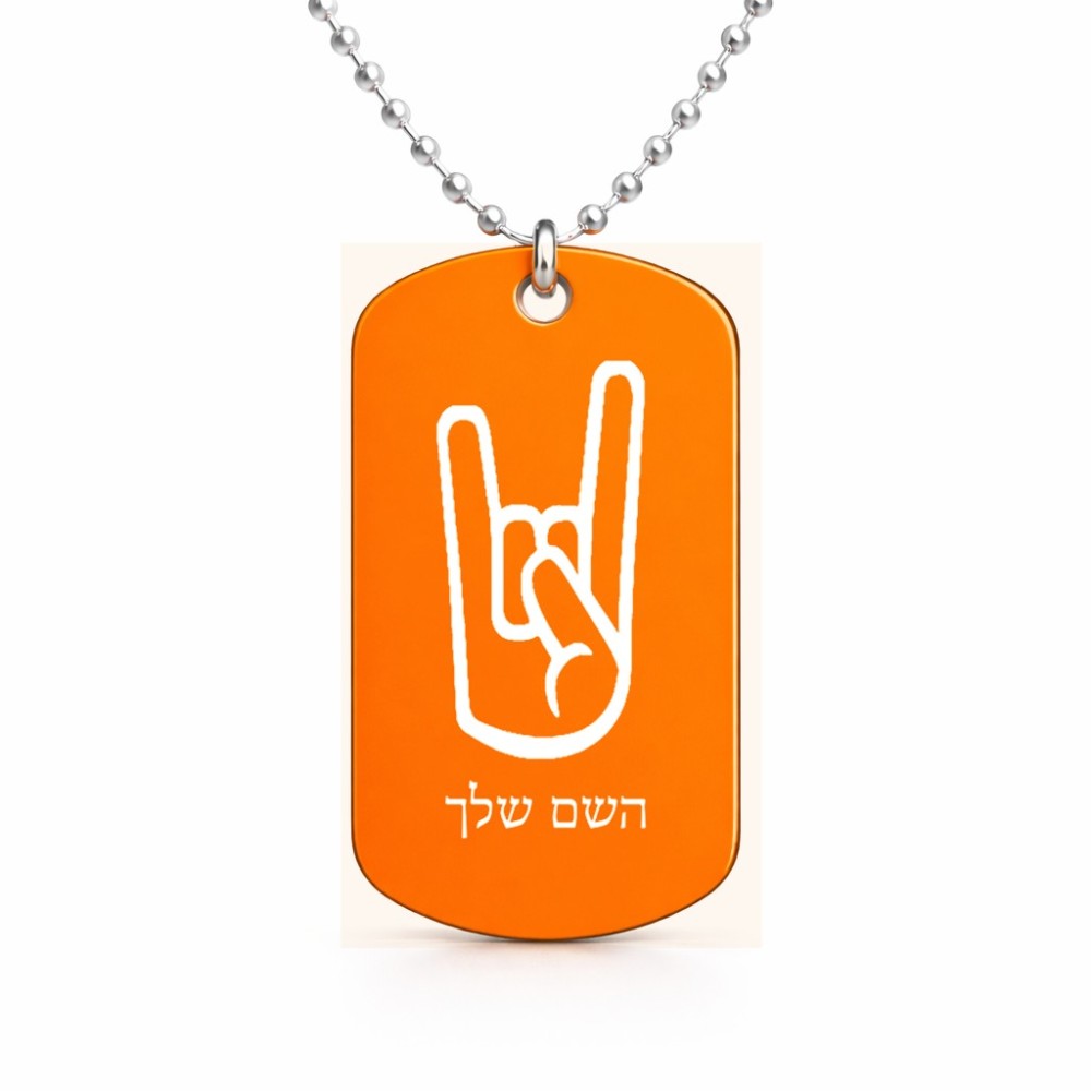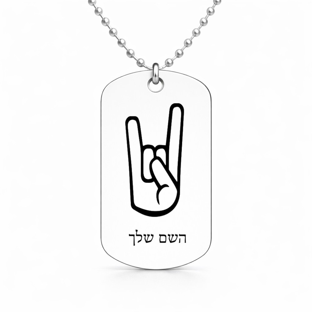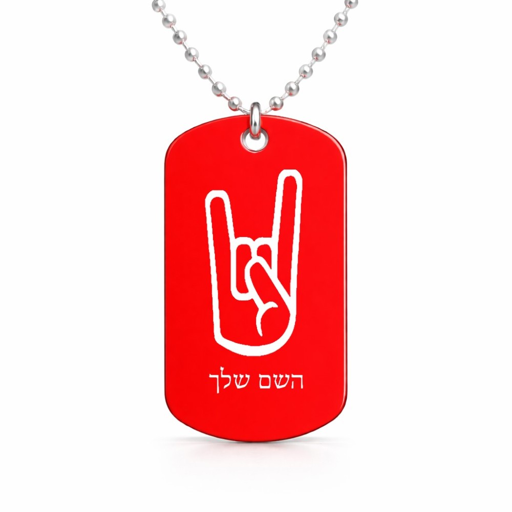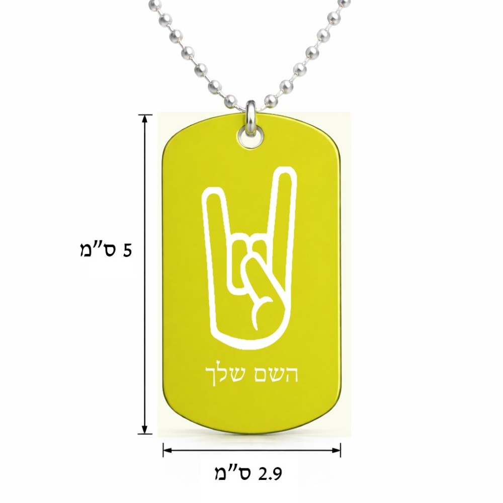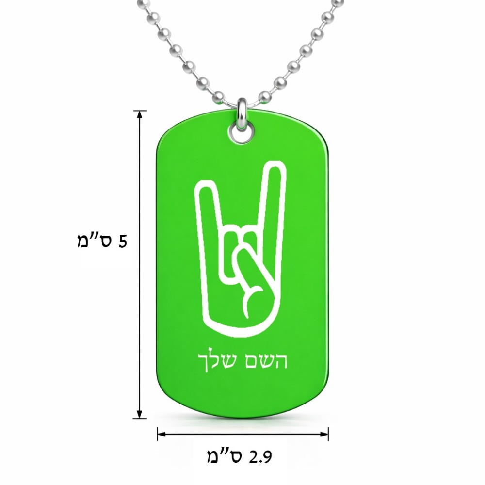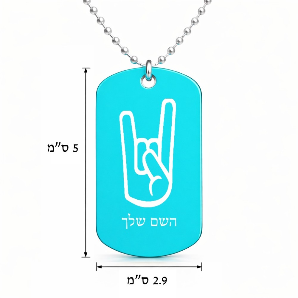 שרשרת דיסקיט מאלומיניום בעיצוב אישי עם השם שלך בעיצוב יד סלע גודל הדיסקיט 2.9 × 5 ס"מ. את השם המבוקש ניתן לציין בהזמנה, אם לא צויין אנחנו ניצור קשר לבירור.