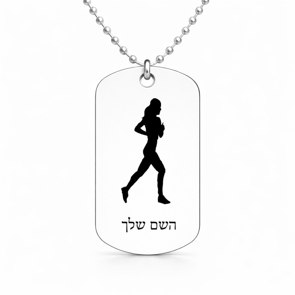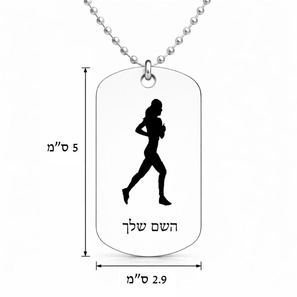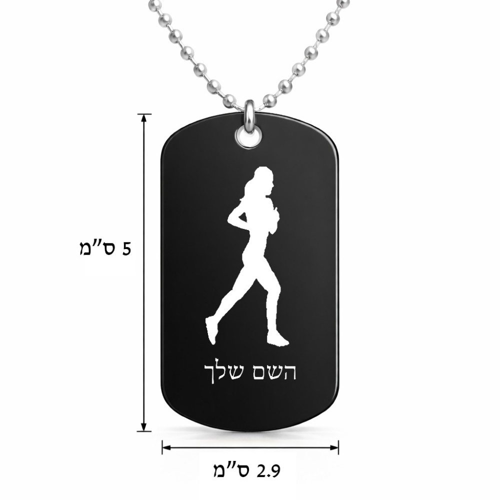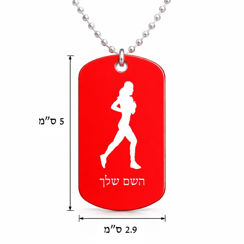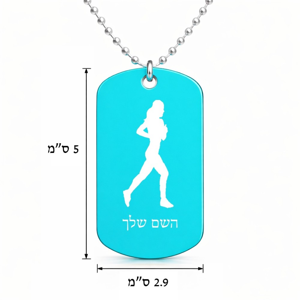 שרשרת דיסקיט מאלומיניום בעיצוב אישי עם השם שלך בעיצוב רץ רץ אישה גודל הדיסקיט 2.9 × 5 ס"מ. את השם המבוקש ניתן לציין בהזמנה, אם לא צויין אנחנו ניצור קשר לבירור.