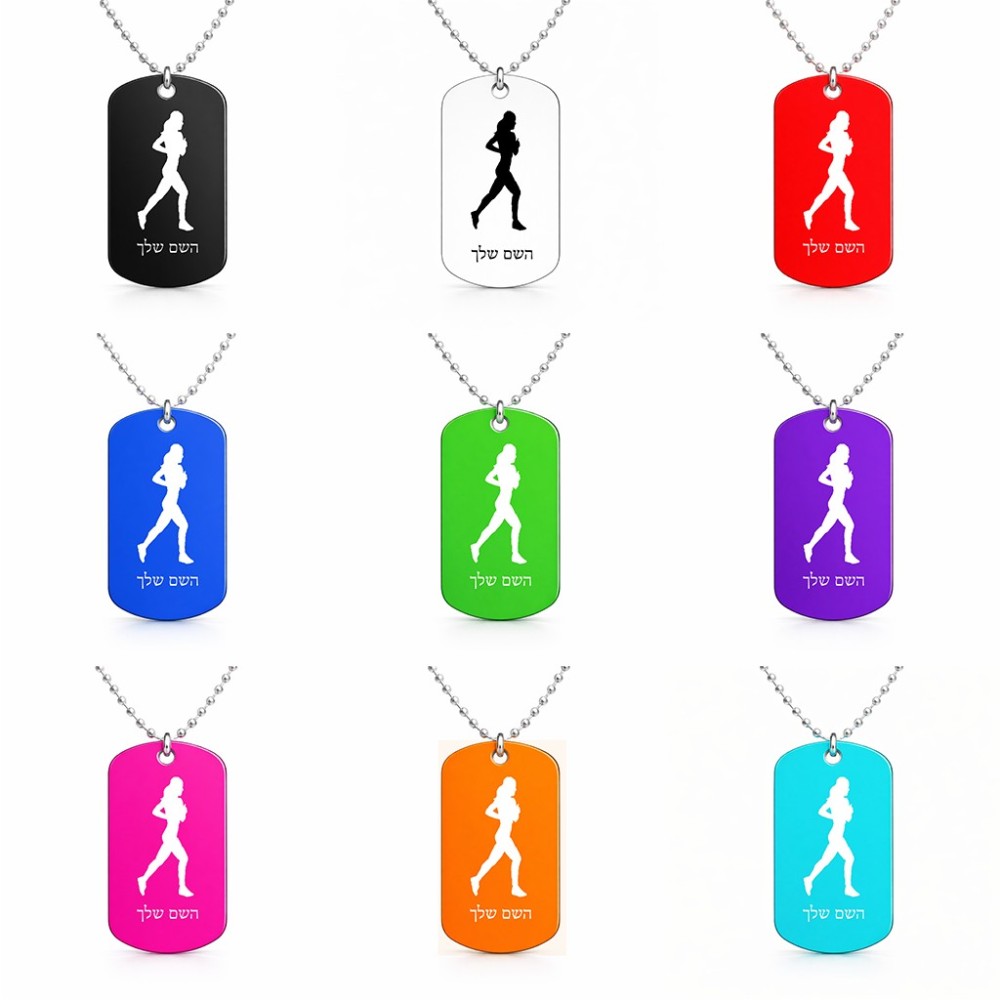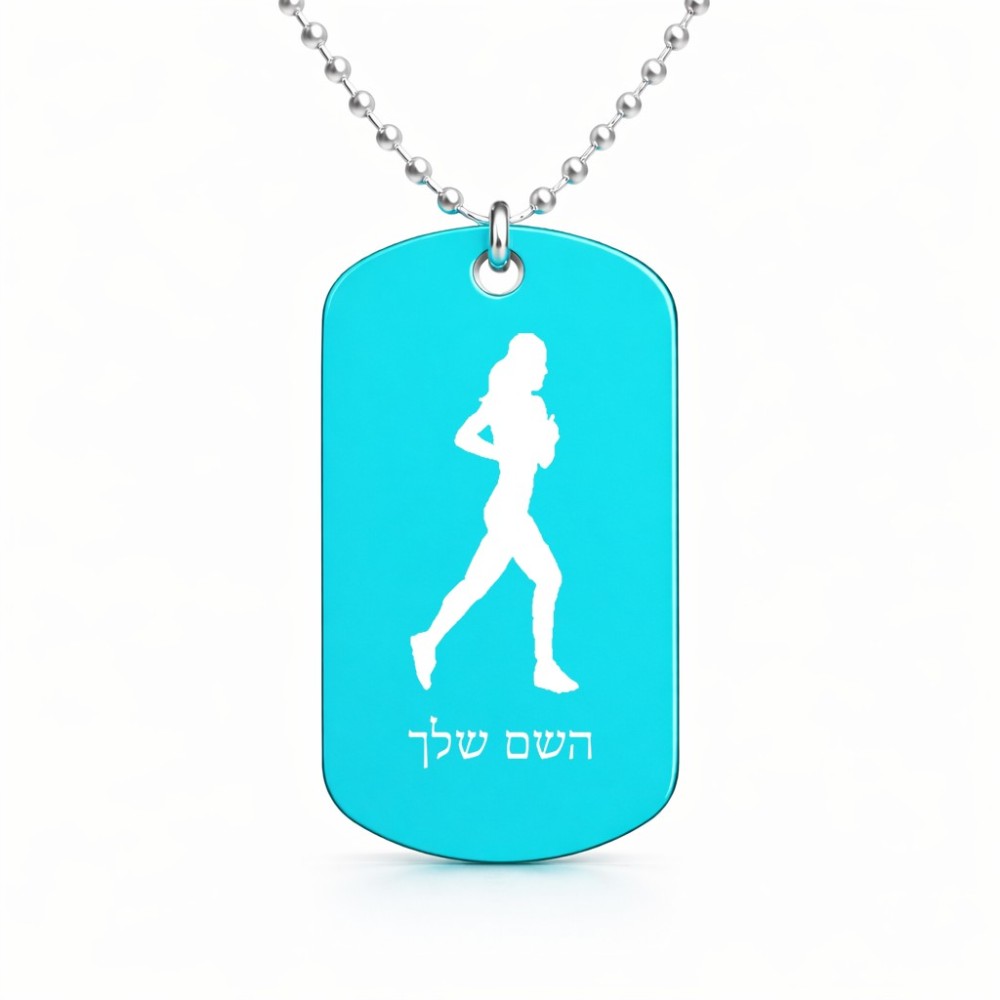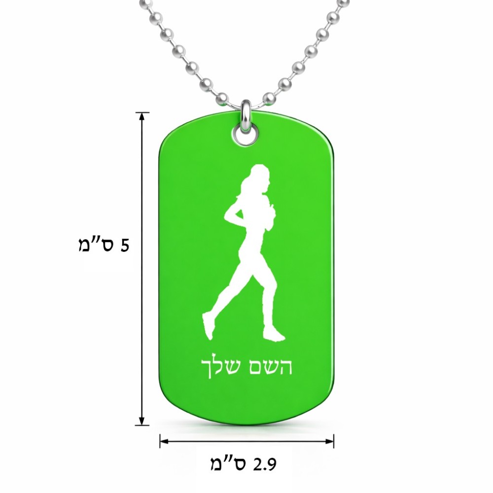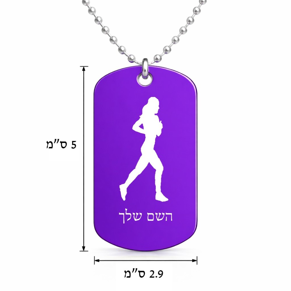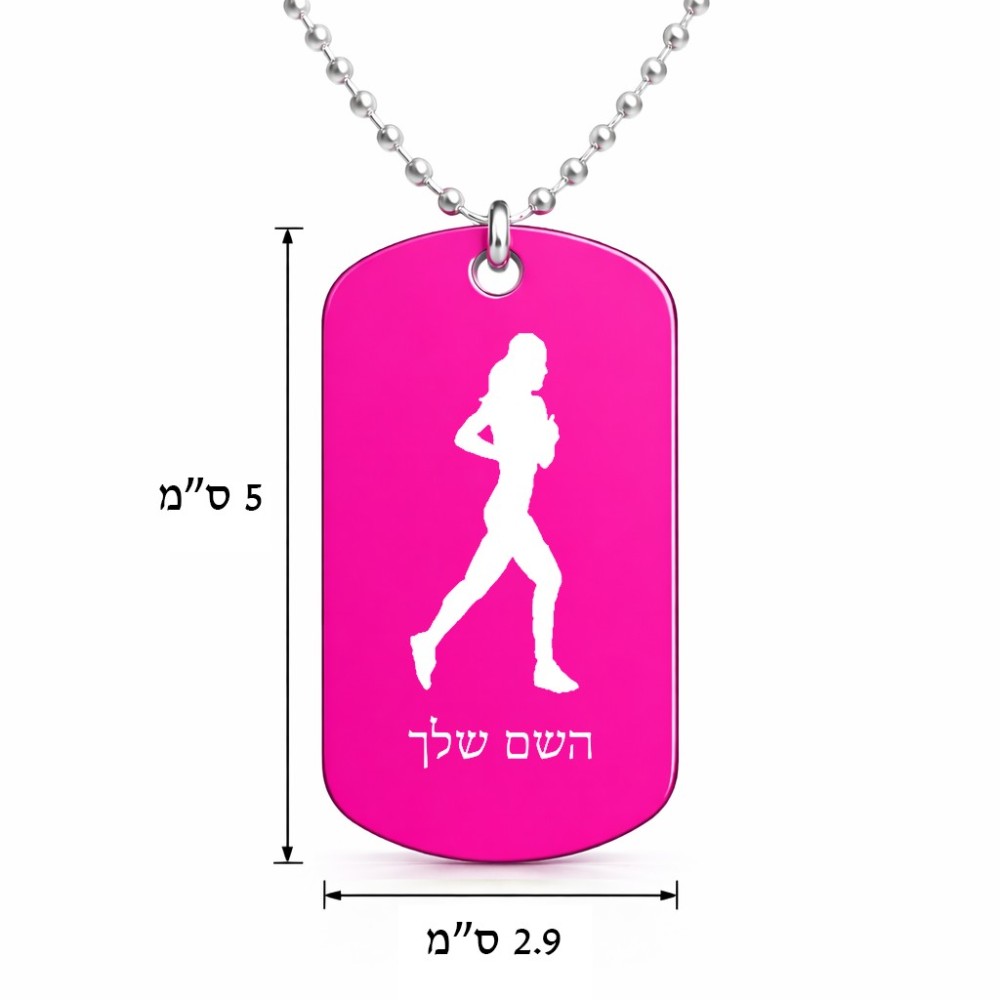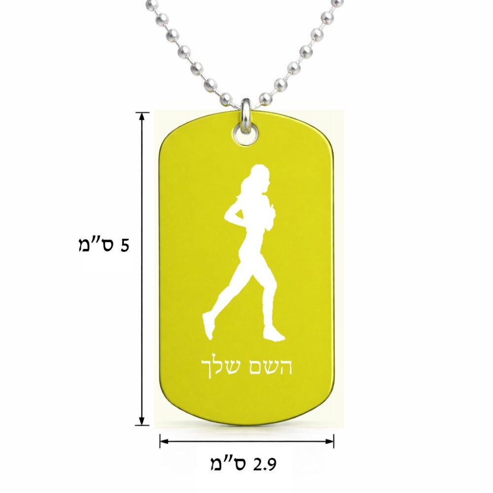שרשרת דיסקיט מאלומיניום בעיצוב אישי עם השם שלך בעיצוב רץ רץ אישה גודל הדיסקיט 2.9 × 5 ס"מ. את השם המבוקש ניתן לציין בהזמנה, אם לא צויין אנחנו ניצור קשר לבירור.