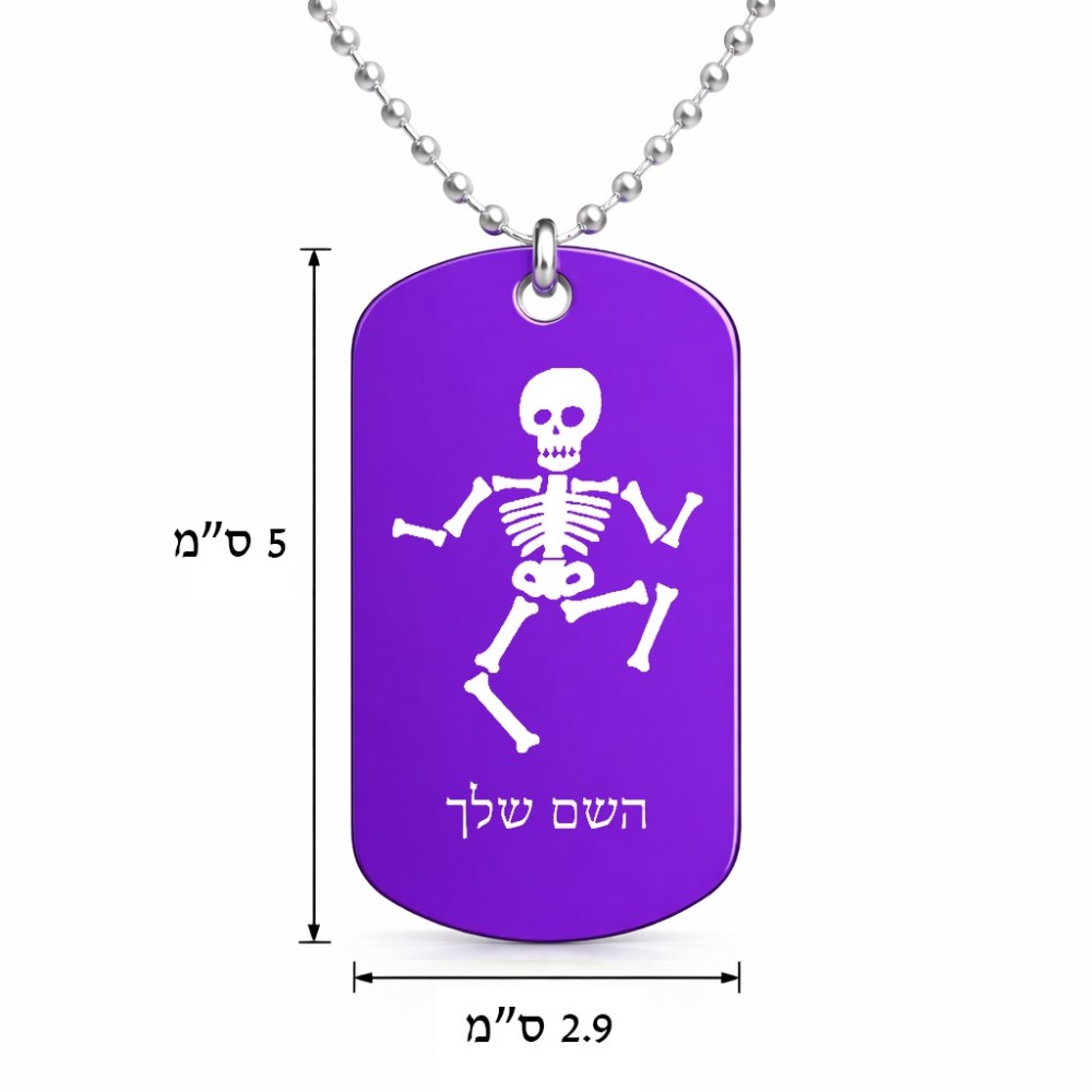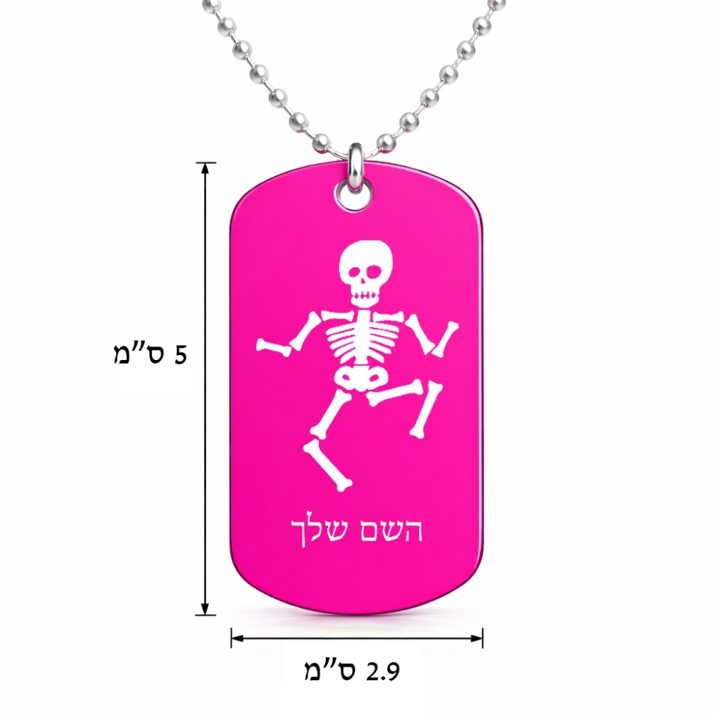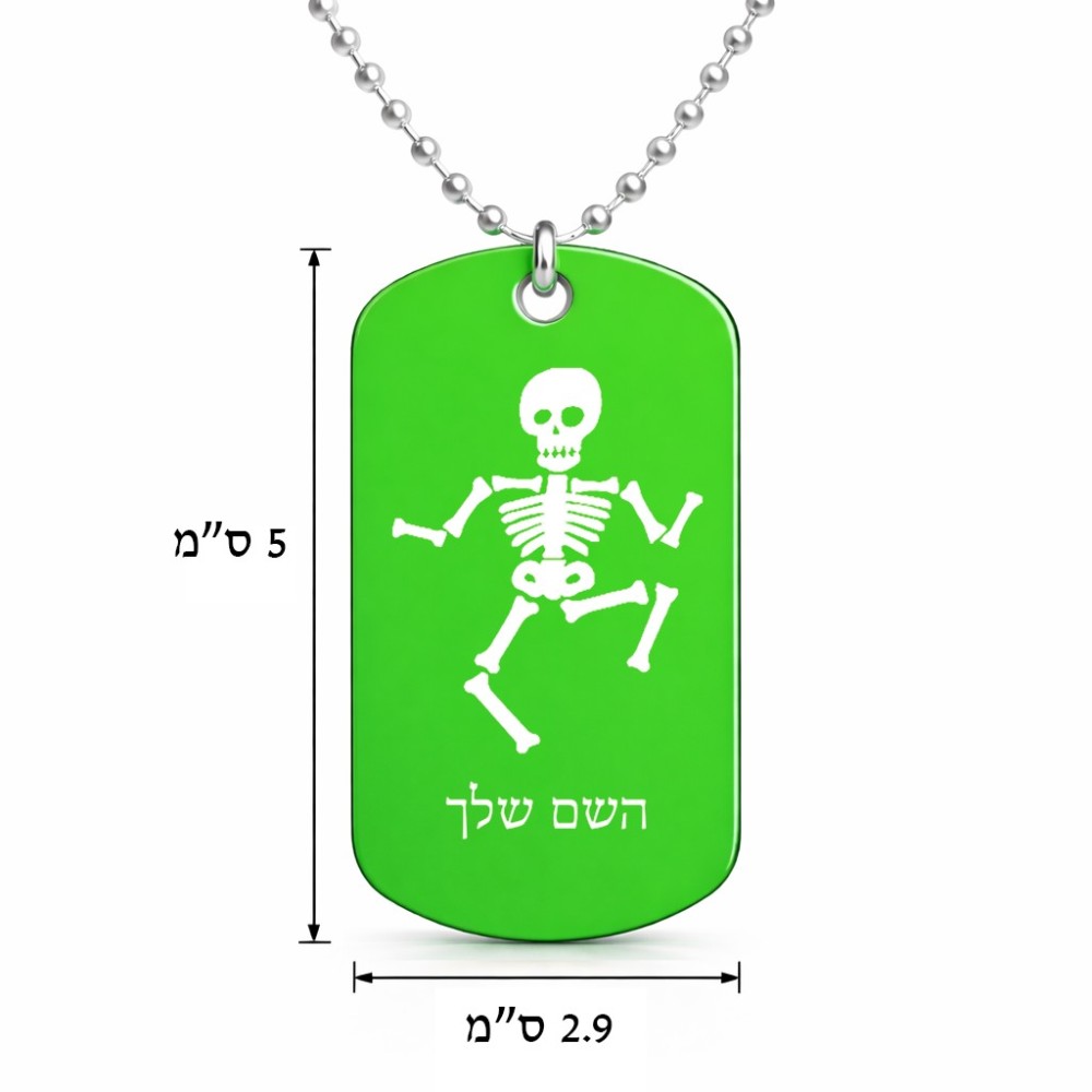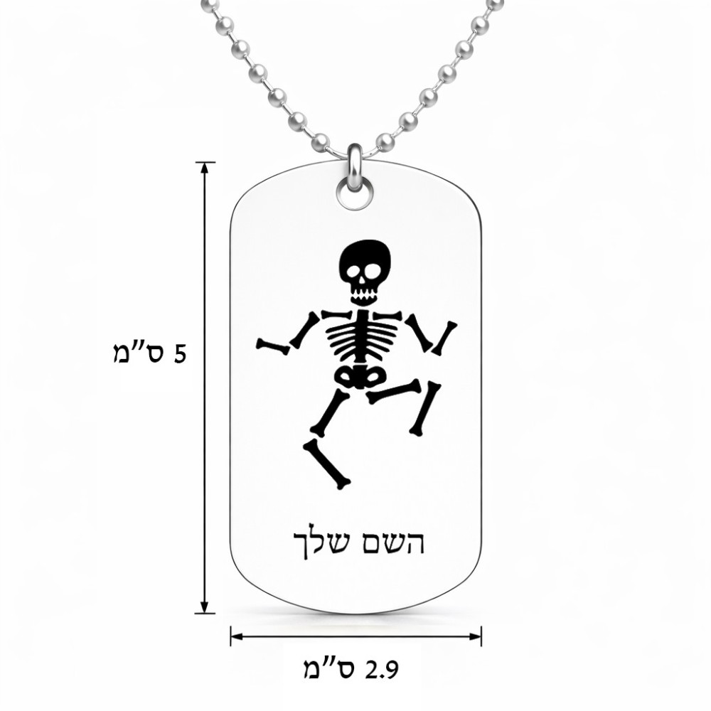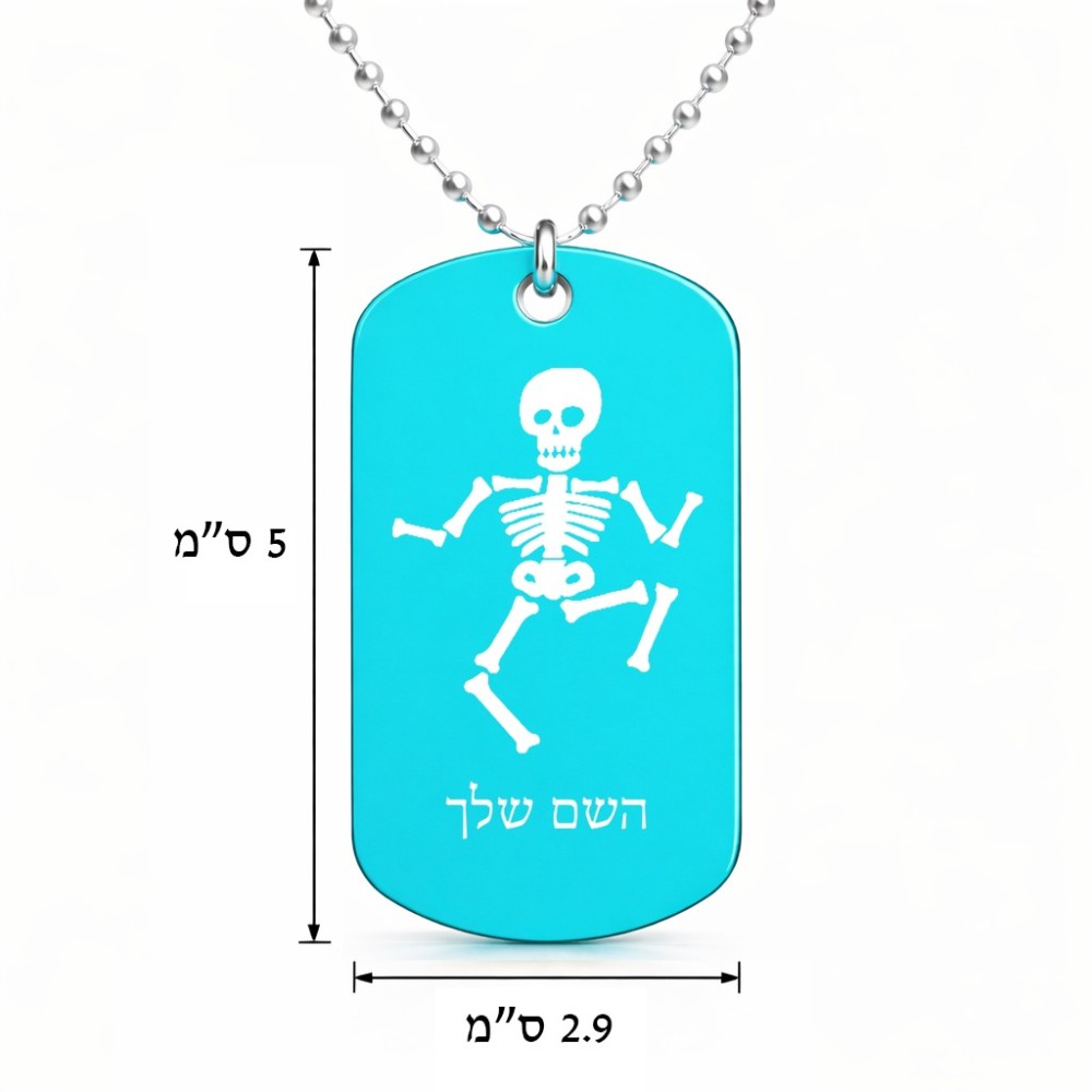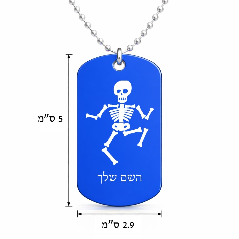 שרשרת דיסקיט מאלומיניום בעיצוב אישי עם השם שלך בעיצוב סקלטון גודל הדיסקיט 2.9 × 5 ס"מ. את השם המבוקש ניתן לציין בהזמנה, אם לא צויין אנחנו ניצור קשר לבירור.