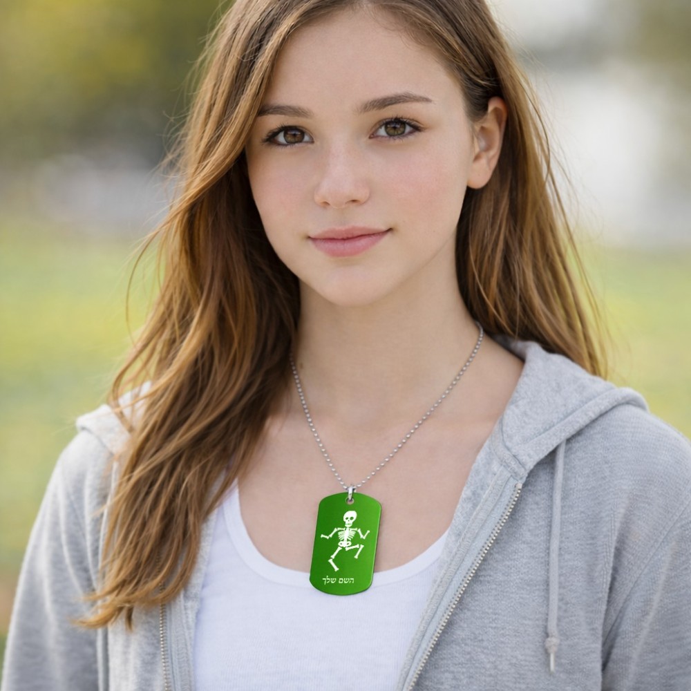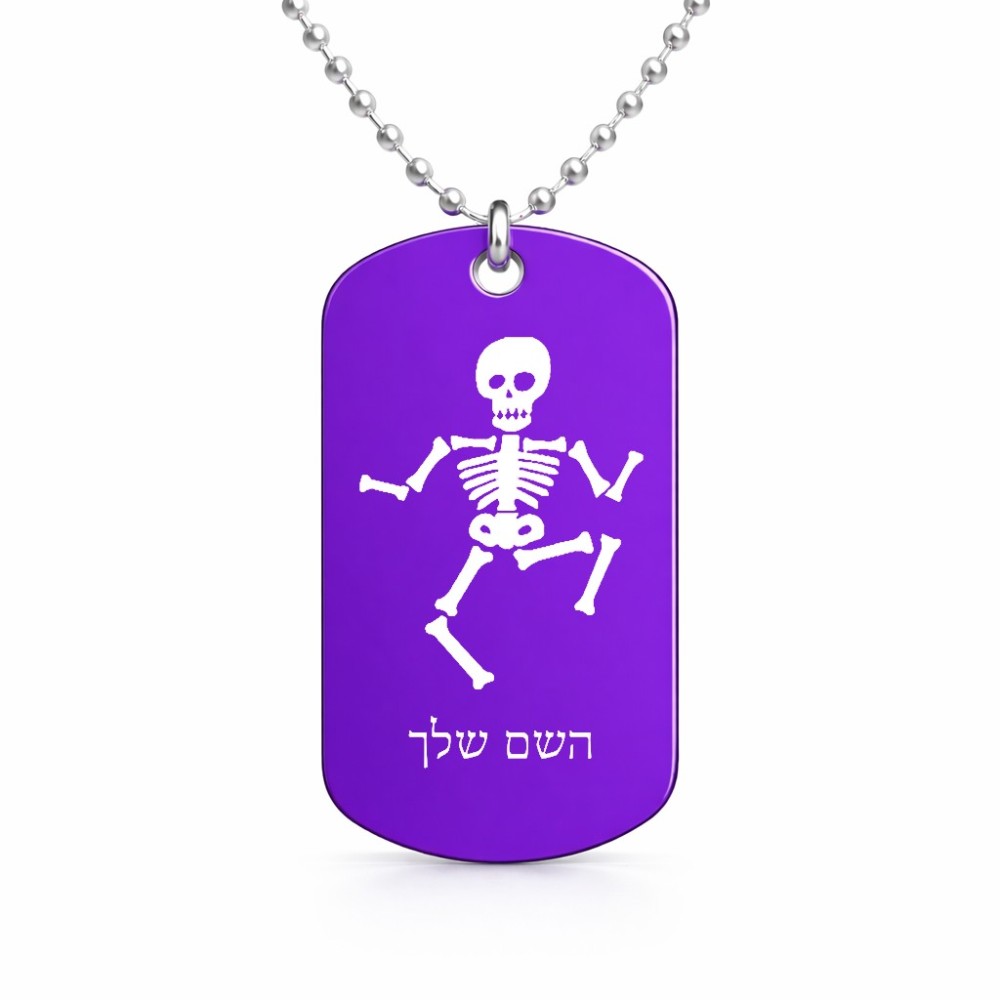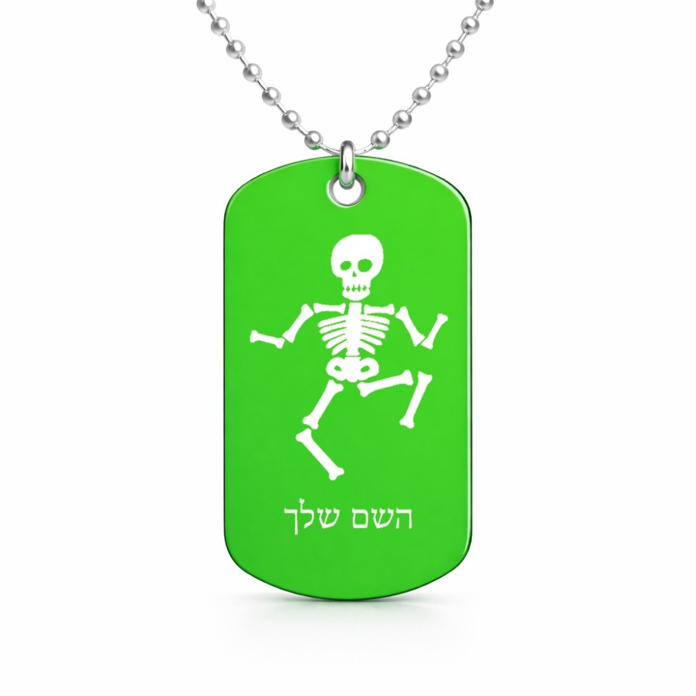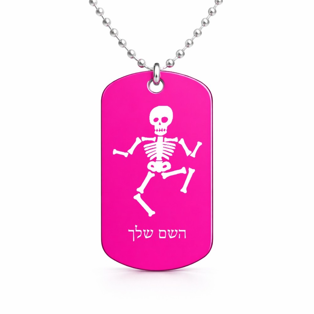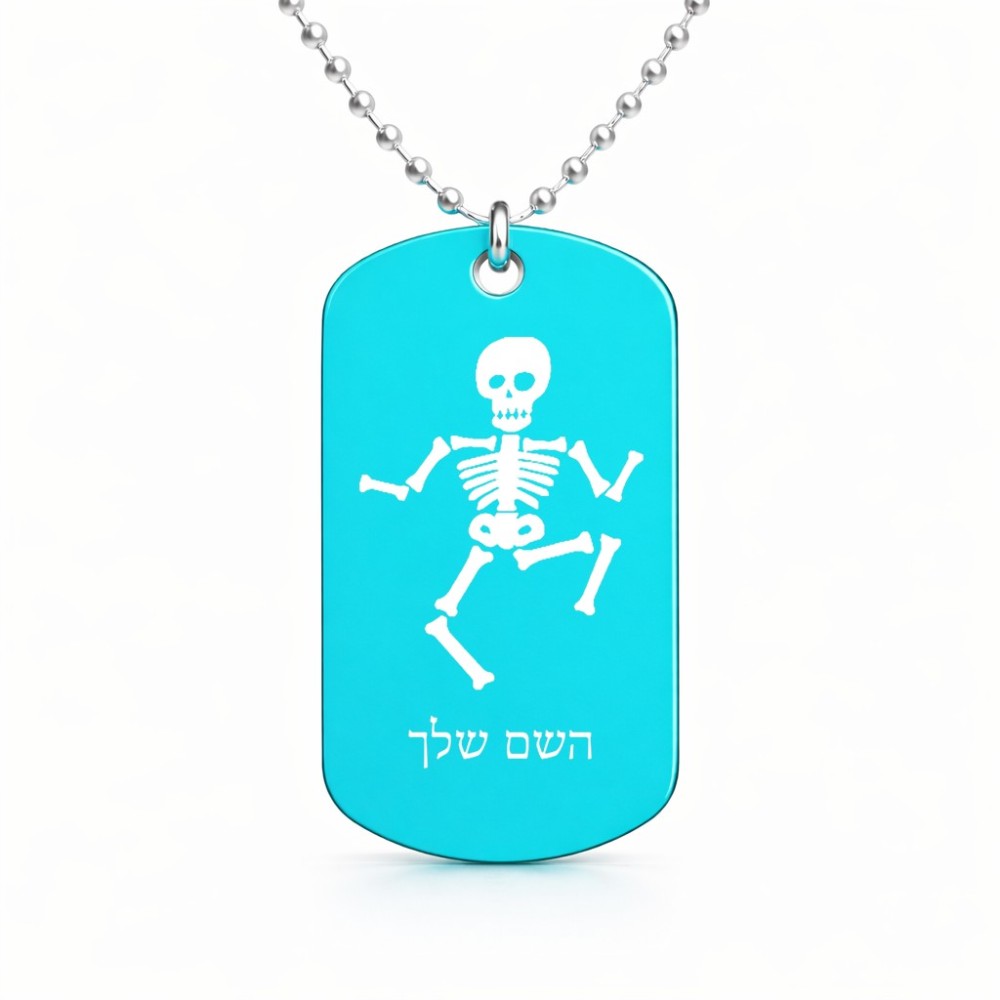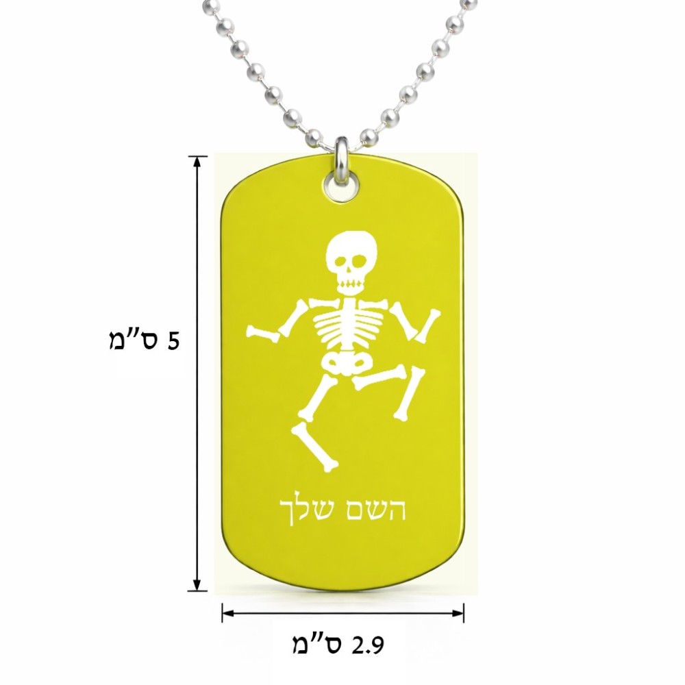 שרשרת דיסקיט מאלומיניום בעיצוב אישי עם השם שלך בעיצוב סקלטון גודל הדיסקיט 2.9 × 5 ס"מ. את השם המבוקש ניתן לציין בהזמנה, אם לא צויין אנחנו ניצור קשר לבירור.