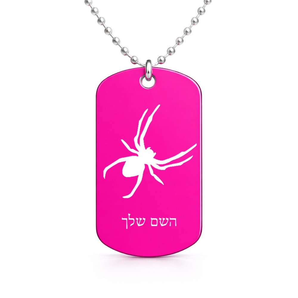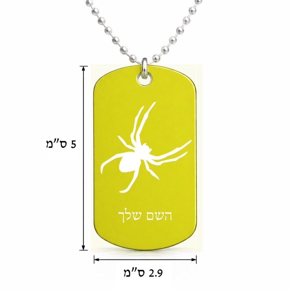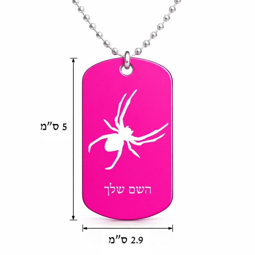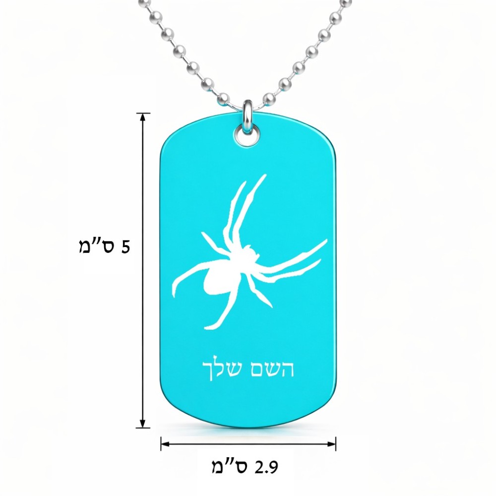 שרשרת דיסקיט מאלומיניום בעיצוב אישי עם השם שלך בעיצוב עכביש גודל הדיסקיט 2.9 × 5 ס"מ. את השם המבוקש ניתן לציין בהזמנה, אם לא צויין אנחנו ניצור קשר לבירור.