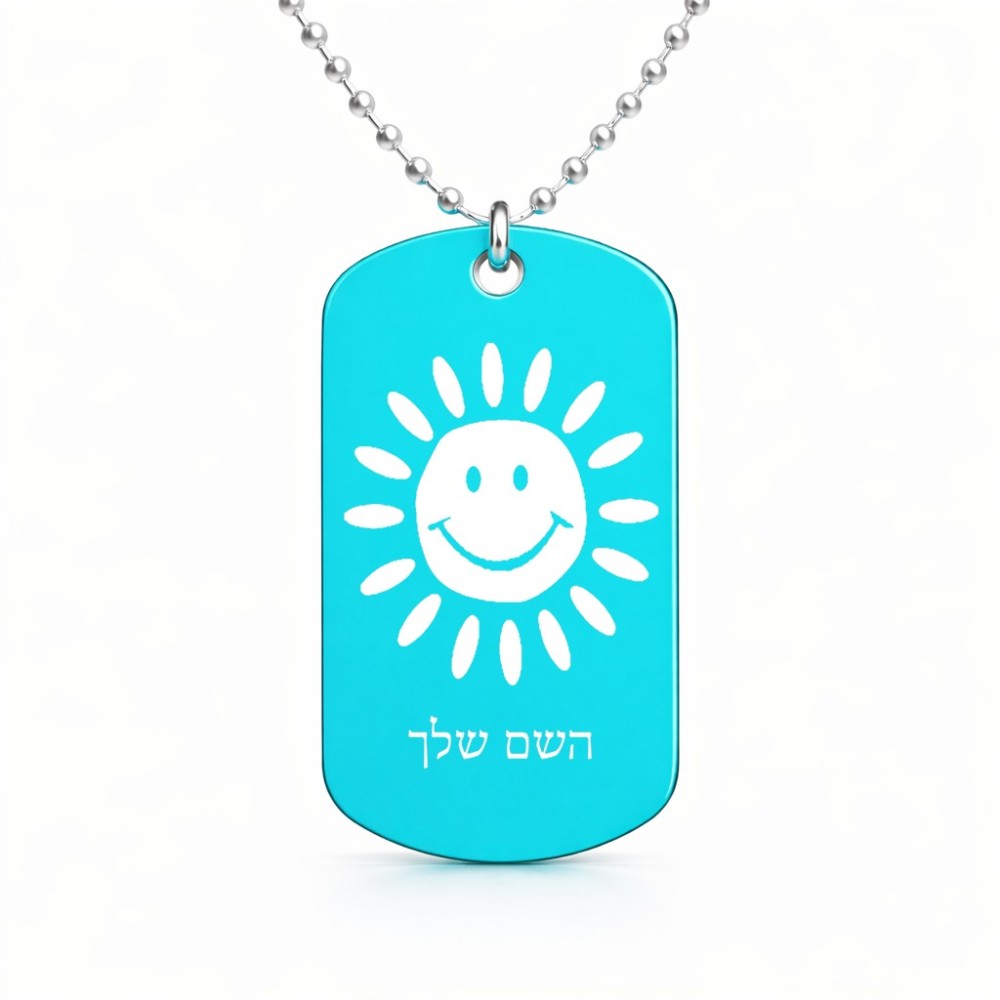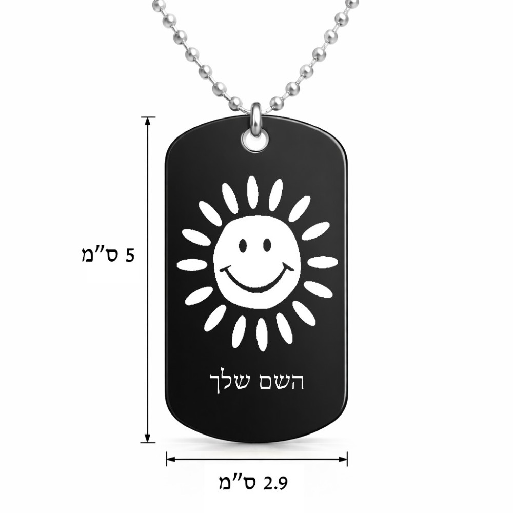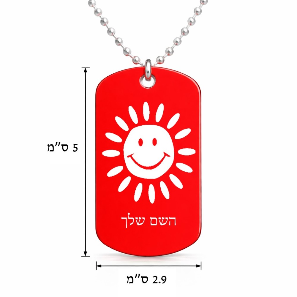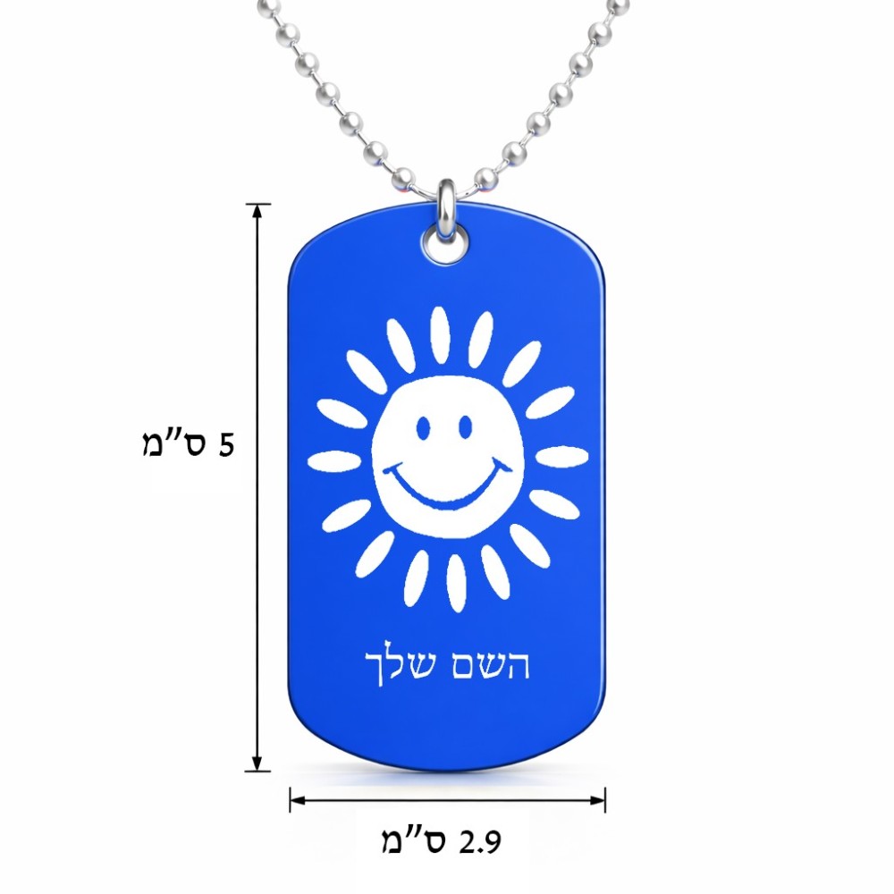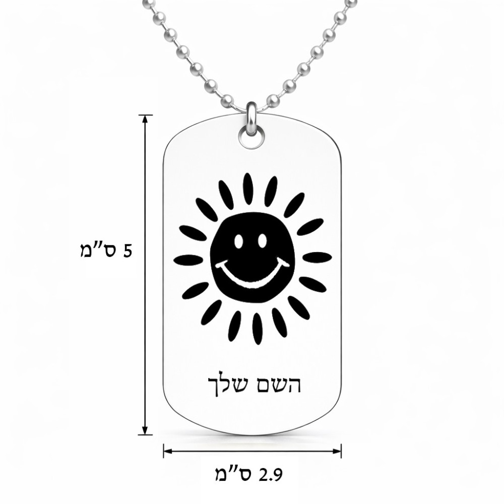 שרשרת דיסקיט מאלומיניום בעיצוב אישי עם השם שלך בעיצוב שמש גודל הדיסקיט 2.9 × 5 ס"מ. את השם המבוקש ניתן לציין בהזמנה, אם לא צויין אנחנו ניצור קשר לבירור.