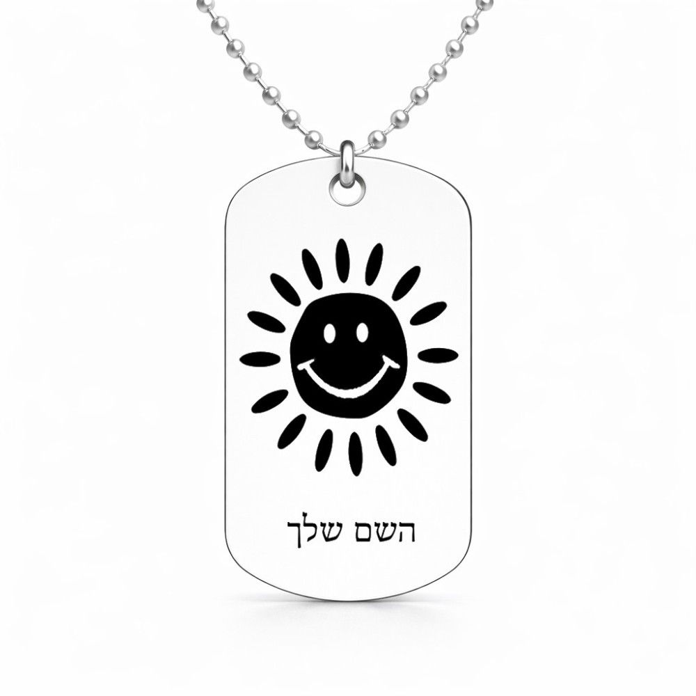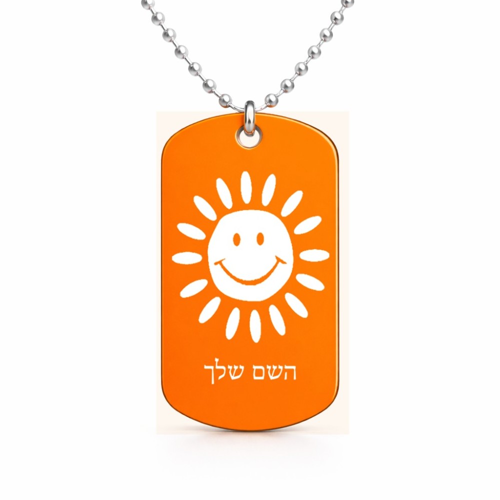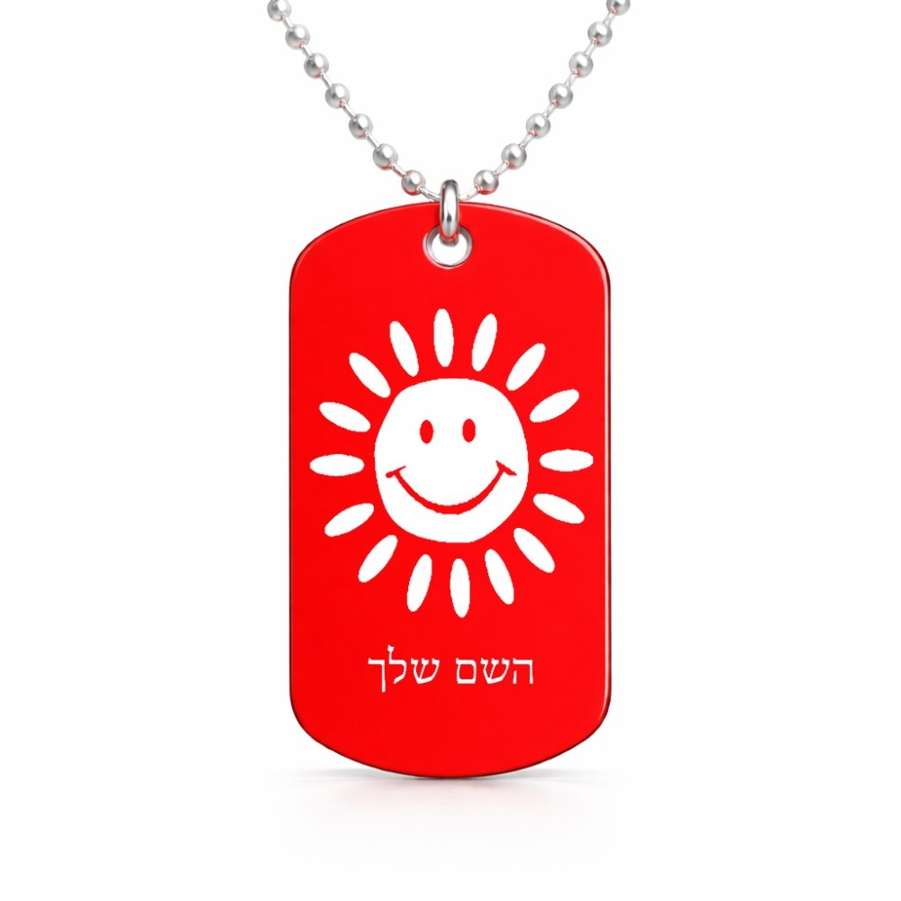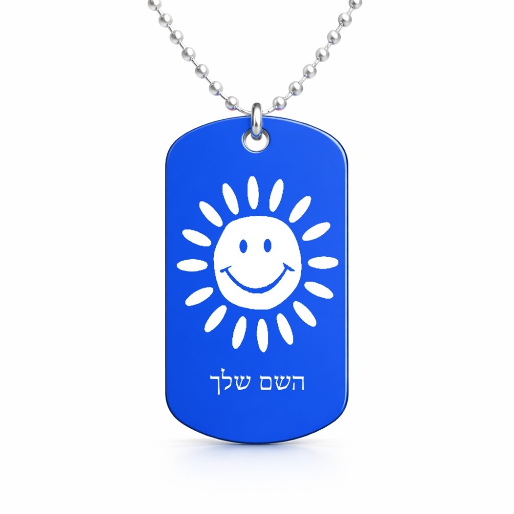 שרשרת דיסקיט מאלומיניום בעיצוב אישי עם השם שלך בעיצוב שמש גודל הדיסקיט 2.9 × 5 ס"מ. את השם המבוקש ניתן לציין בהזמנה, אם לא צויין אנחנו ניצור קשר לבירור.