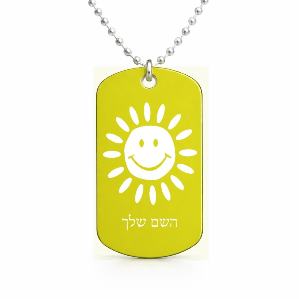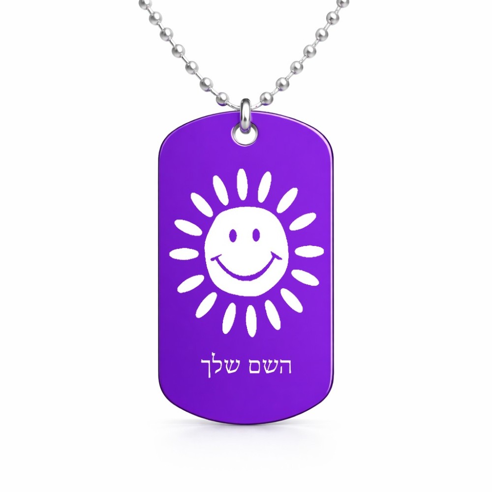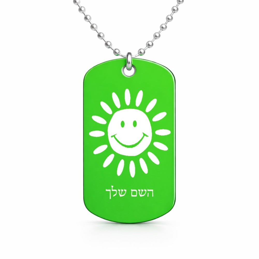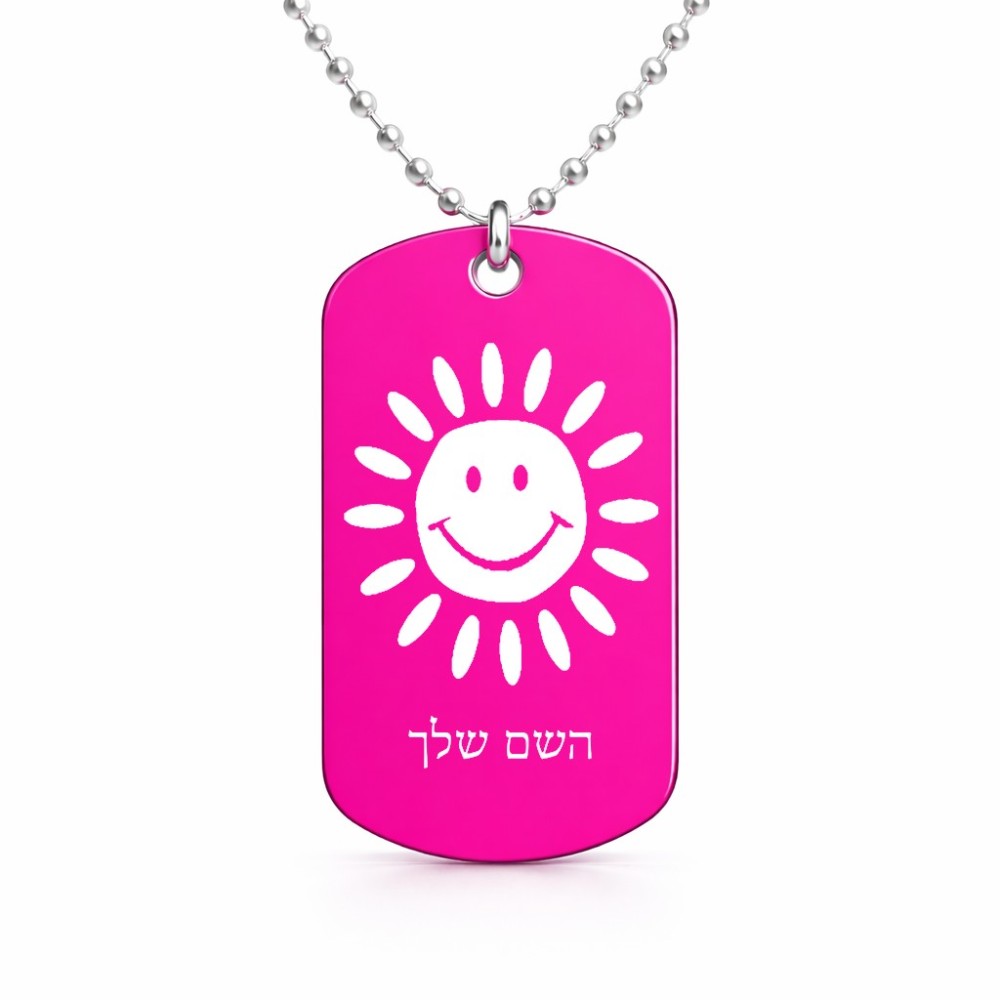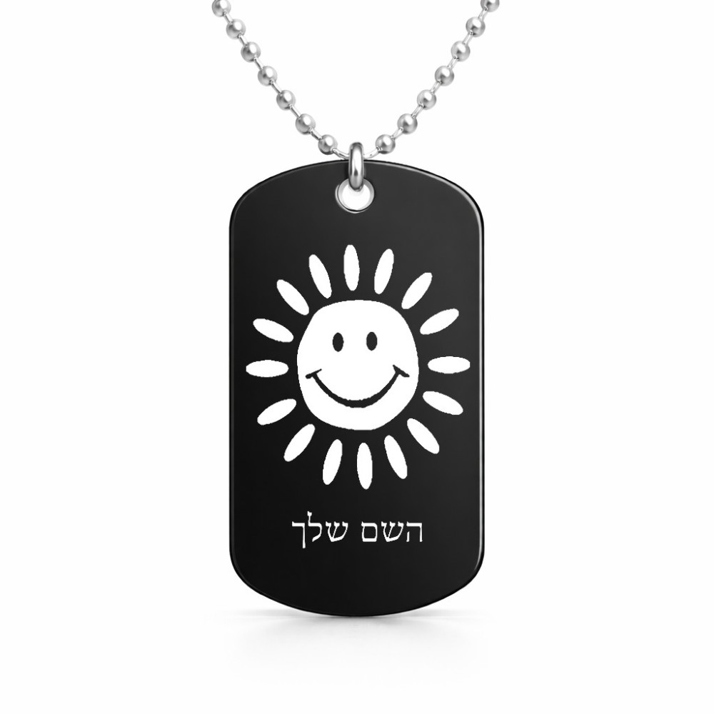 שרשרת דיסקיט מאלומיניום בעיצוב אישי עם השם שלך בעיצוב שמש גודל הדיסקיט 2.9 × 5 ס"מ. את השם המבוקש ניתן לציין בהזמנה, אם לא צויין אנחנו ניצור קשר לבירור.