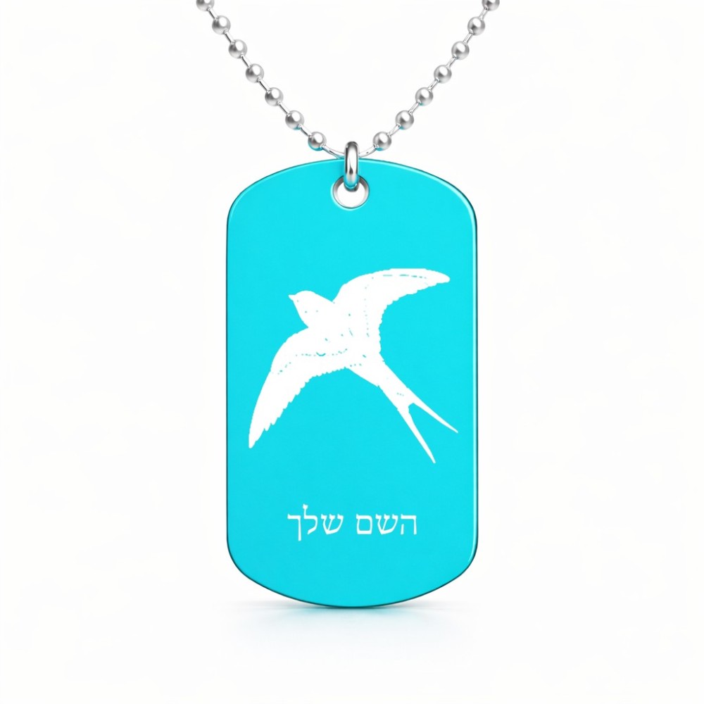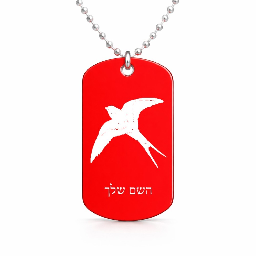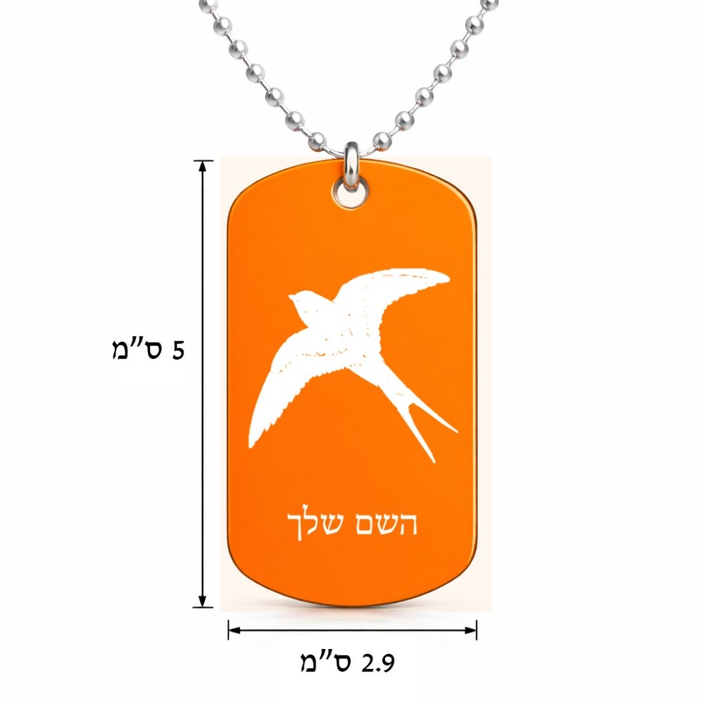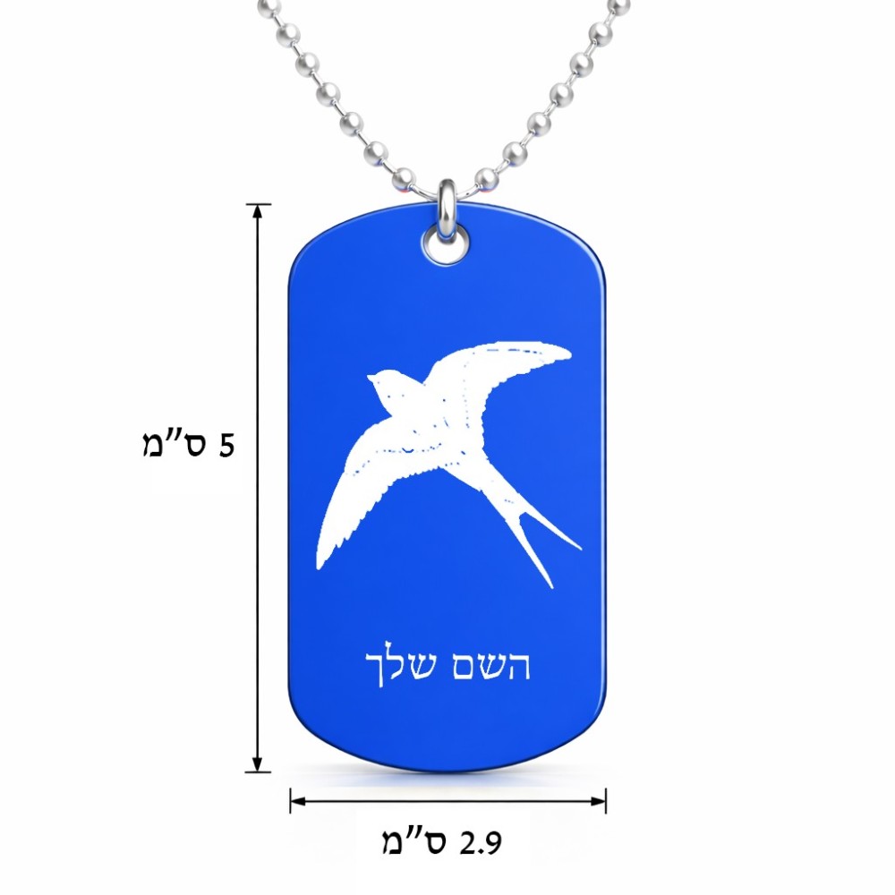 שרשרת דיסקיט מאלומיניום בעיצוב אישי עם השם שלך בעיצוב לבלוע גודל הדיסקיט 2.9 × 5 ס"מ. את השם המבוקש ניתן לציין בהזמנה, אם לא צויין אנחנו ניצור קשר לבירור.