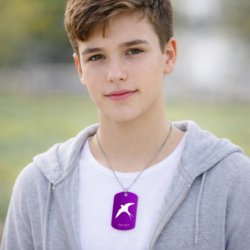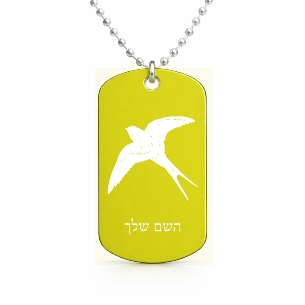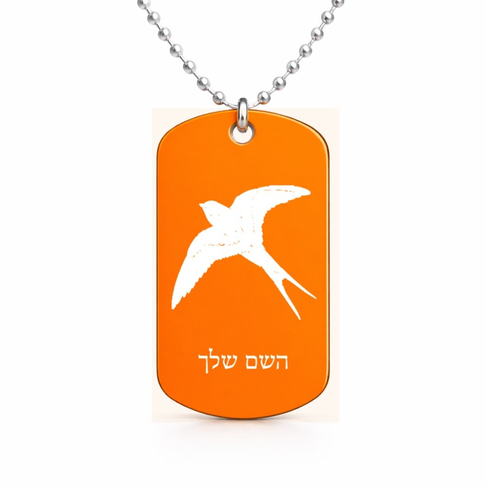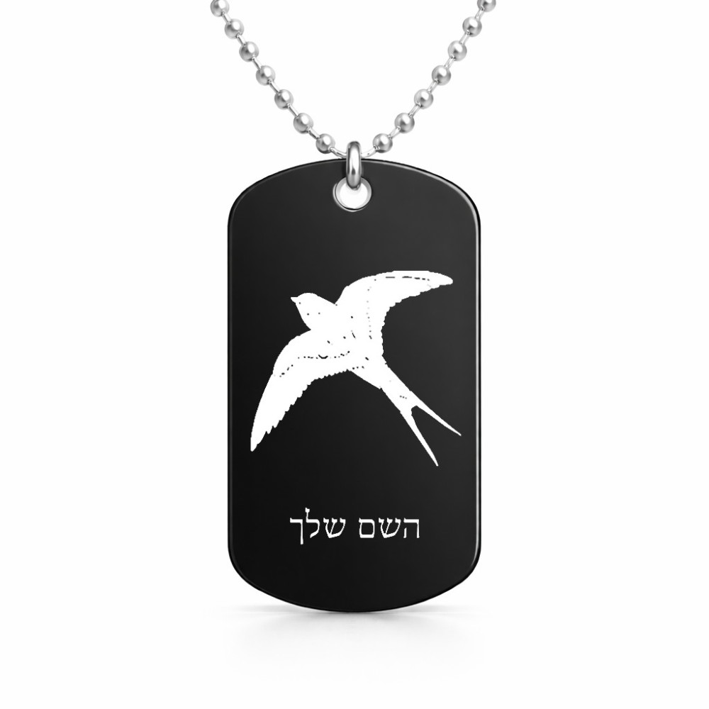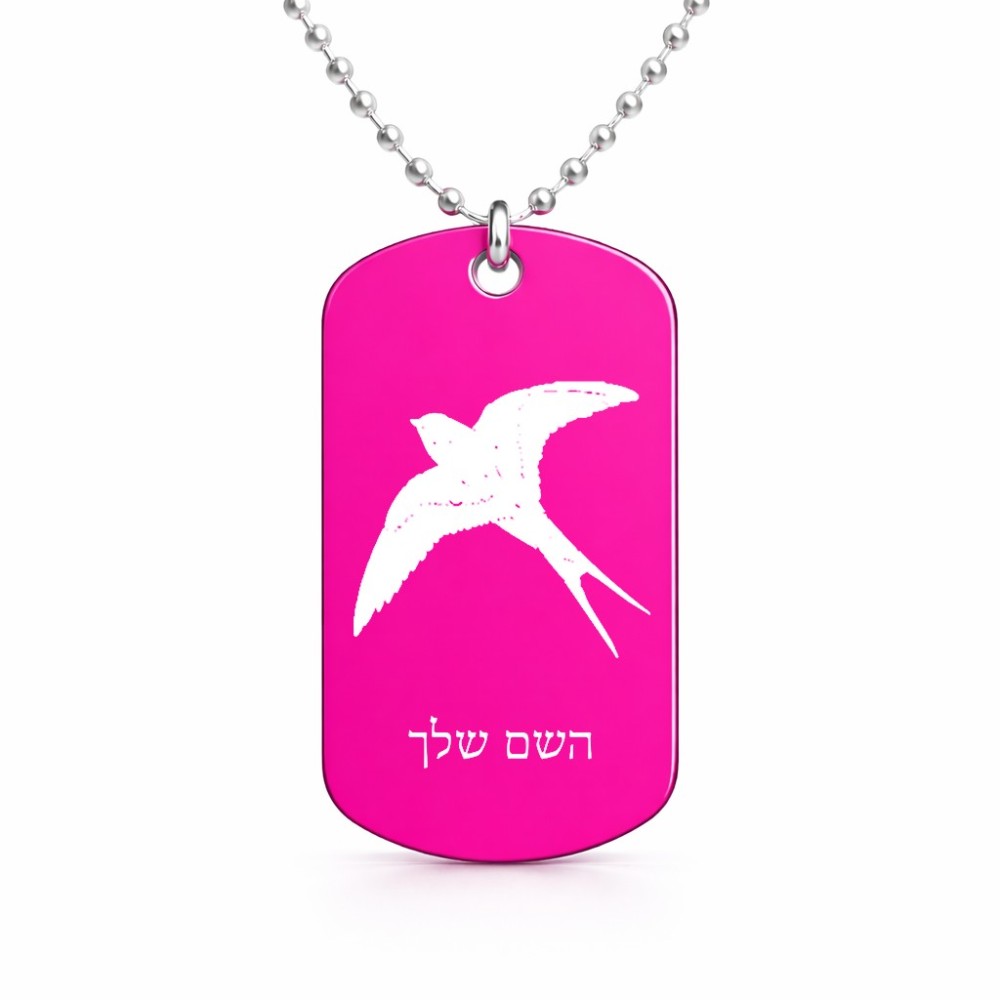 שרשרת דיסקיט מאלומיניום בעיצוב אישי עם השם שלך בעיצוב לבלוע גודל הדיסקיט 2.9 × 5 ס"מ. את השם המבוקש ניתן לציין בהזמנה, אם לא צויין אנחנו ניצור קשר לבירור.