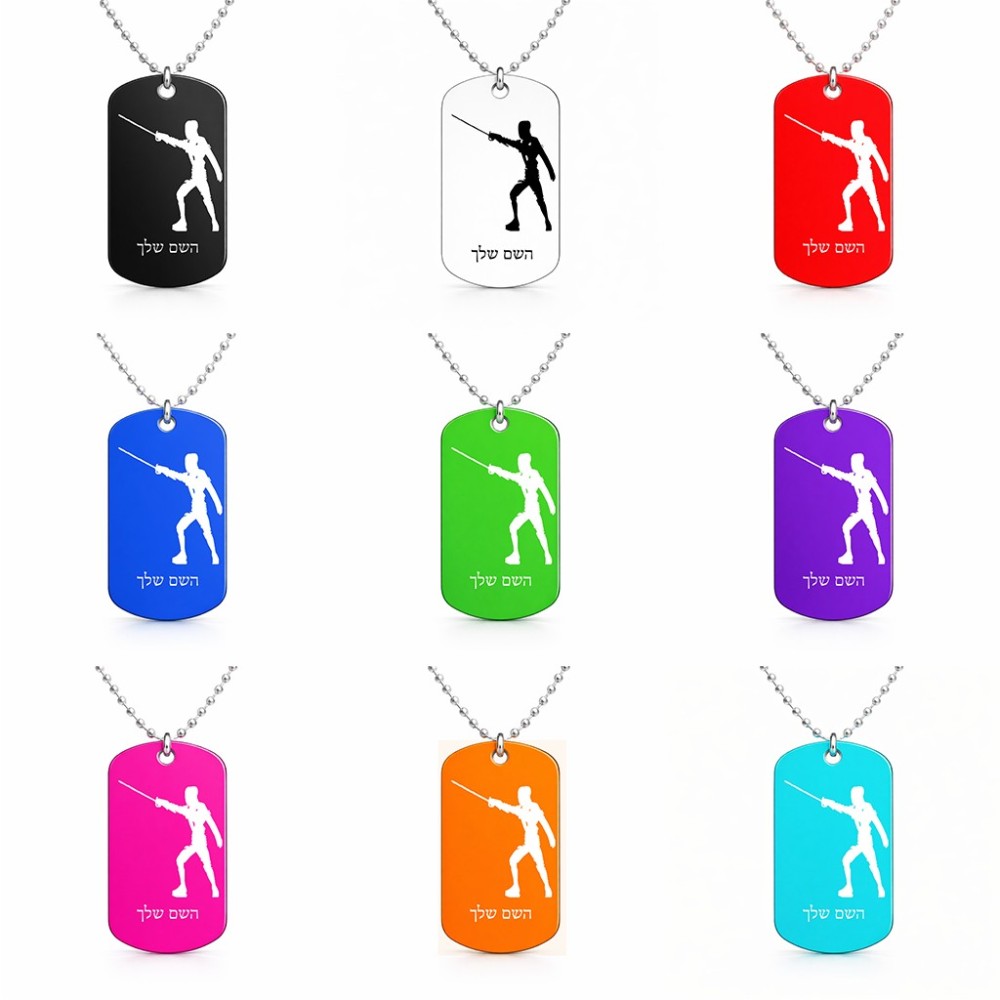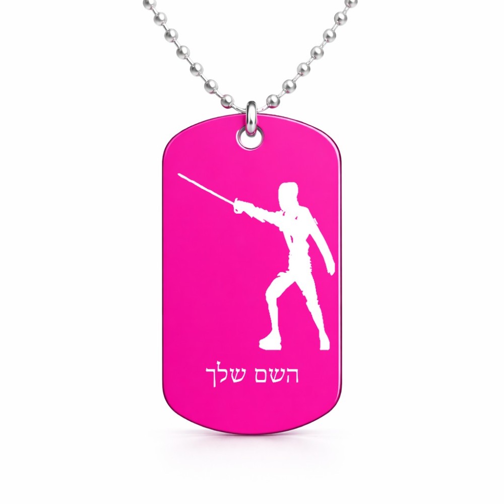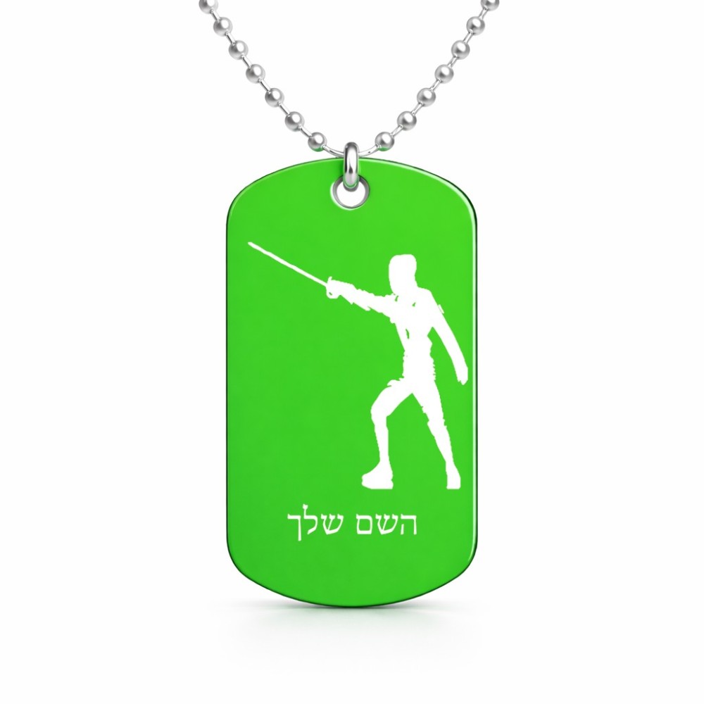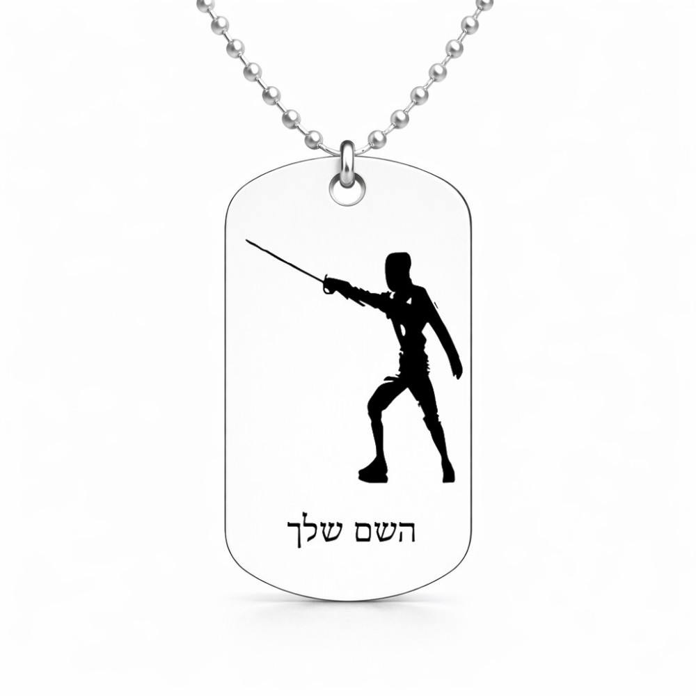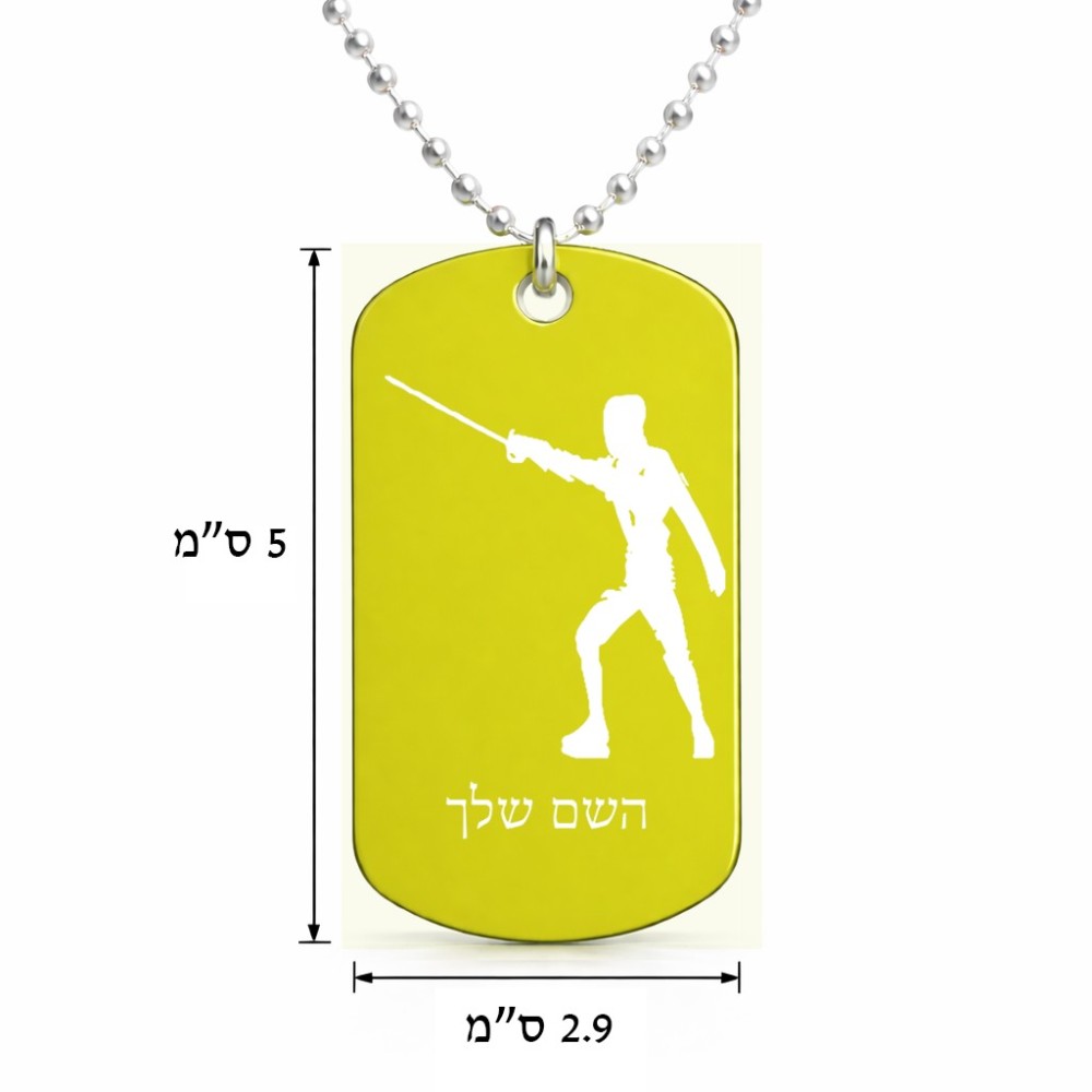 שרשרת דיסקיט מאלומיניום בעיצוב אישי עם השם שלך בעיצוב לוחם סייף גודל הדיסקיט 2.9 × 5 ס"מ. את השם המבוקש ניתן לציין בהזמנה, אם לא צויין אנחנו ניצור קשר לבירור.