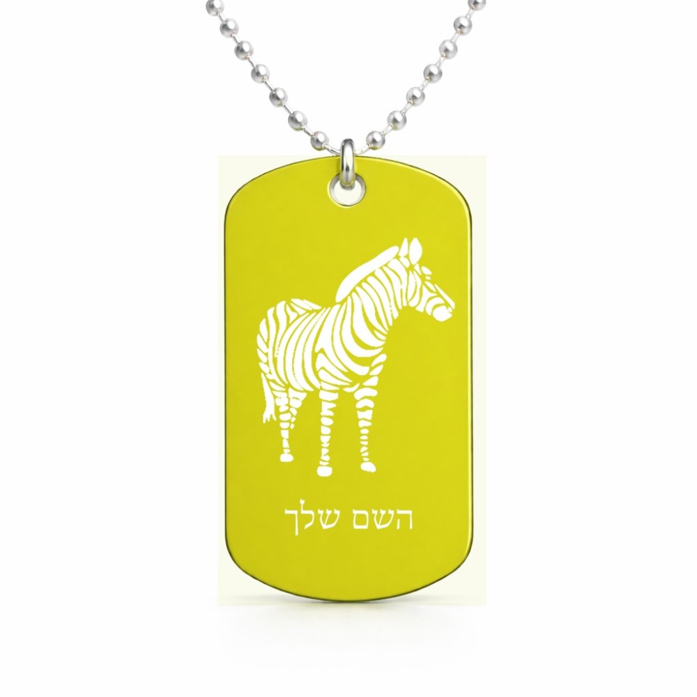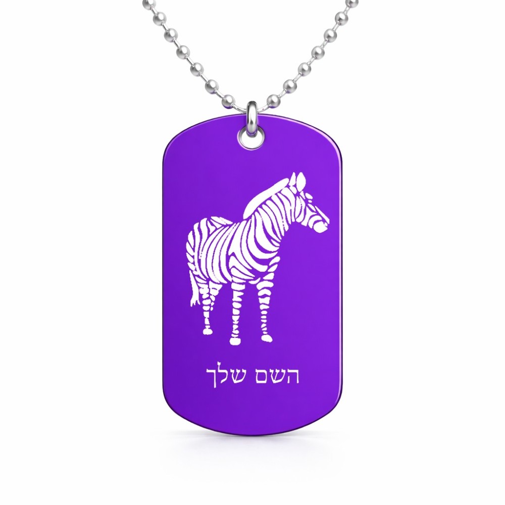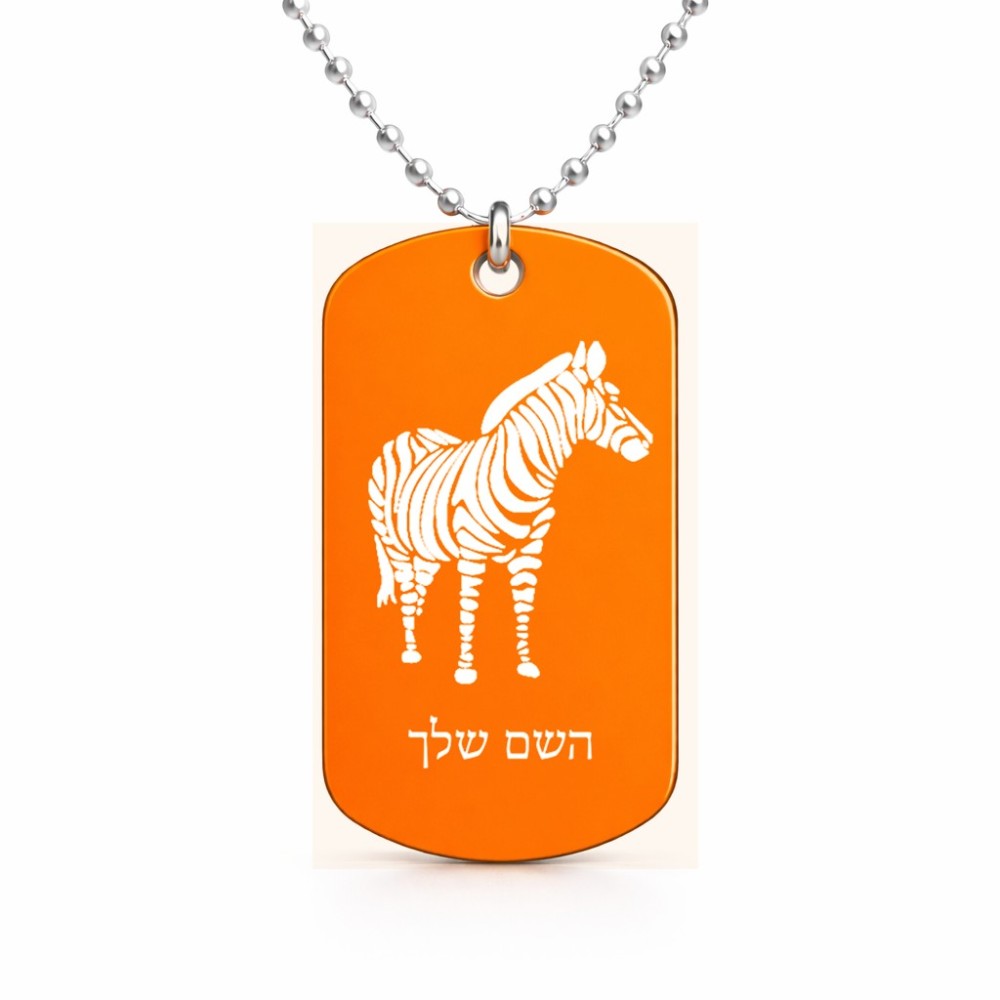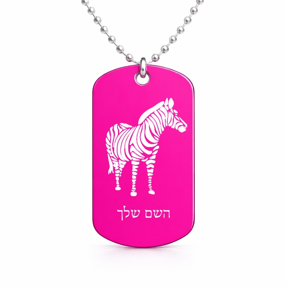 שרשרת דיסקיט מאלומיניום בעיצוב אישי עם השם שלך בעיצוב זברה גודל הדיסקיט 2.9 × 5 ס"מ. את השם המבוקש ניתן לציין בהזמנה, אם לא צויין אנחנו ניצור קשר לבירור.