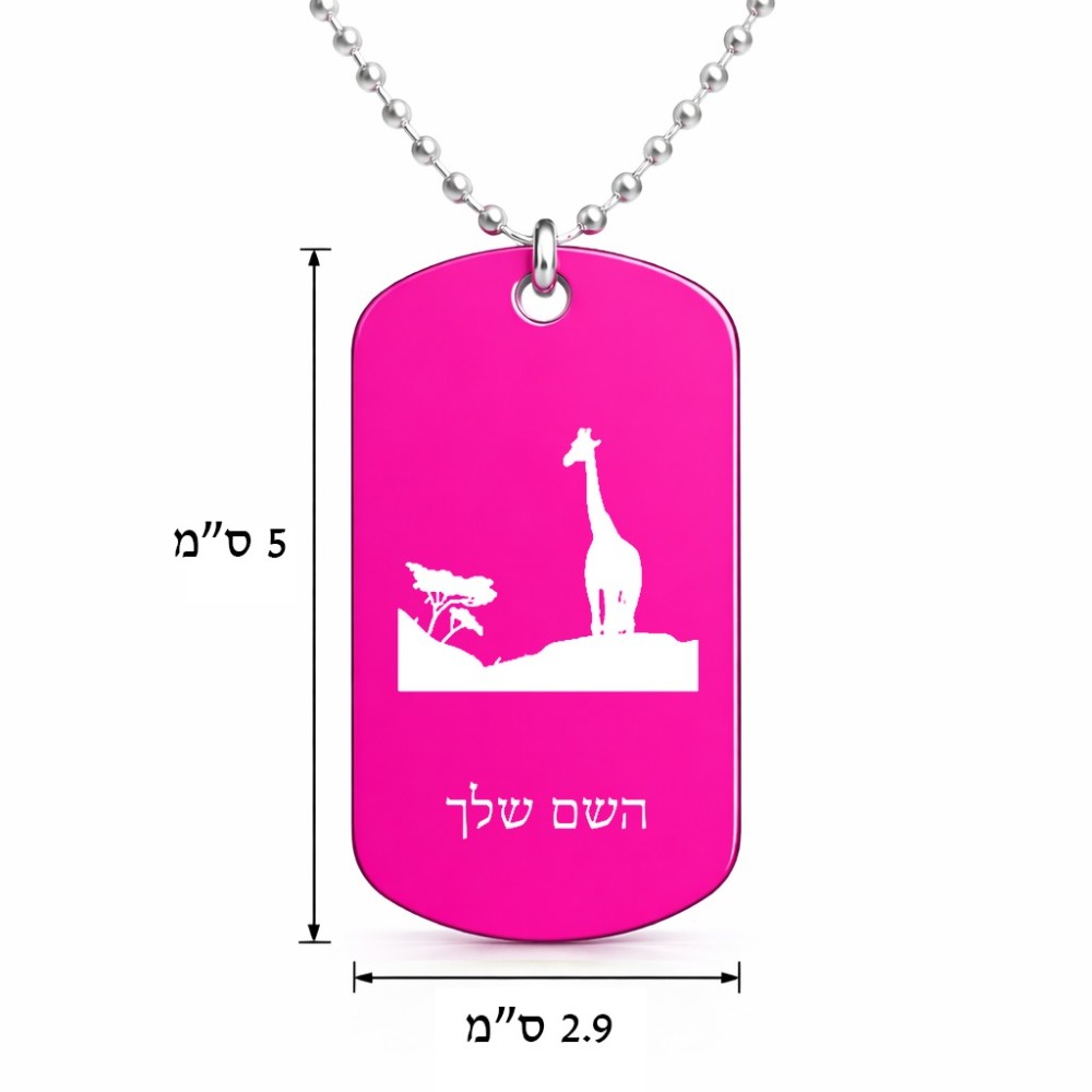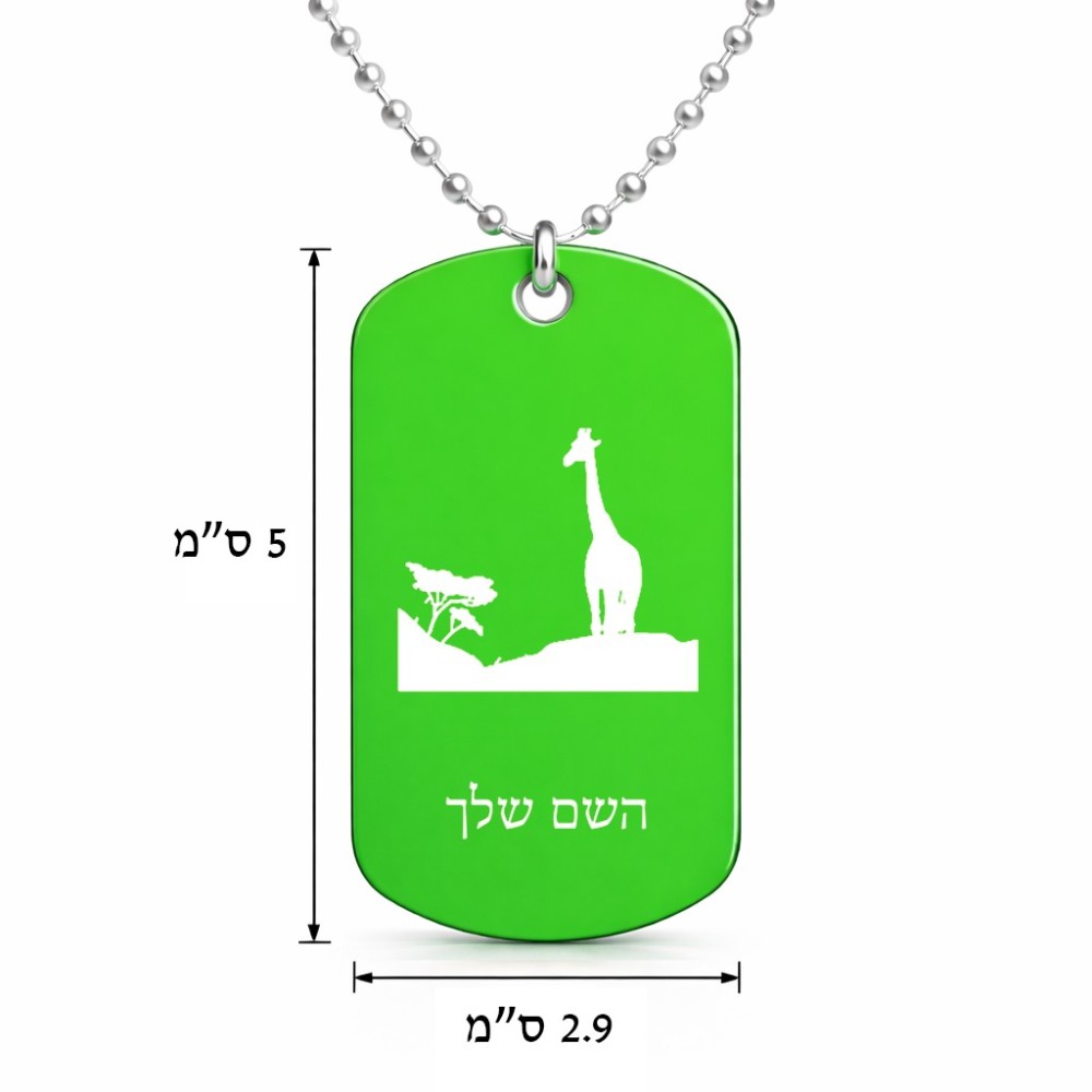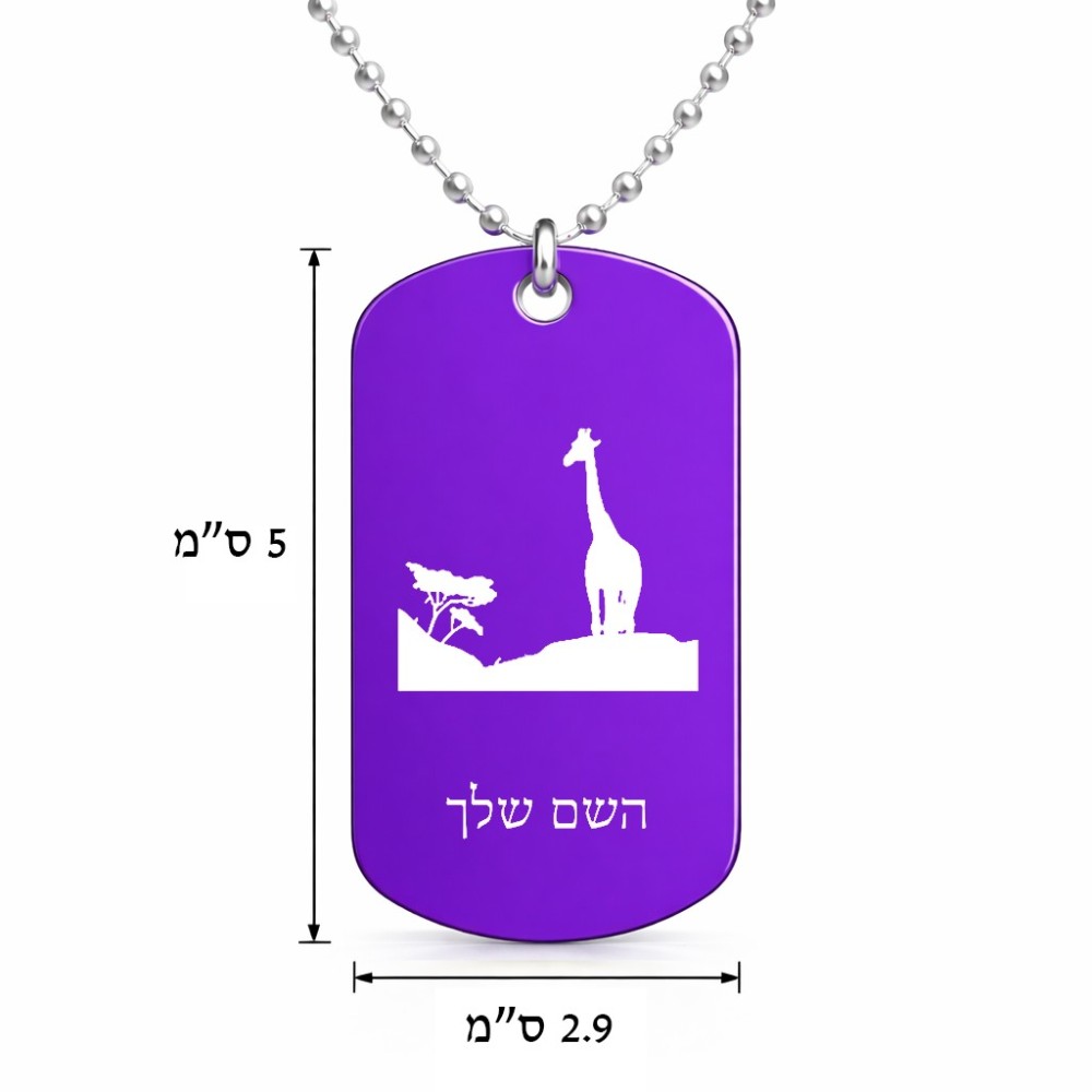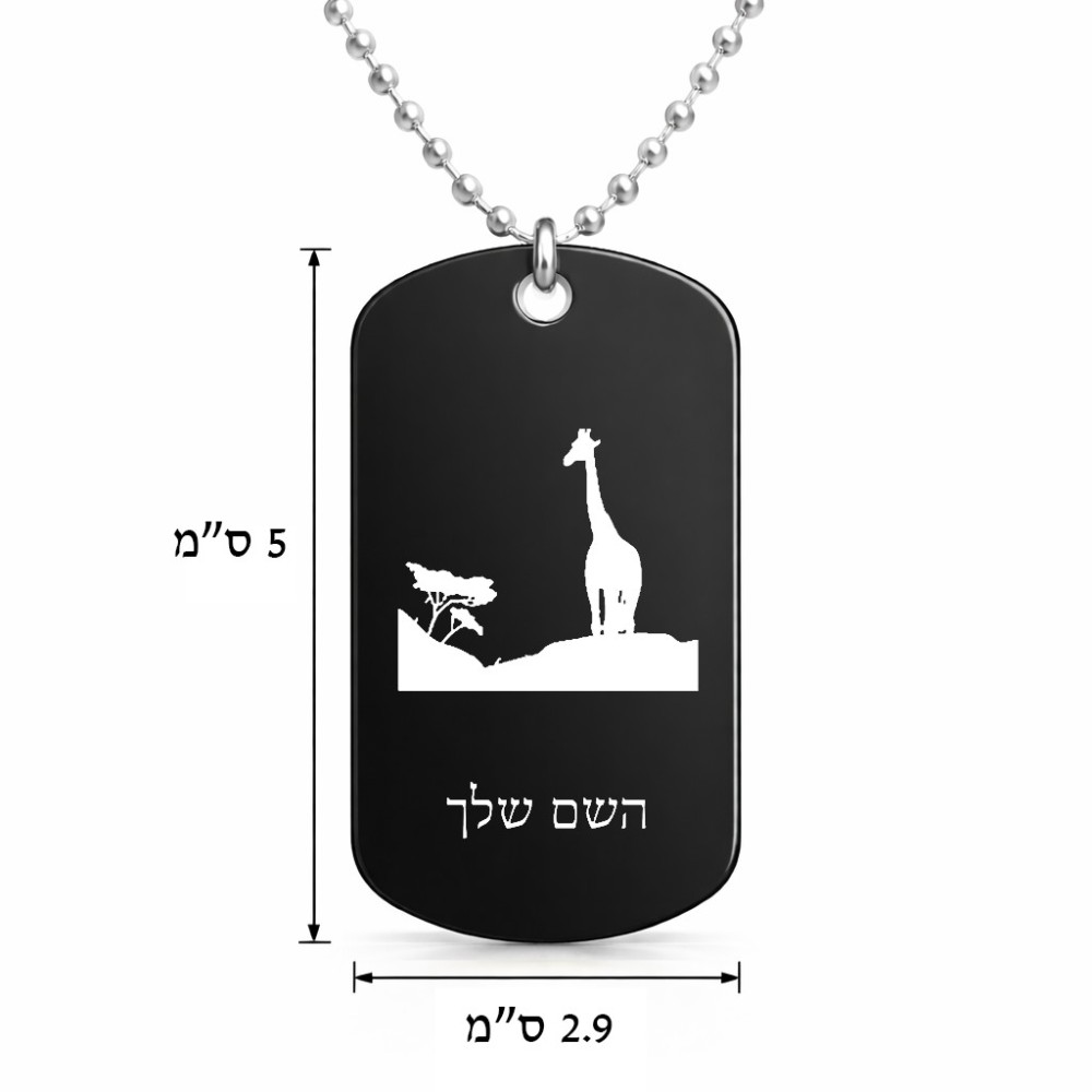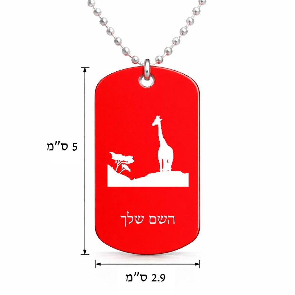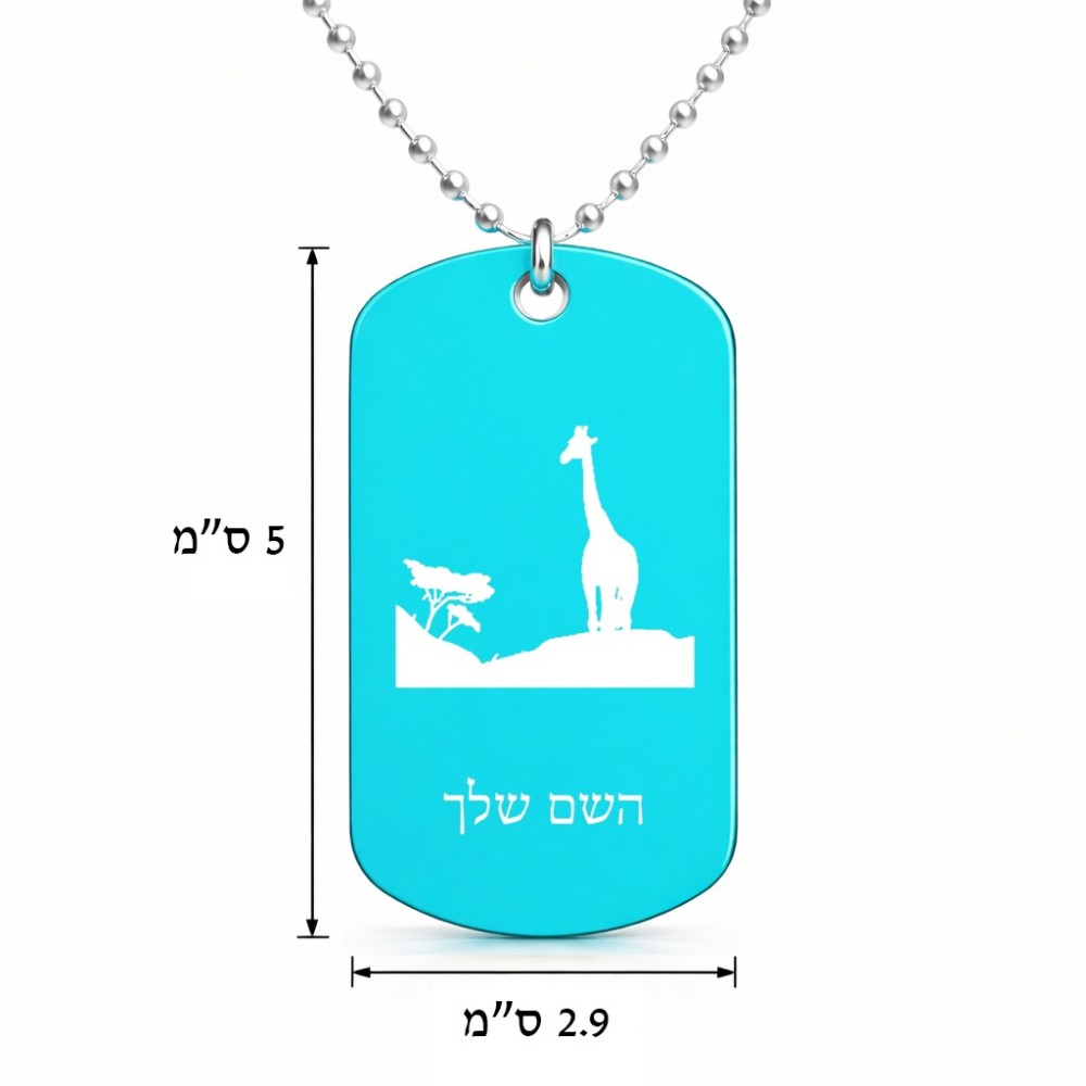 שרשרת דיסקיט מאלומיניום בעיצוב אישי עם השם שלך בעיצוב ג'ירפה באפריקה גודל הדיסקיט 2.9 × 5 ס"מ. את השם המבוקש ניתן לציין בהזמנה, אם לא צויין אנחנו ניצור קשר לבירור.
