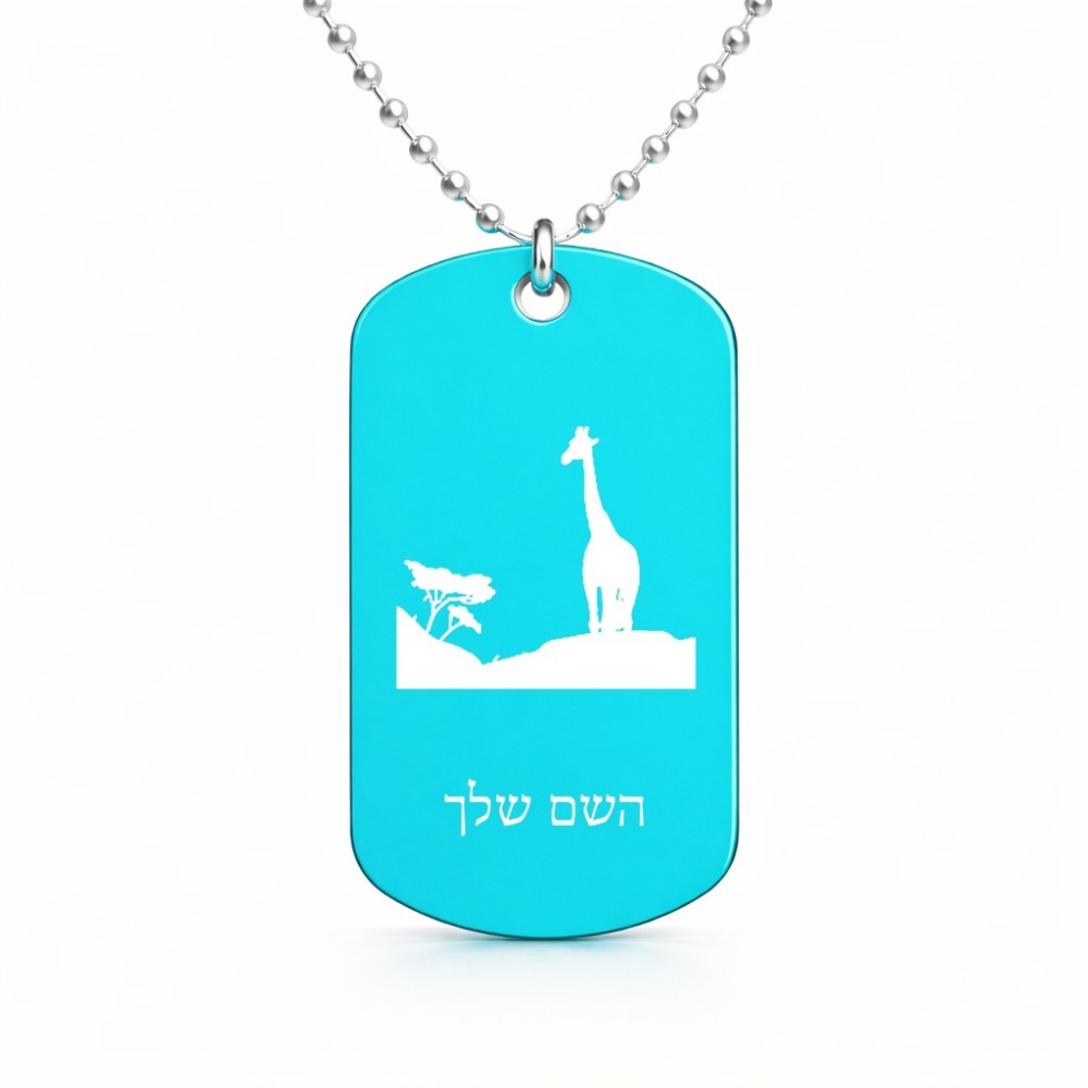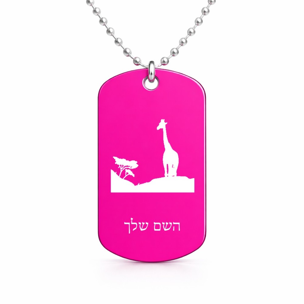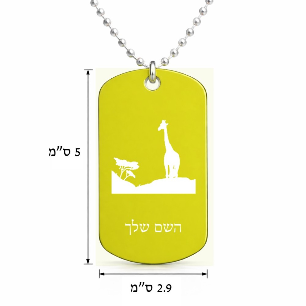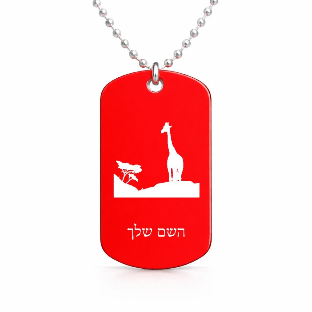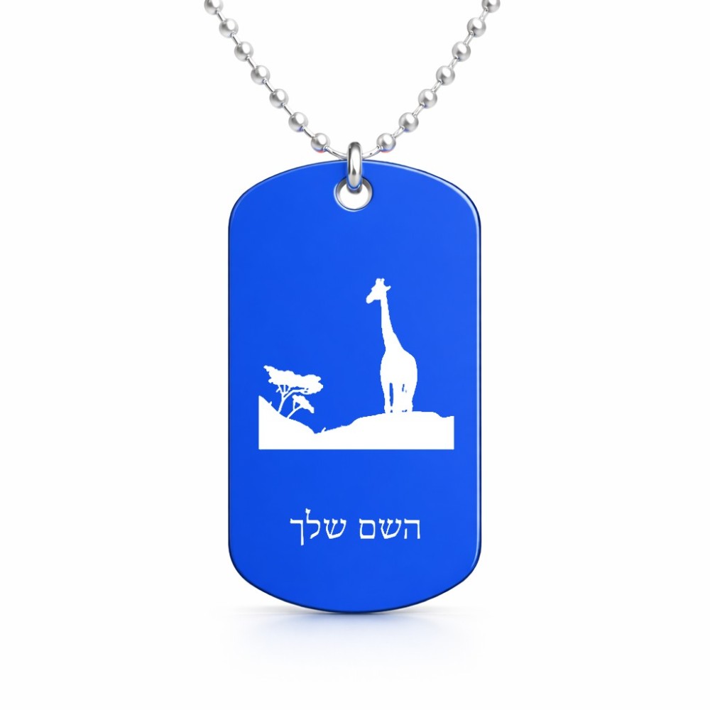 שרשרת דיסקיט מאלומיניום בעיצוב אישי עם השם שלך בעיצוב ג'ירפה באפריקה גודל הדיסקיט 2.9 × 5 ס"מ. את השם המבוקש ניתן לציין בהזמנה, אם לא צויין אנחנו ניצור קשר לבירור.