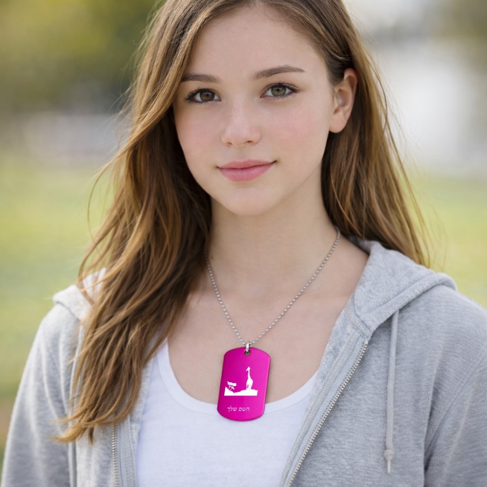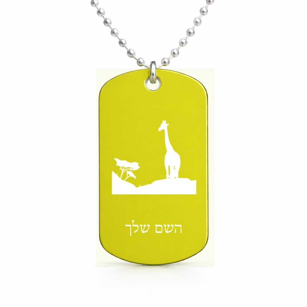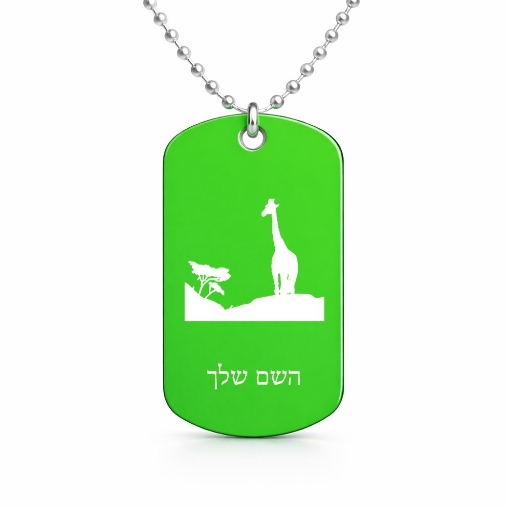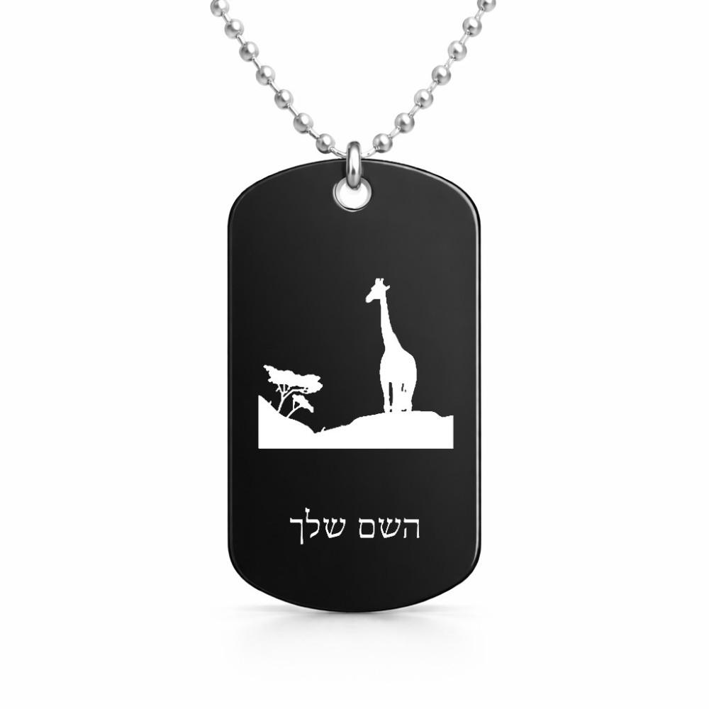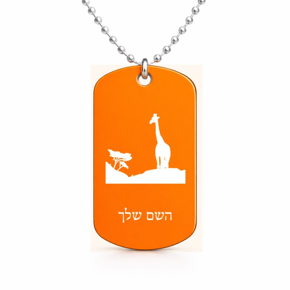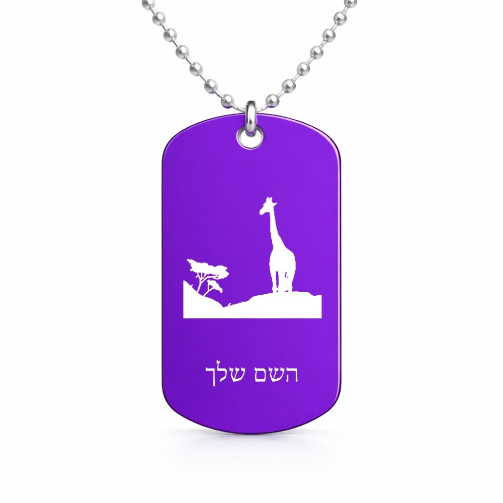 שרשרת דיסקיט מאלומיניום בעיצוב אישי עם השם שלך בעיצוב ג'ירפה באפריקה גודל הדיסקיט 2.9 × 5 ס"מ. את השם המבוקש ניתן לציין בהזמנה, אם לא צויין אנחנו ניצור קשר לבירור.