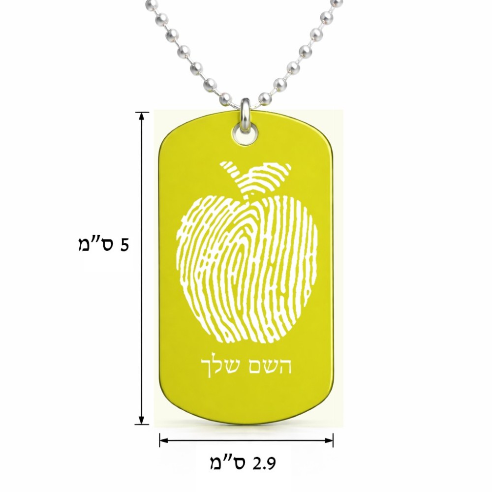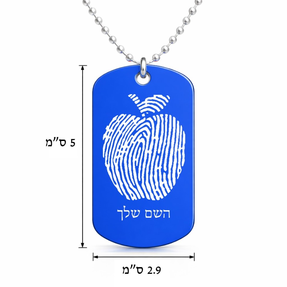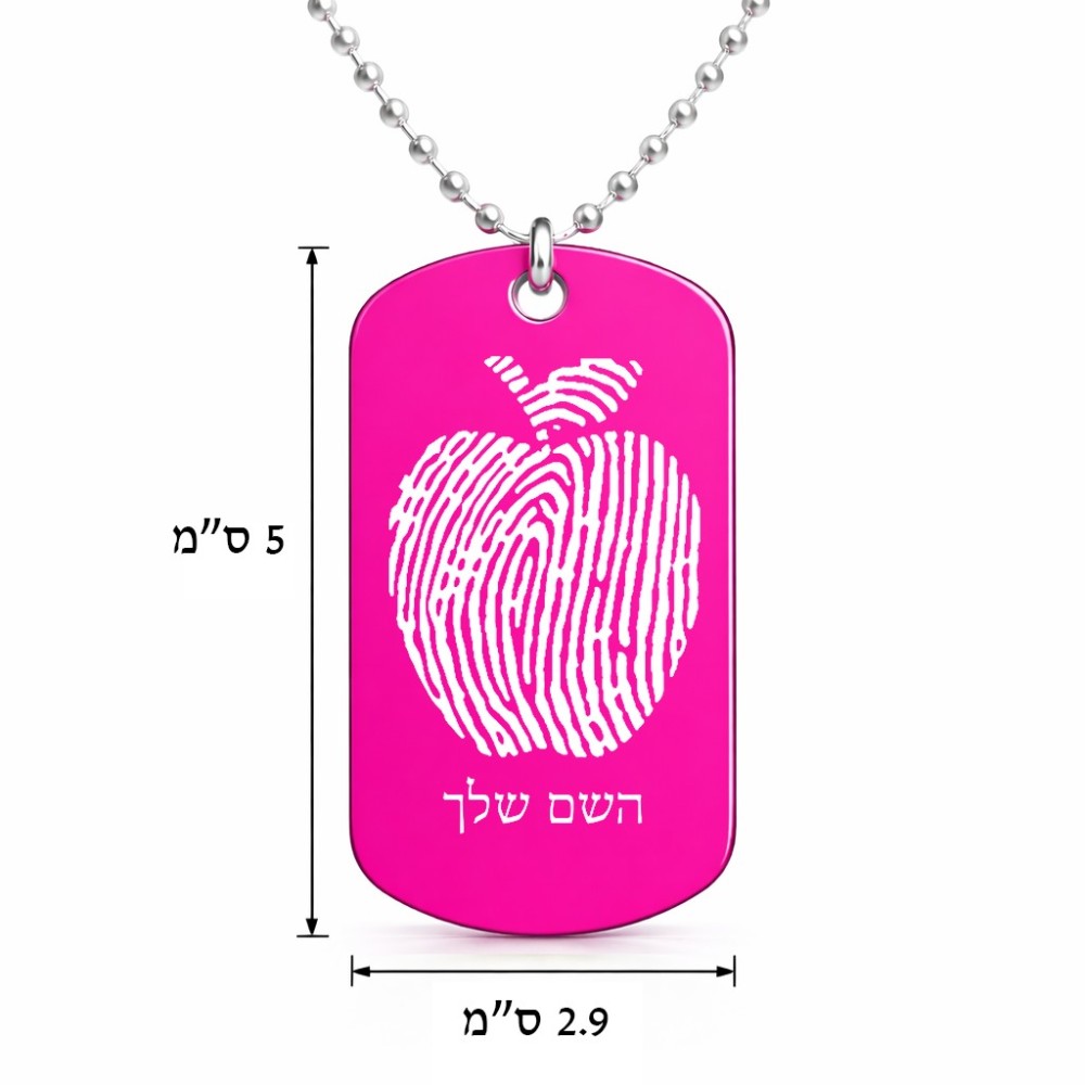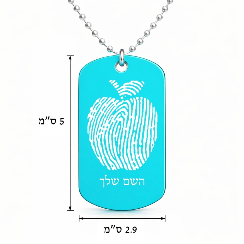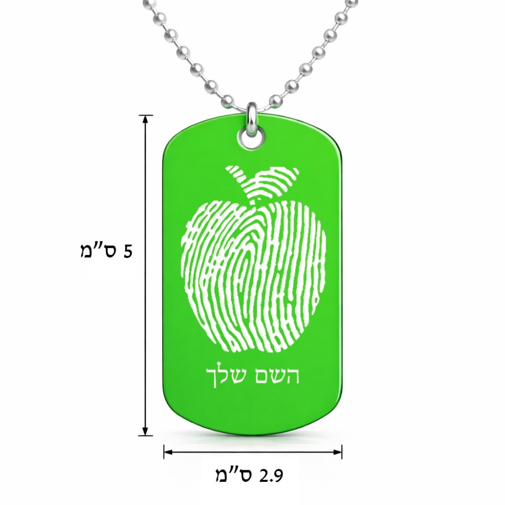 שרשרת דיסקיט מאלומיניום בעיצוב אישי עם השם שלך בעיצוב הדפס תפוח גודל הדיסקיט 2.9 × 5 ס"מ. את השם המבוקש ניתן לציין בהזמנה, אם לא צויין אנחנו ניצור קשר לבירור.