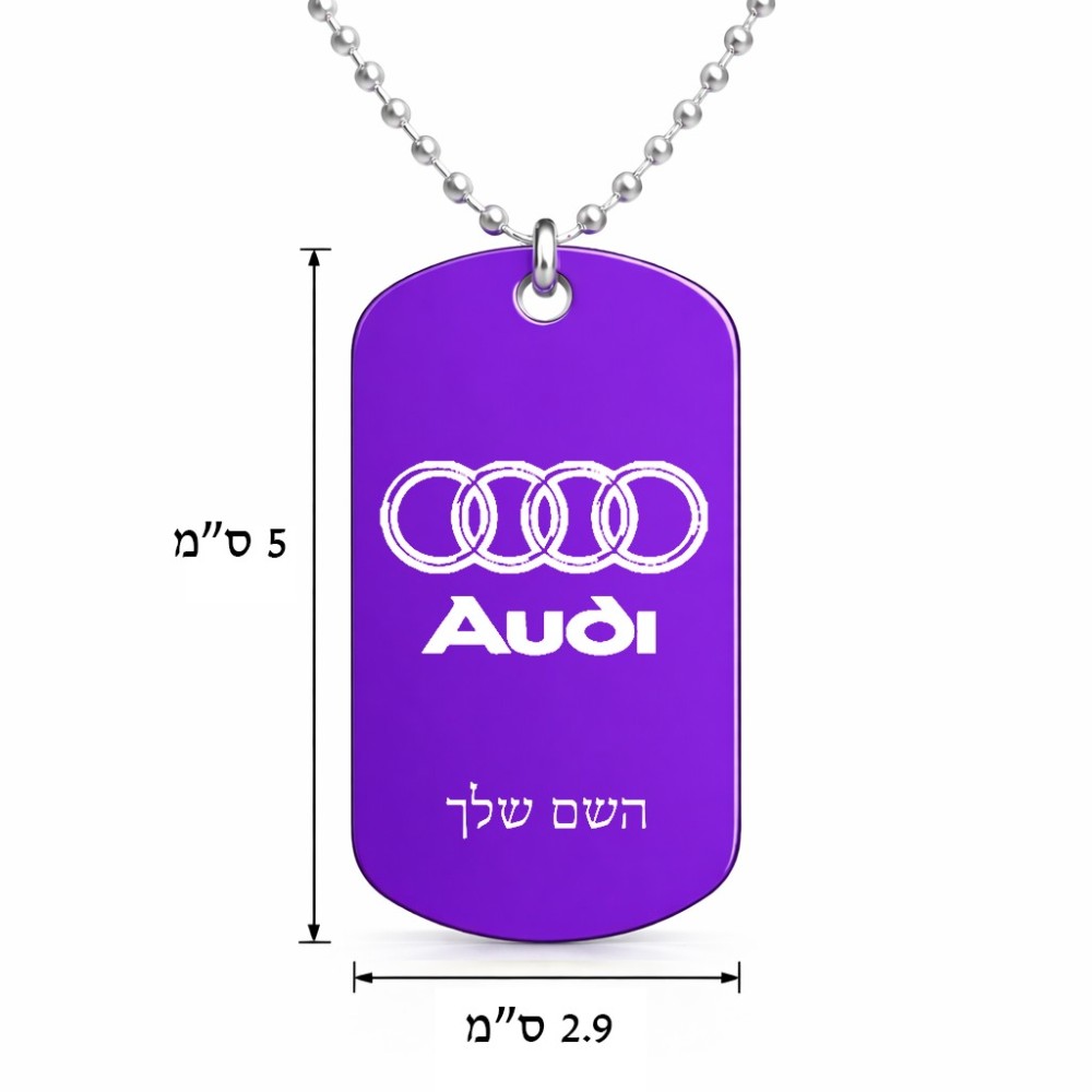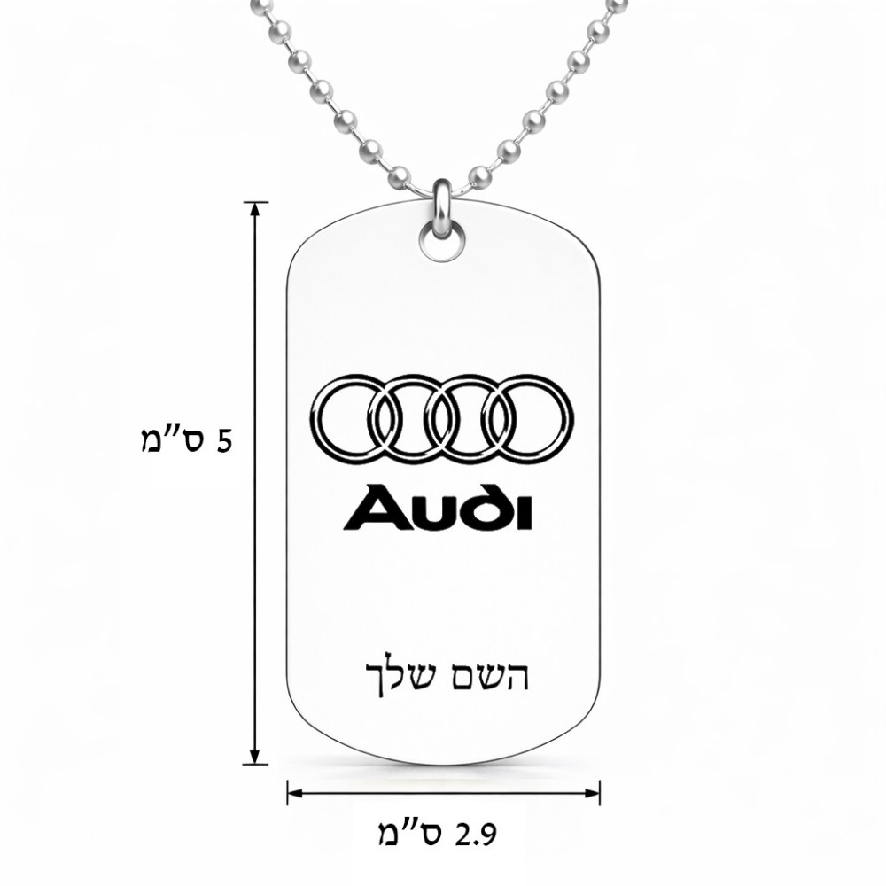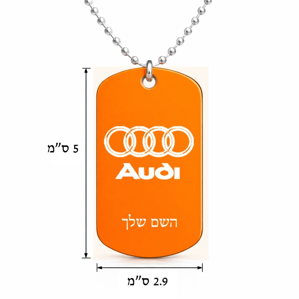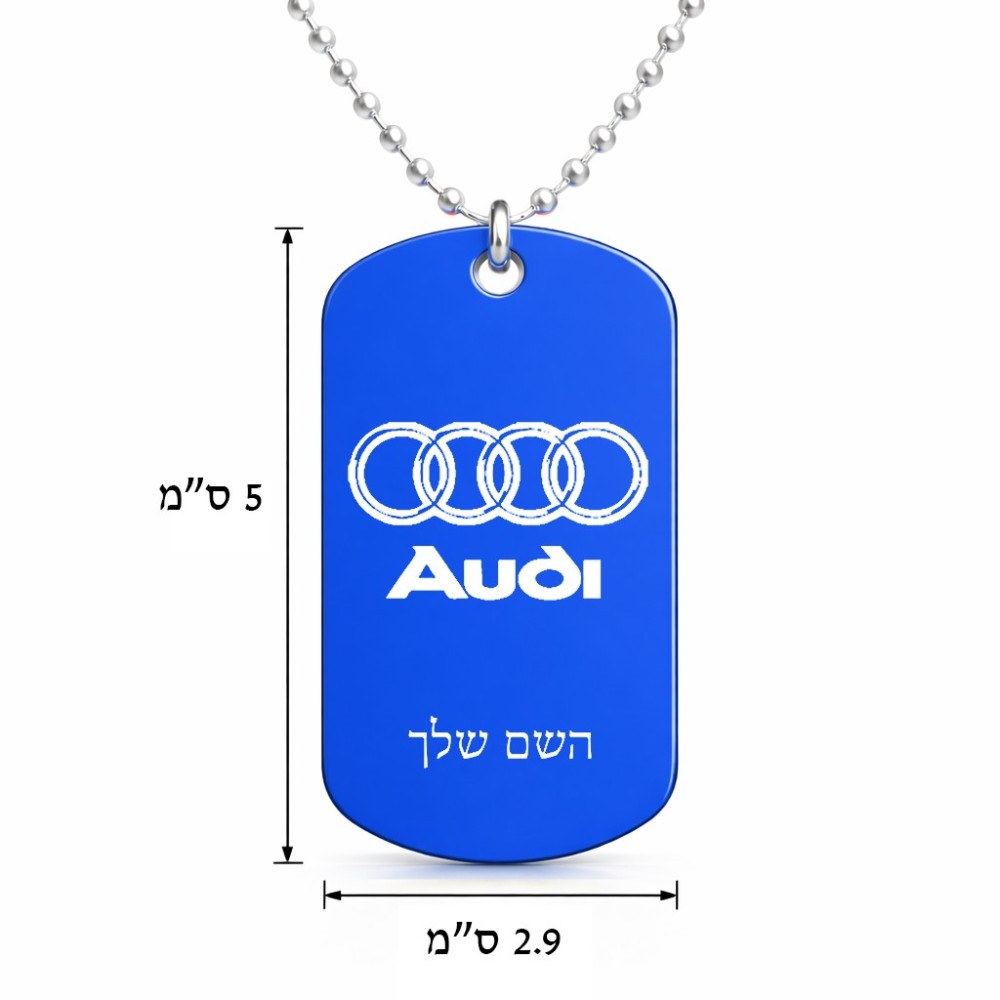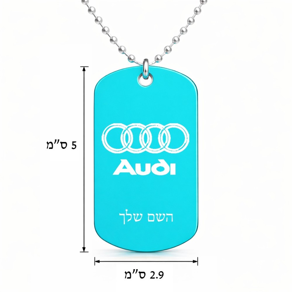 שרשרת דיסקיט מאלומיניום בעיצוב אישי עם השם שלך בעיצוב אאודי גודל הדיסקיט 2.9 × 5 ס"מ