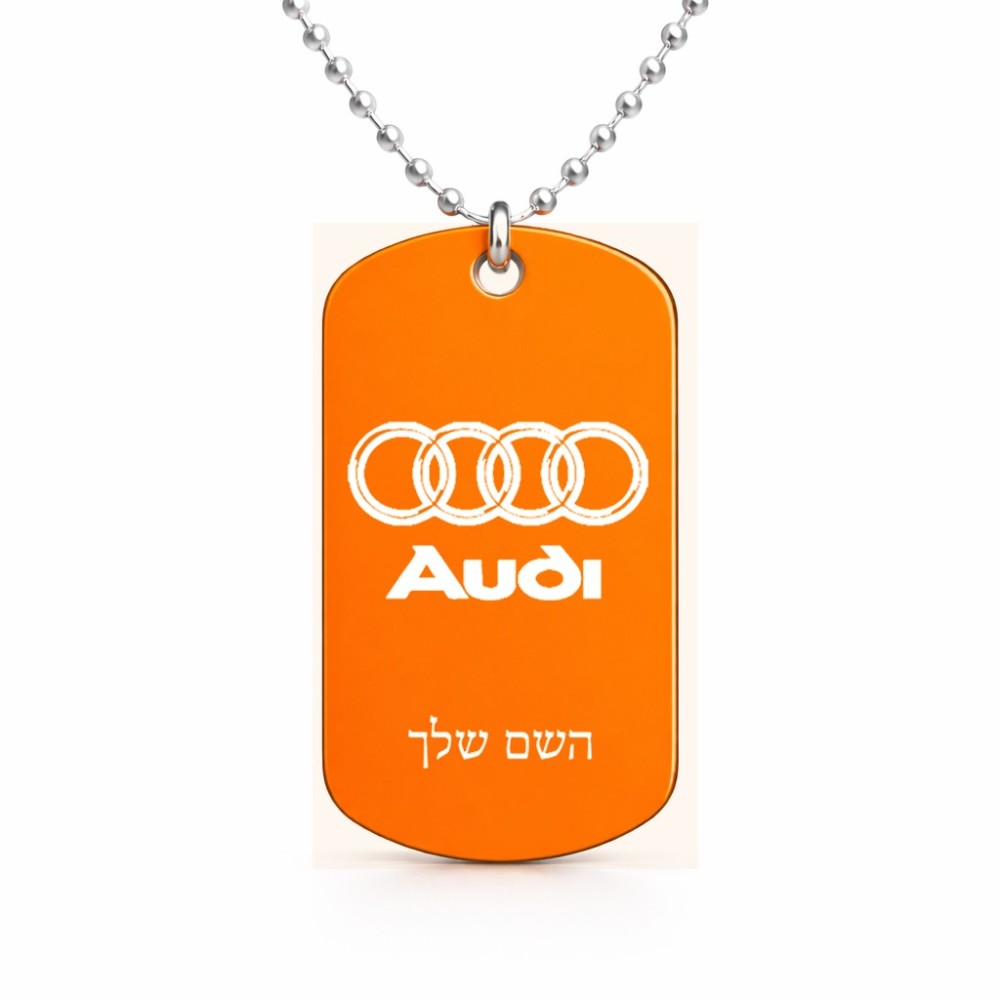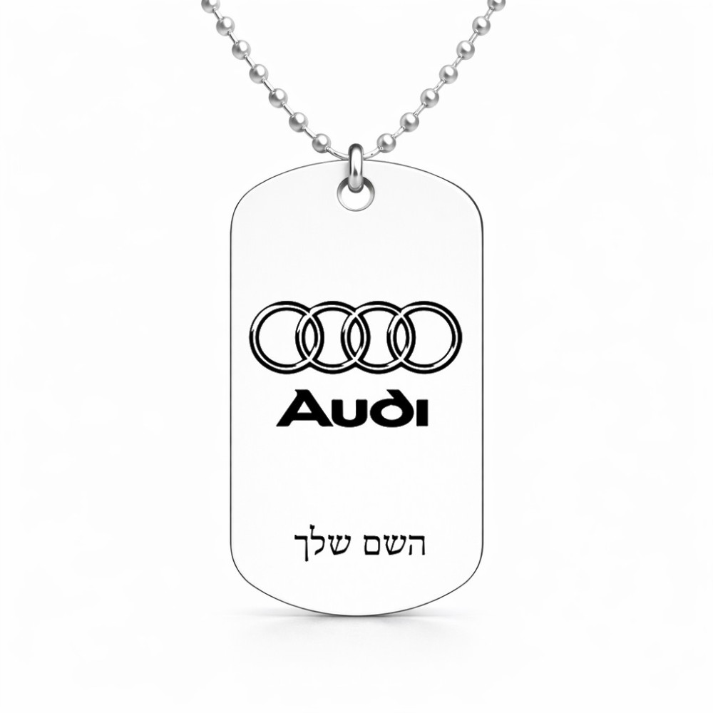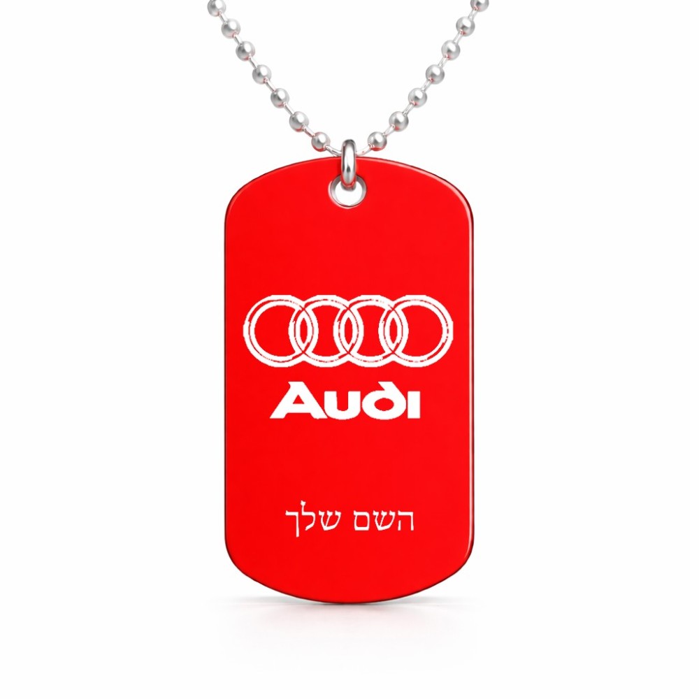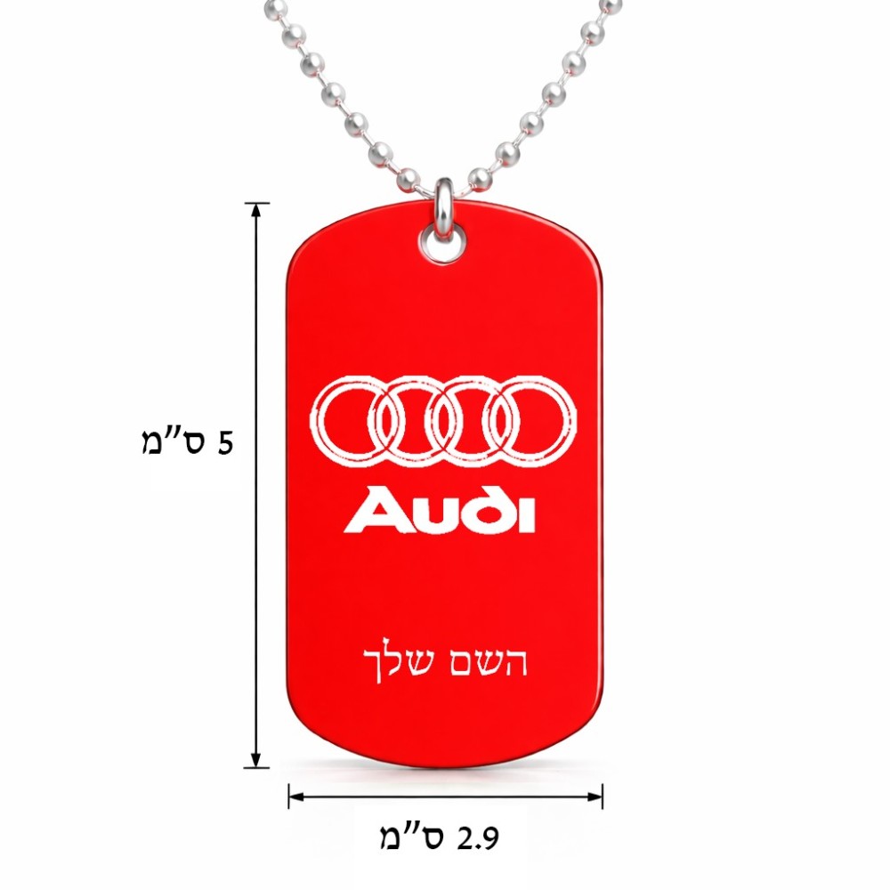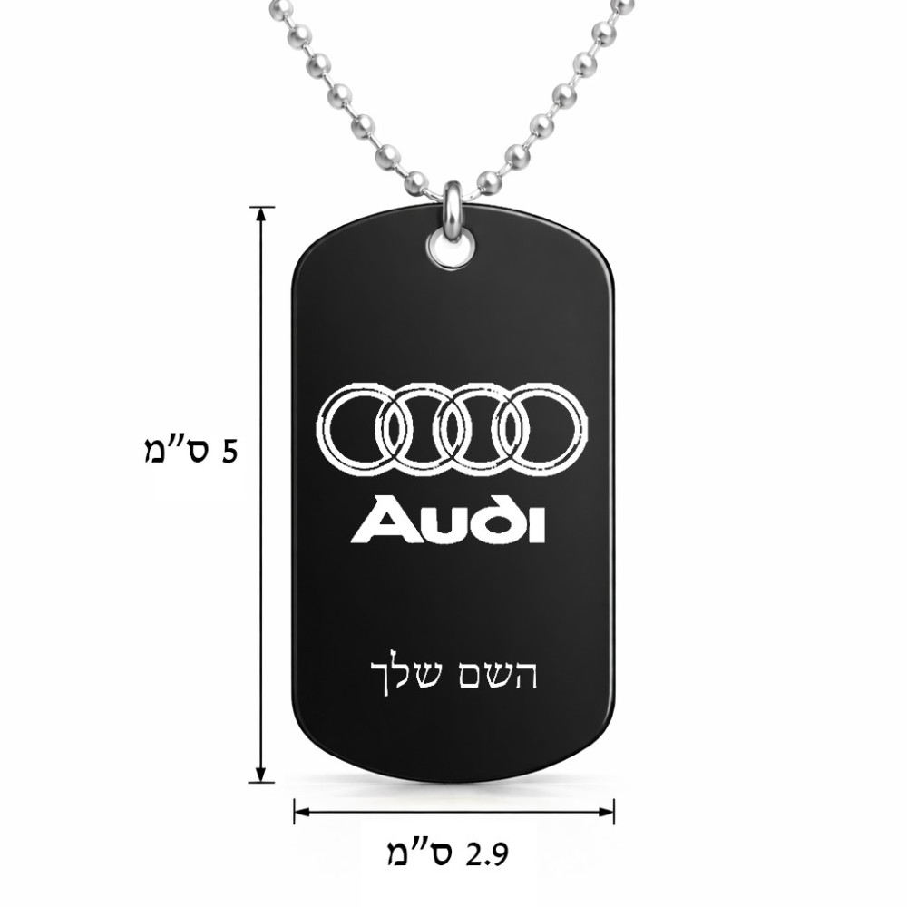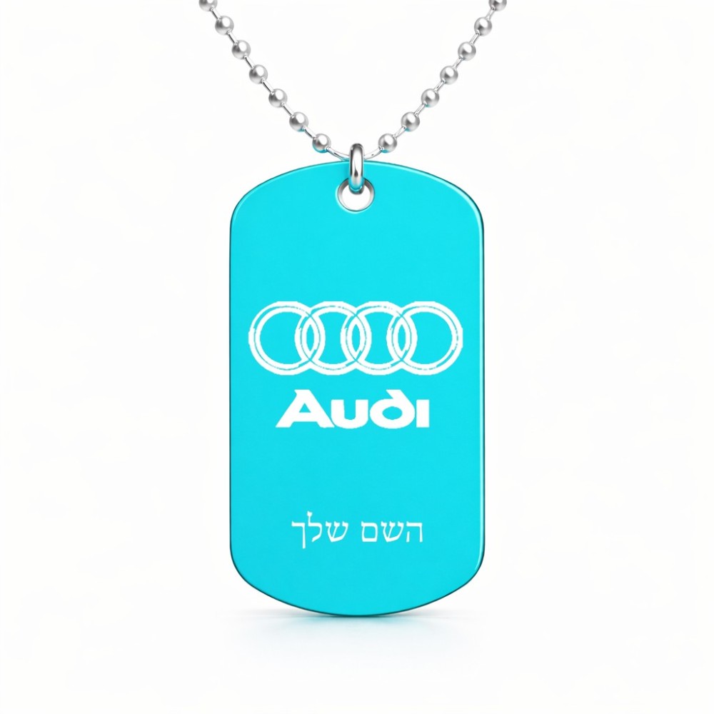 שרשרת דיסקיט מאלומיניום בעיצוב אישי עם השם שלך בעיצוב אאודי גודל הדיסקיט 2.9 × 5 ס"מ