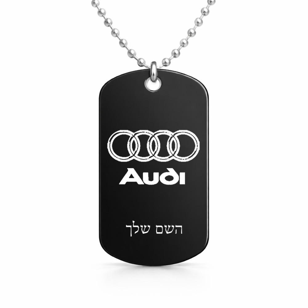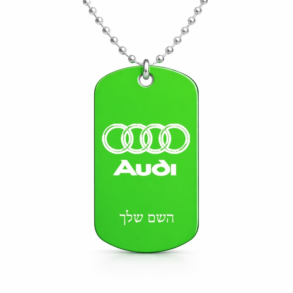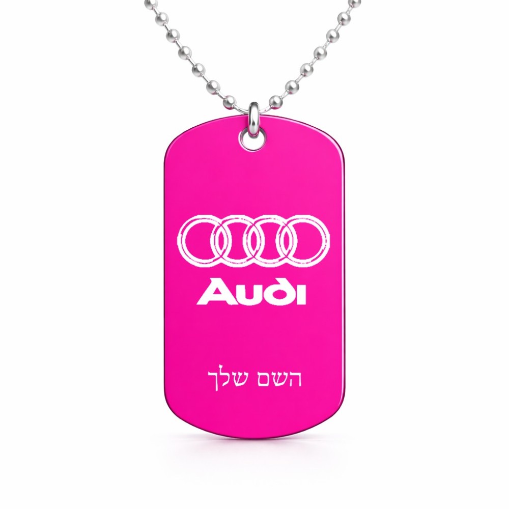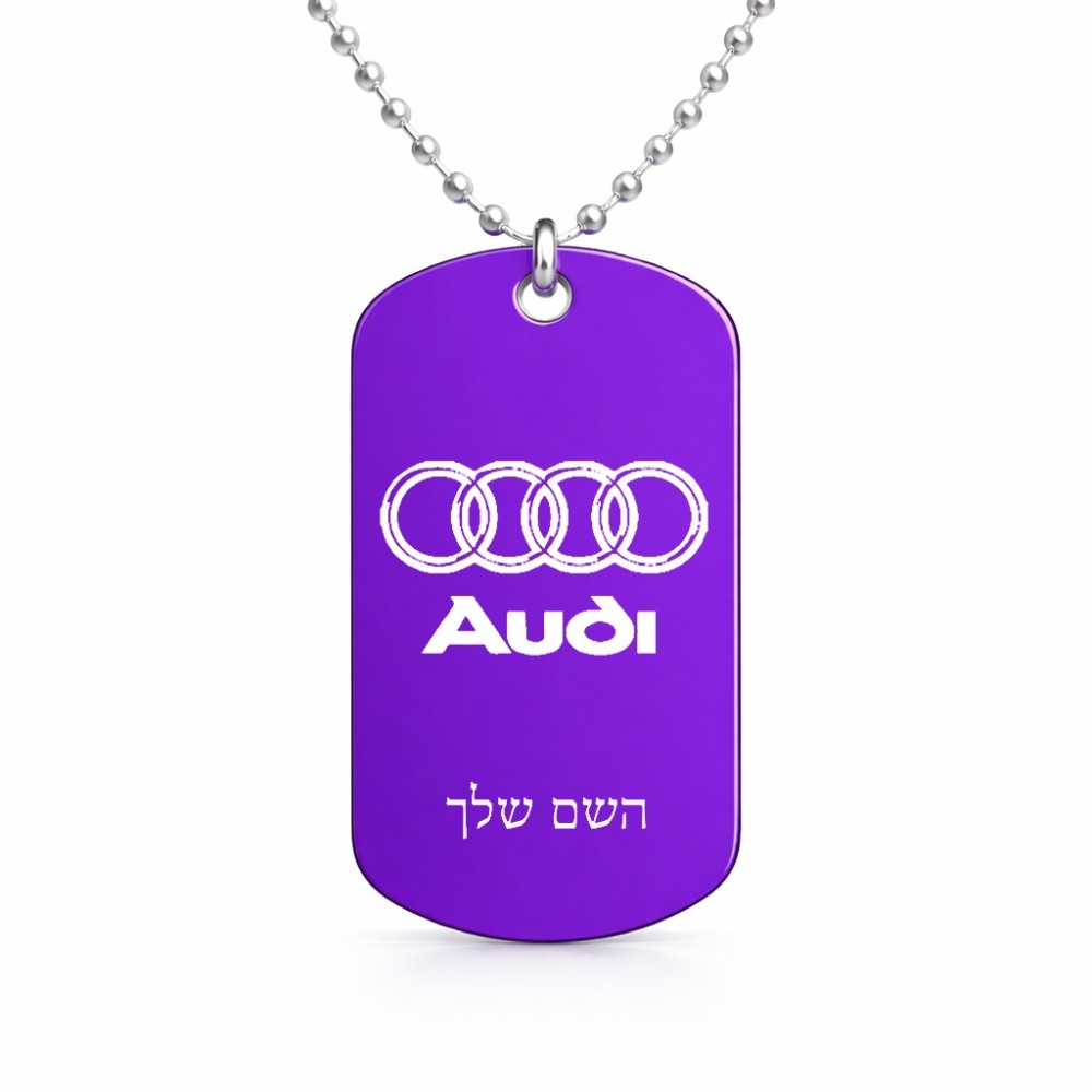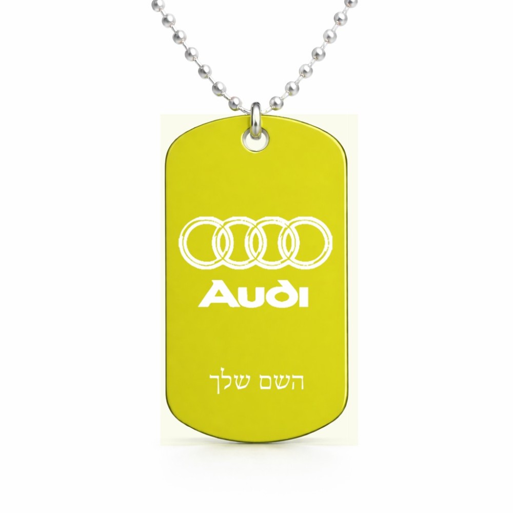 שרשרת דיסקיט מאלומיניום בעיצוב אישי עם השם שלך בעיצוב אאודי גודל הדיסקיט 2.9 × 5 ס"מ