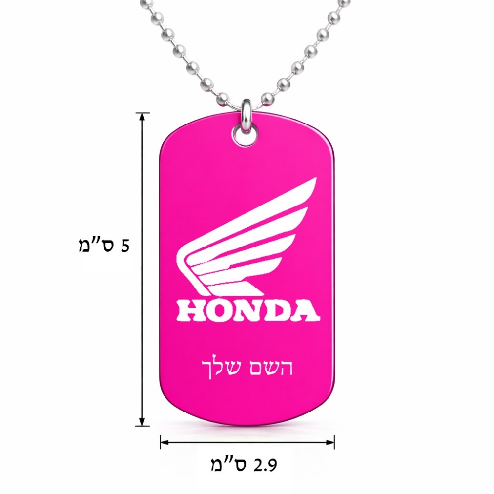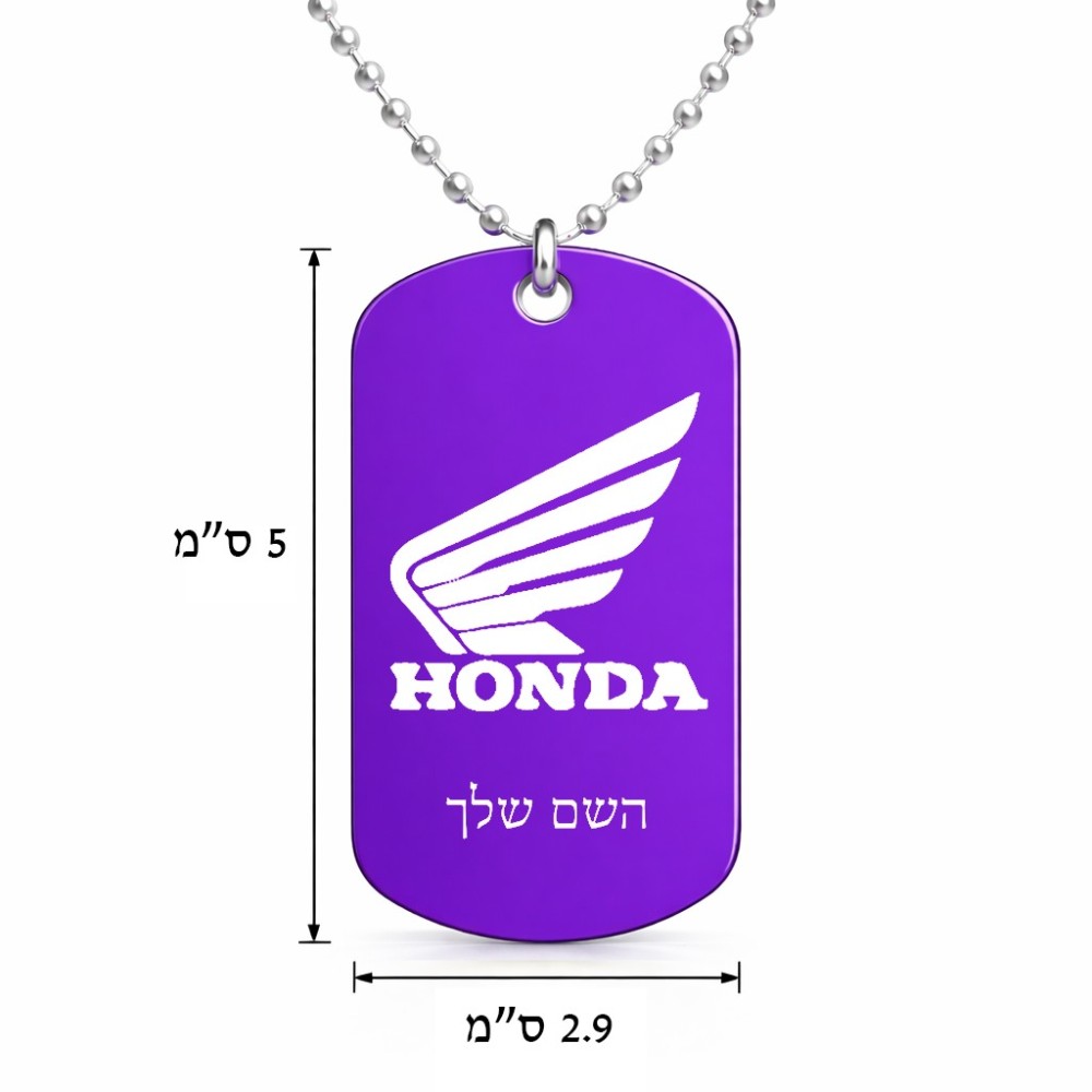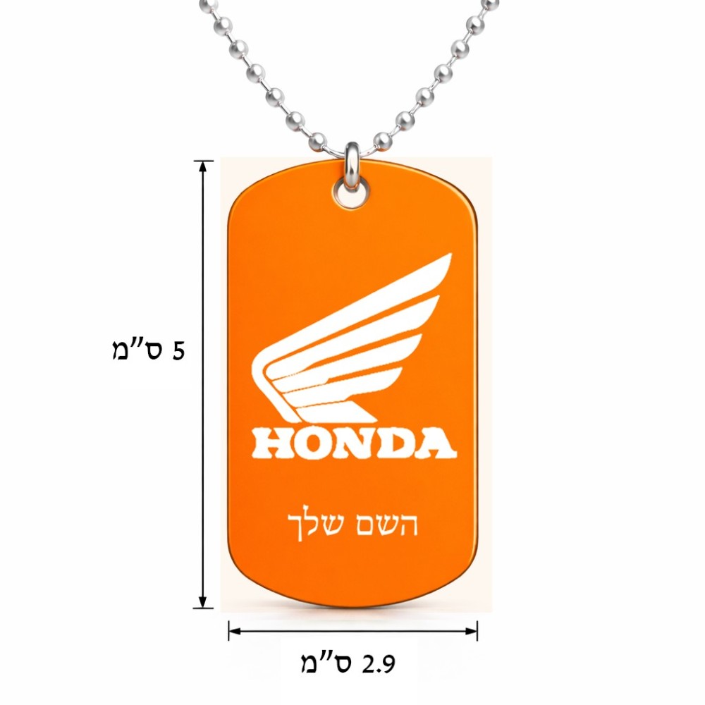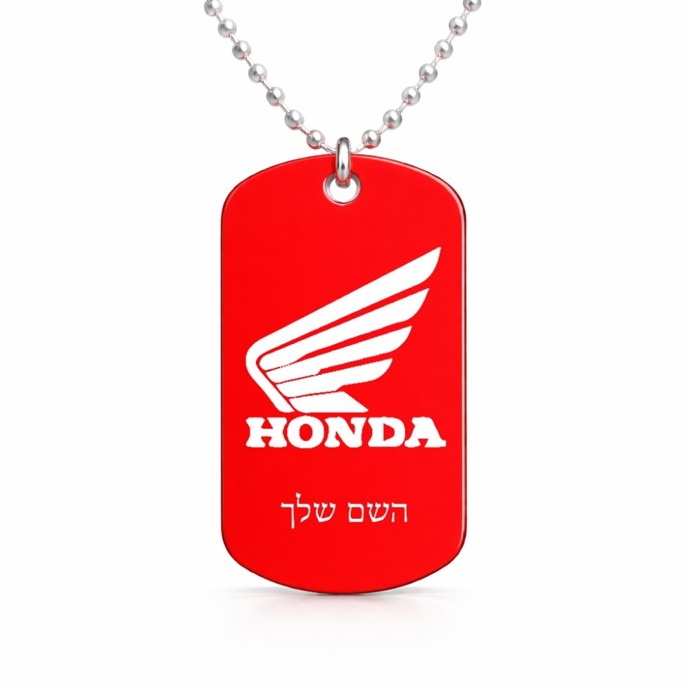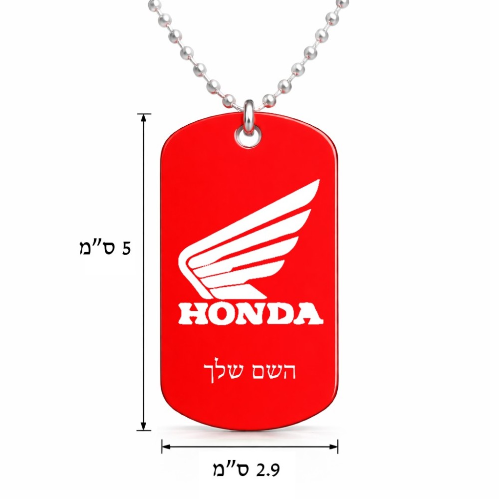 שרשרת דיסקיט מאלומיניום בעיצוב אישי עם השם שלך בעיצוב הונדה גודל הדיסקיט 2.9 × 5 ס"מ. את השם המבוקש ניתן לציין בהזמנה, אם לא צויין אנחנו ניצור קשר לבירור.