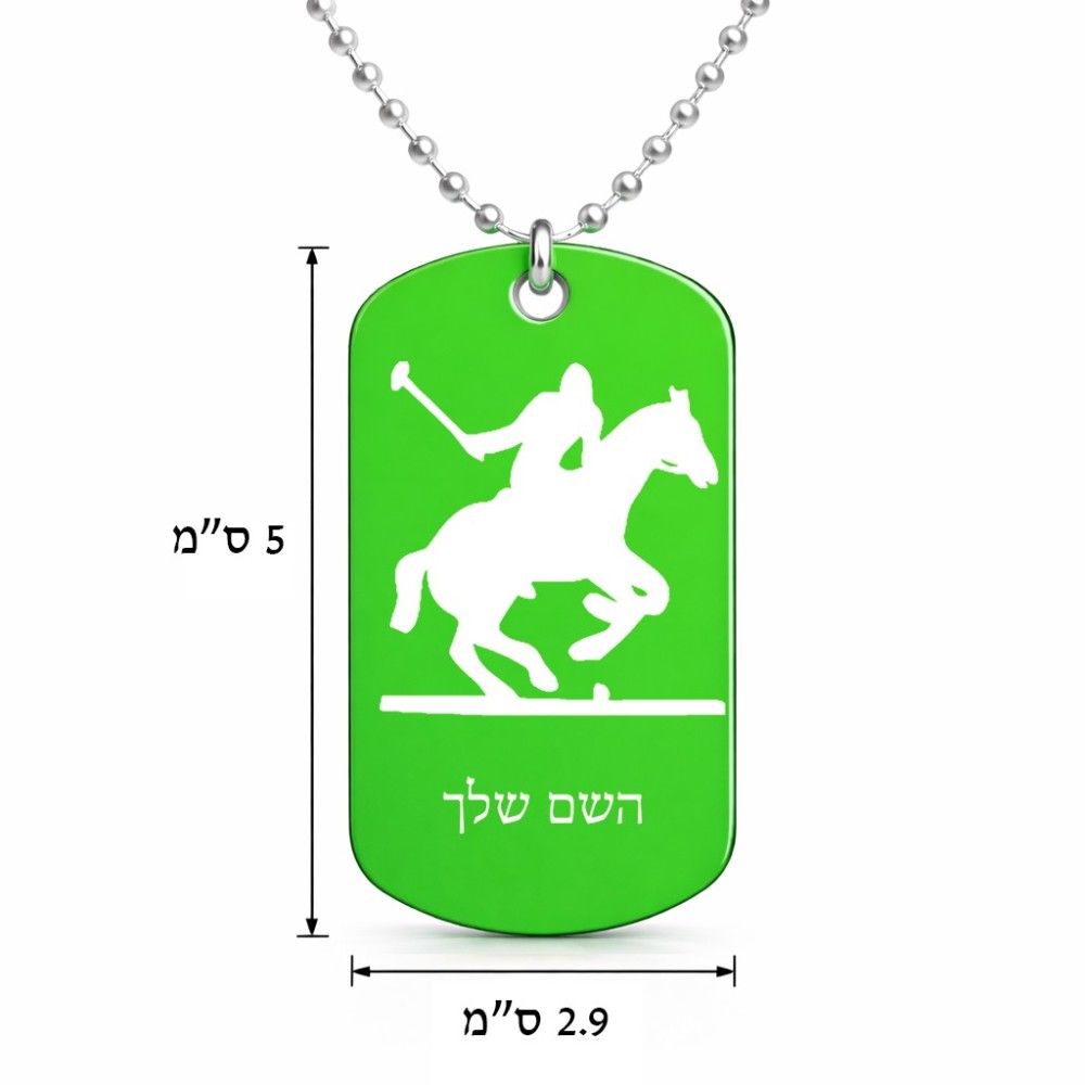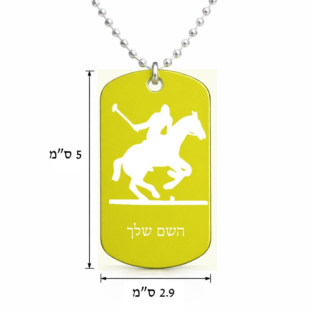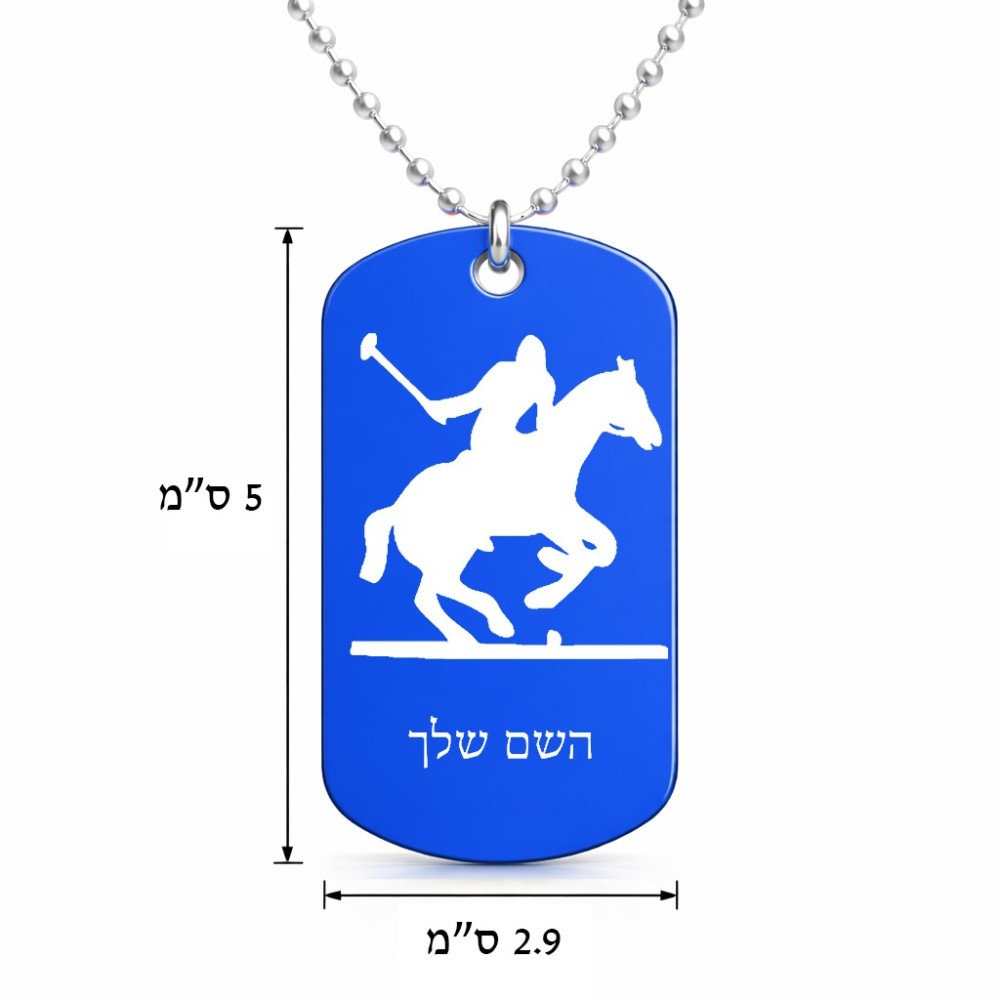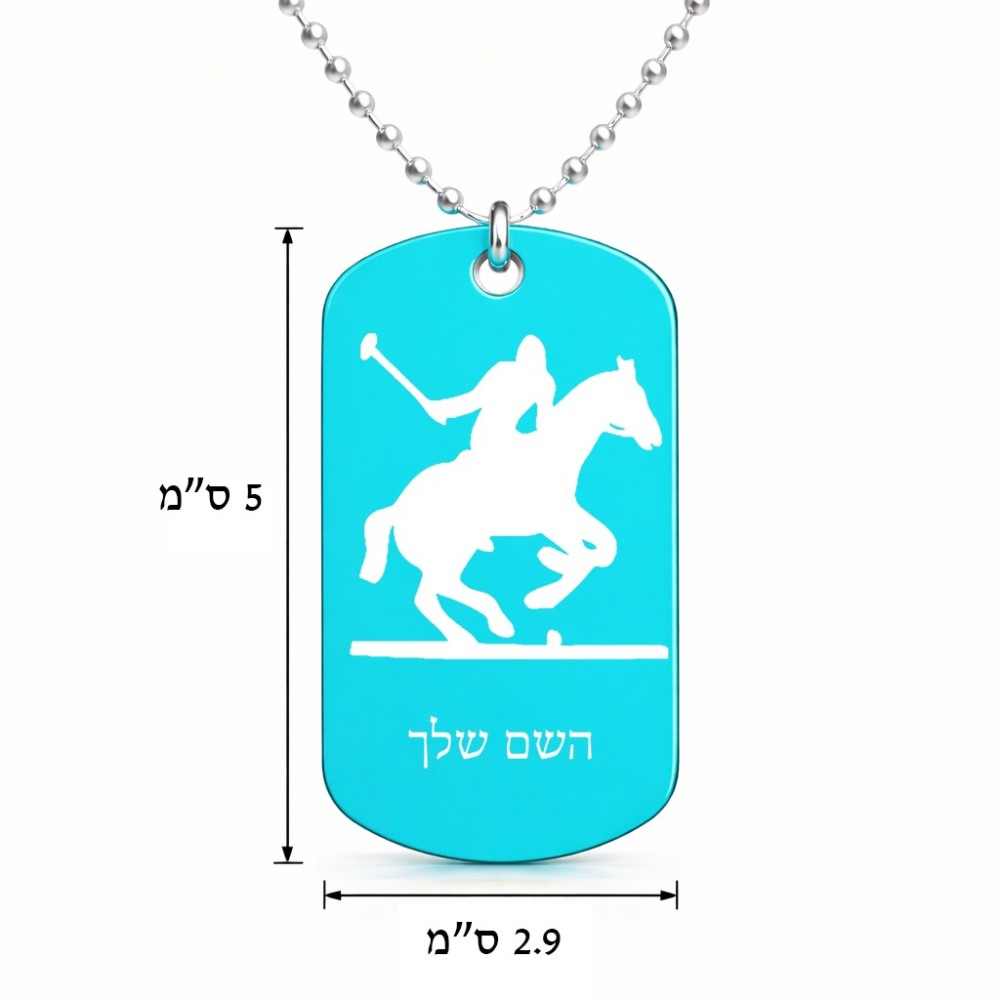 שרשרת דיסקיט מאלומיניום בעיצוב אישי עם השם שלך בעיצוב שחקן פולו - סוס גודל הדיסקיט 2.9 × 5 ס"מ. את השם המבוקש ניתן לציין בהזמנה, אם לא צויין אנחנו ניצור קשר לבירור.