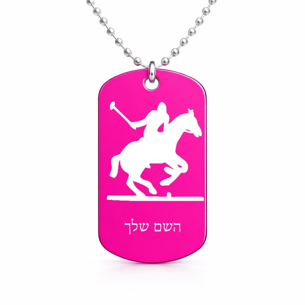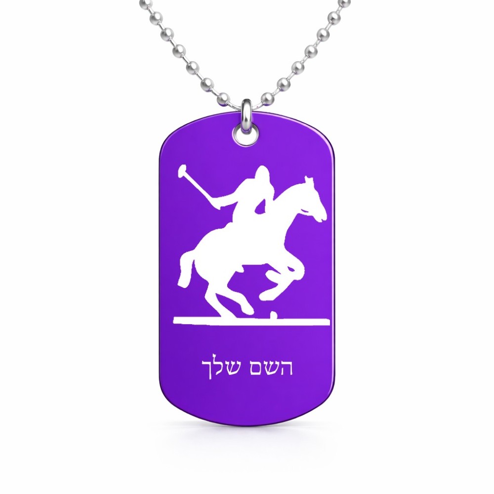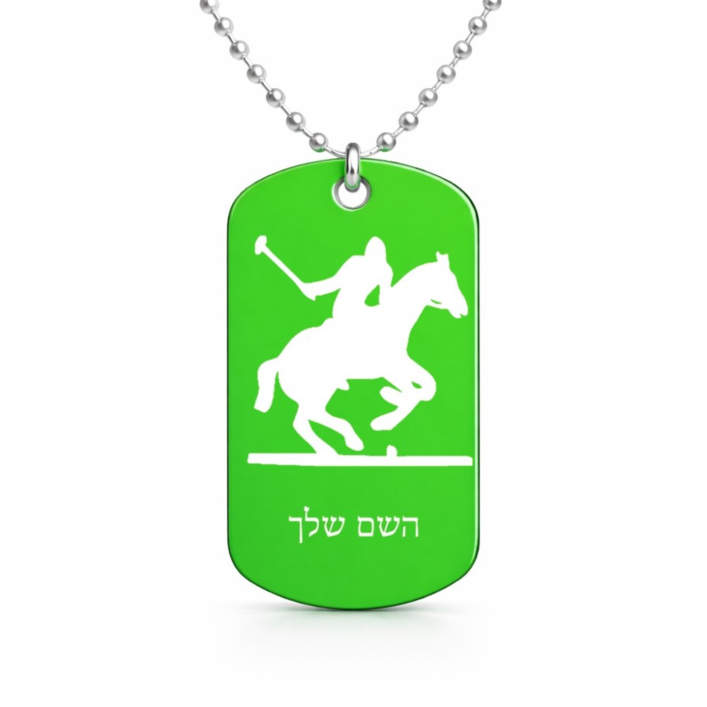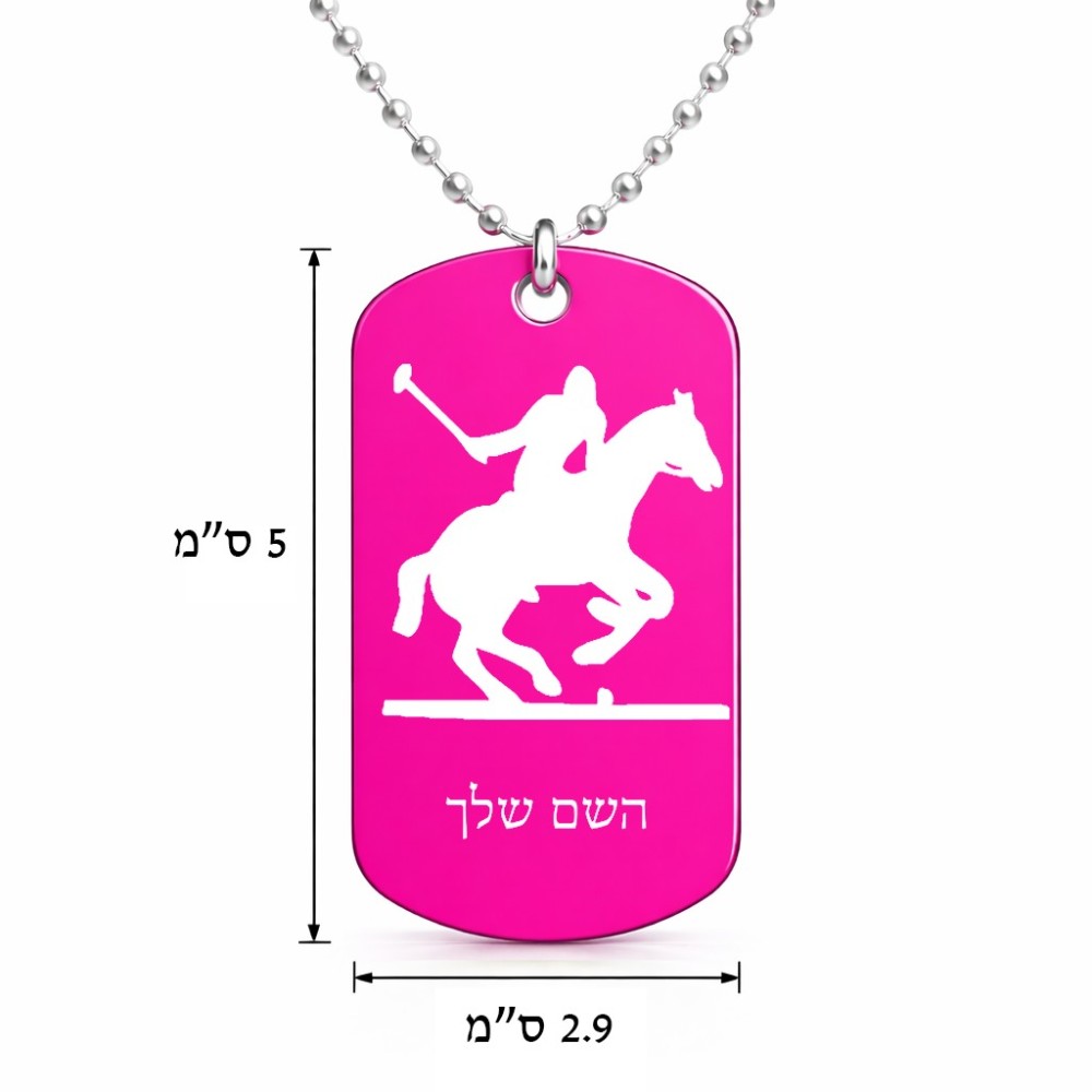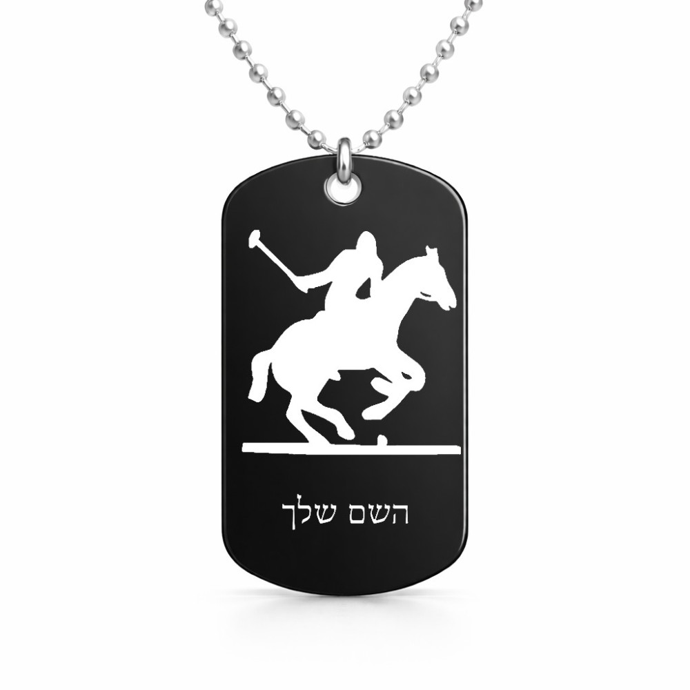 שרשרת דיסקיט מאלומיניום בעיצוב אישי עם השם שלך בעיצוב שחקן פולו - סוס גודל הדיסקיט 2.9 × 5 ס"מ. את השם המבוקש ניתן לציין בהזמנה, אם לא צויין אנחנו ניצור קשר לבירור.