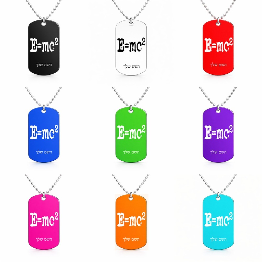 שרשרת דיסקיט מאלומיניום בעיצוב אישי עם השם שלך בעיצוב נוסחת אלברט איינשטיין גודל הדיסקיט 2.9 × 5 ס"מ