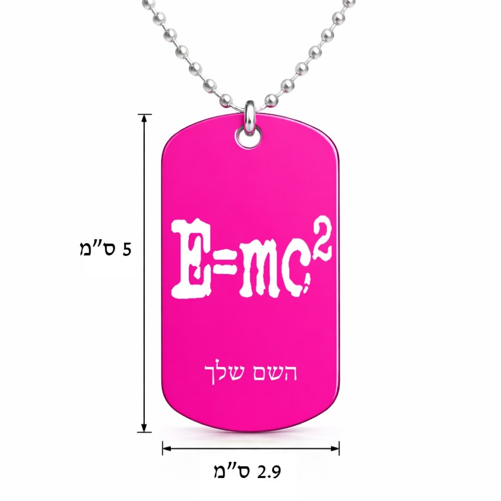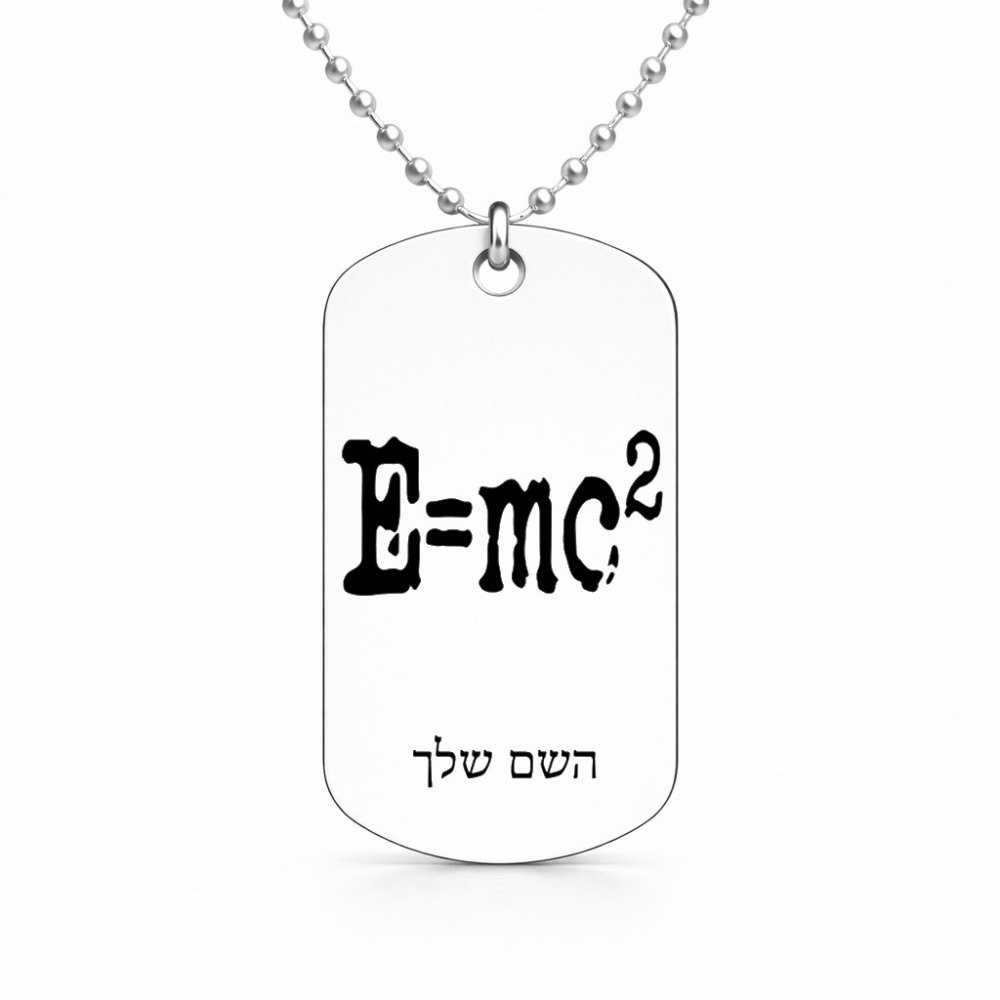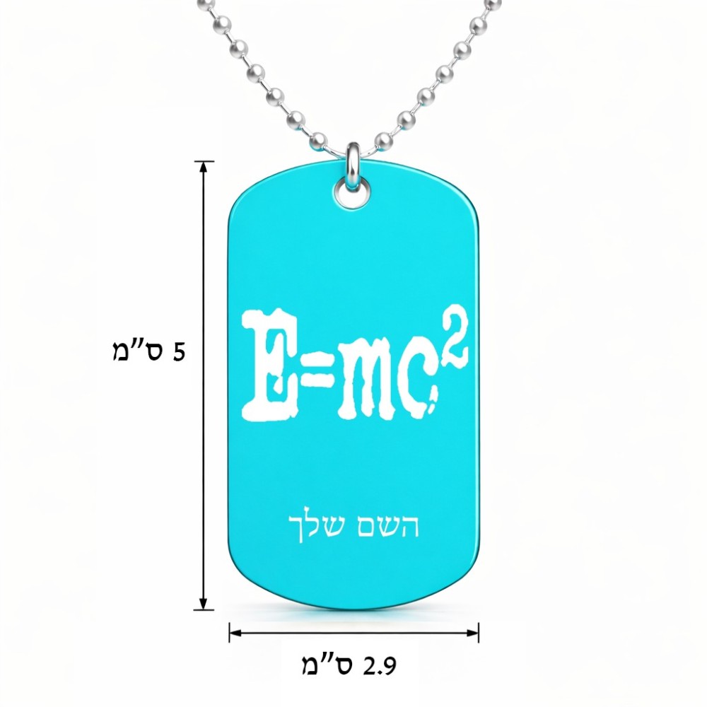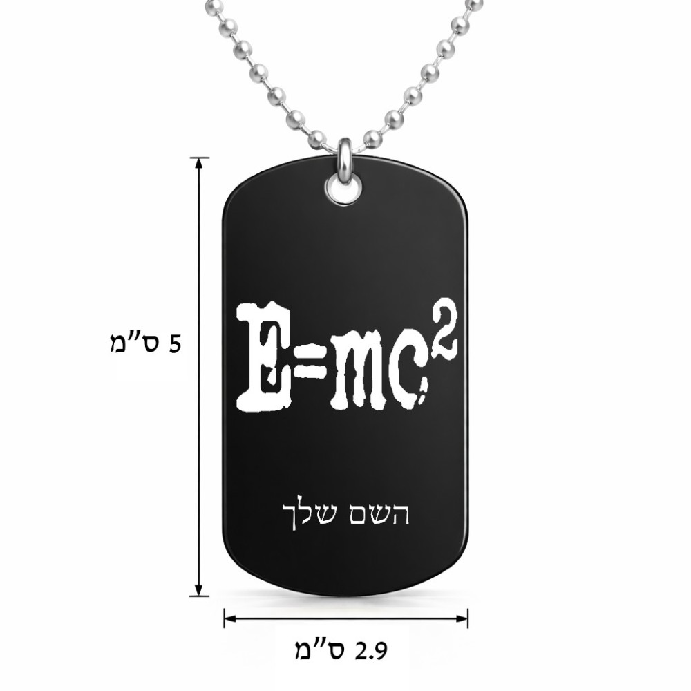 שרשרת דיסקיט מאלומיניום בעיצוב אישי עם השם שלך בעיצוב נוסחת אלברט איינשטיין גודל הדיסקיט 2.9 × 5 ס"מ. את השם המבוקש ניתן לציין בהזמנה, אם לא צויין אנחנו ניצור קשר לבירור.