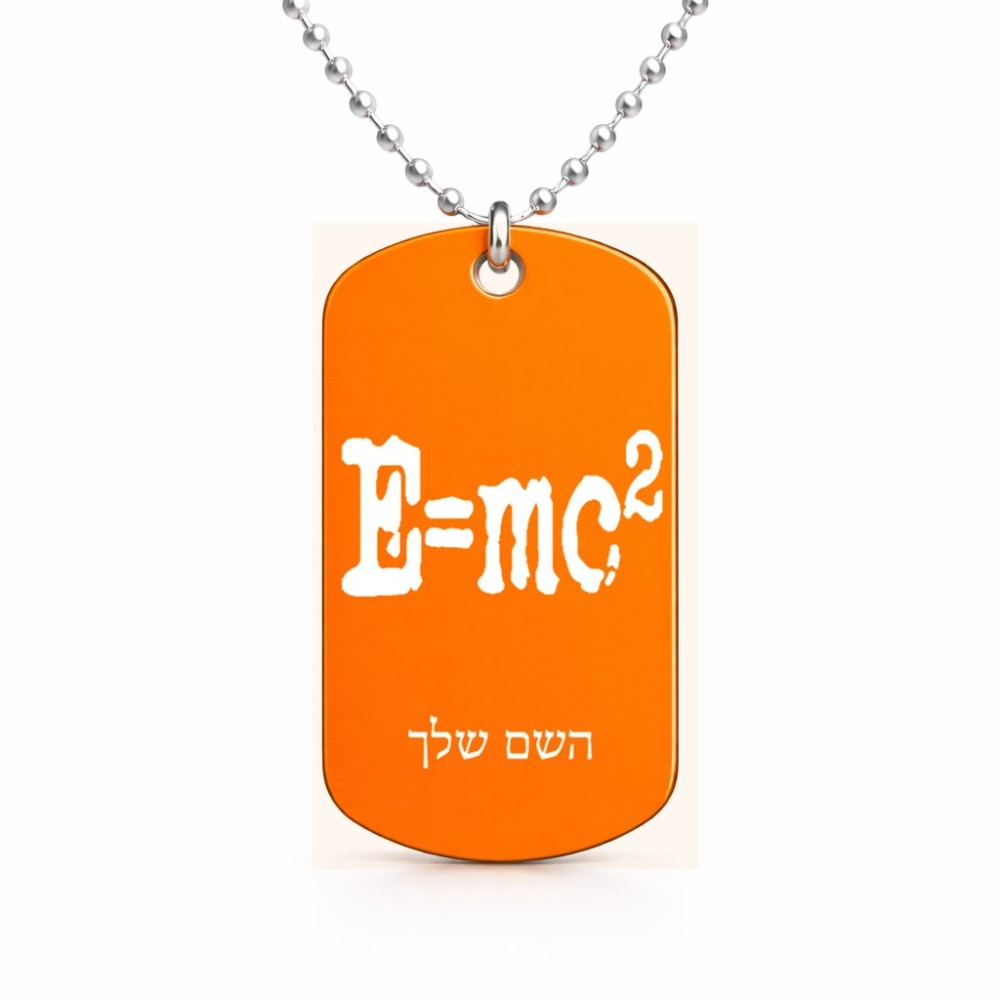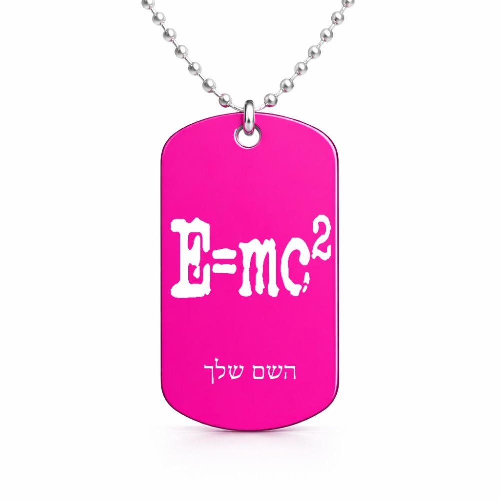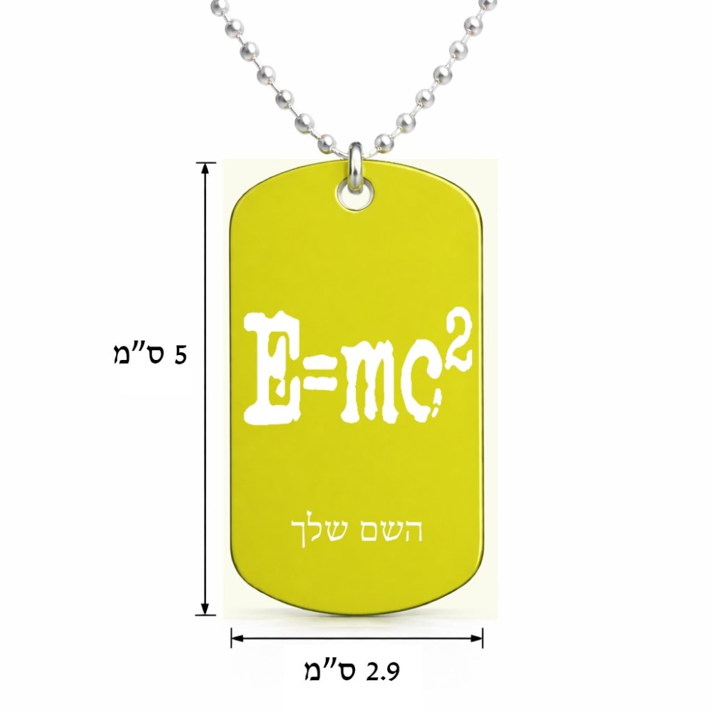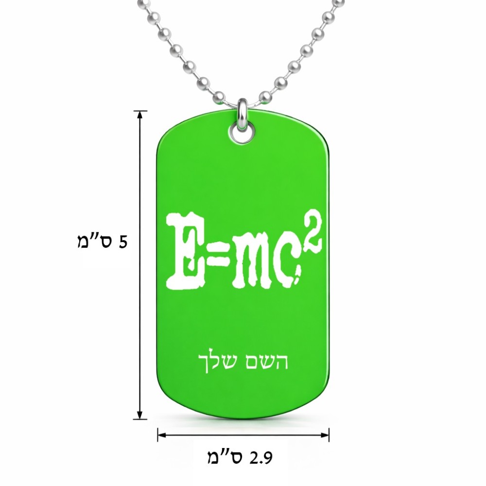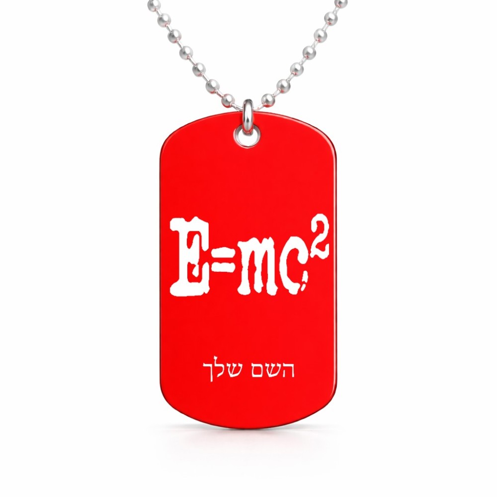 שרשרת דיסקיט מאלומיניום בעיצוב אישי עם השם שלך בעיצוב נוסחת אלברט איינשטיין גודל הדיסקיט 2.9 × 5 ס"מ. את השם המבוקש ניתן לציין בהזמנה, אם לא צויין אנחנו ניצור קשר לבירור.