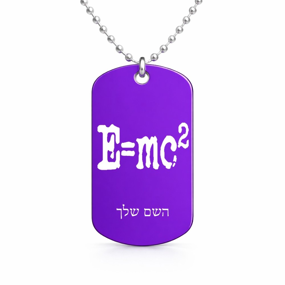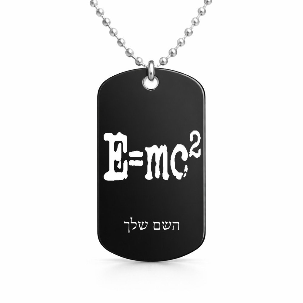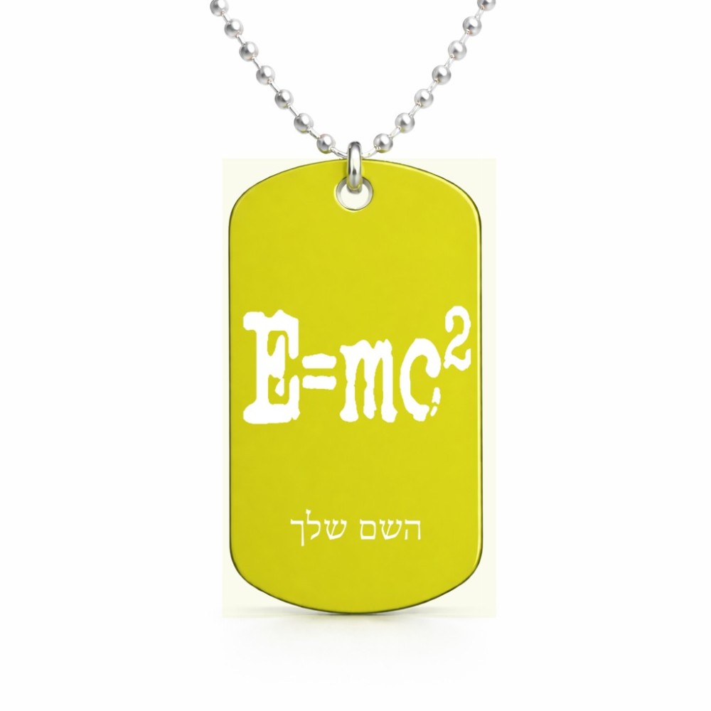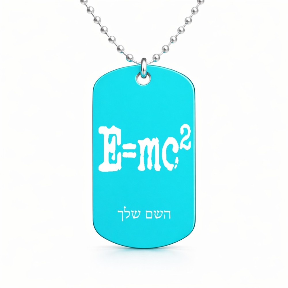 שרשרת דיסקיט מאלומיניום בעיצוב אישי עם השם שלך בעיצוב נוסחת אלברט איינשטיין גודל הדיסקיט 2.9 × 5 ס"מ. את השם המבוקש ניתן לציין בהזמנה, אם לא צויין אנחנו ניצור קשר לבירור.
