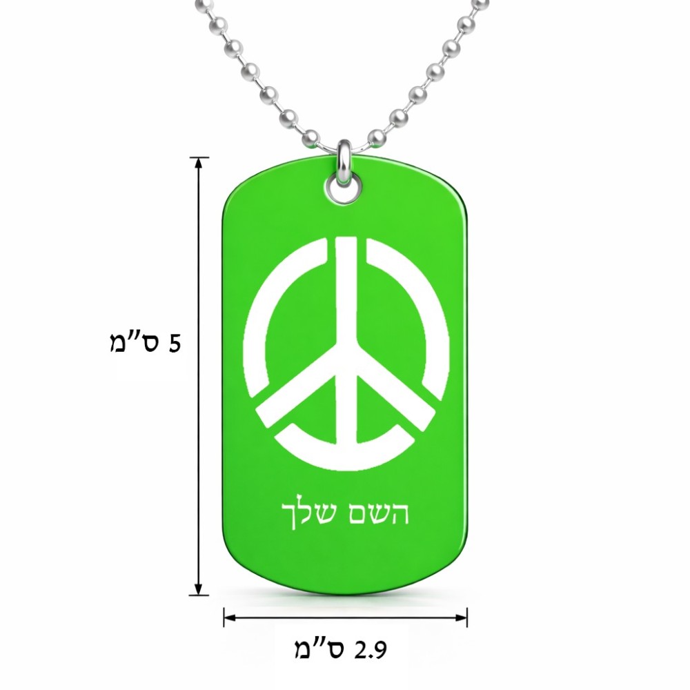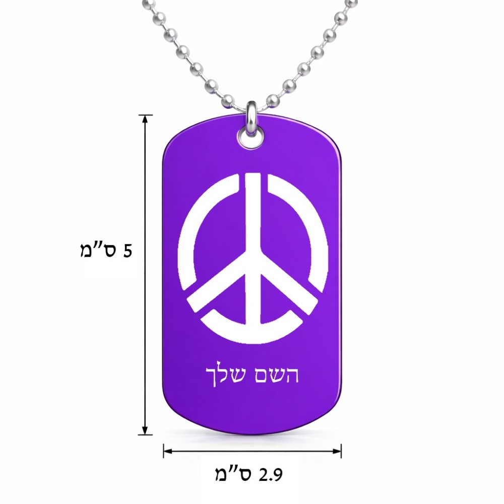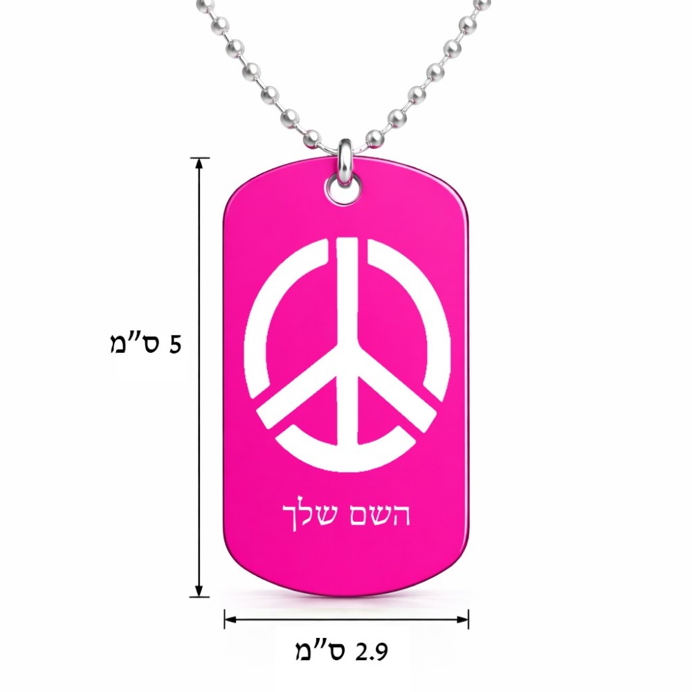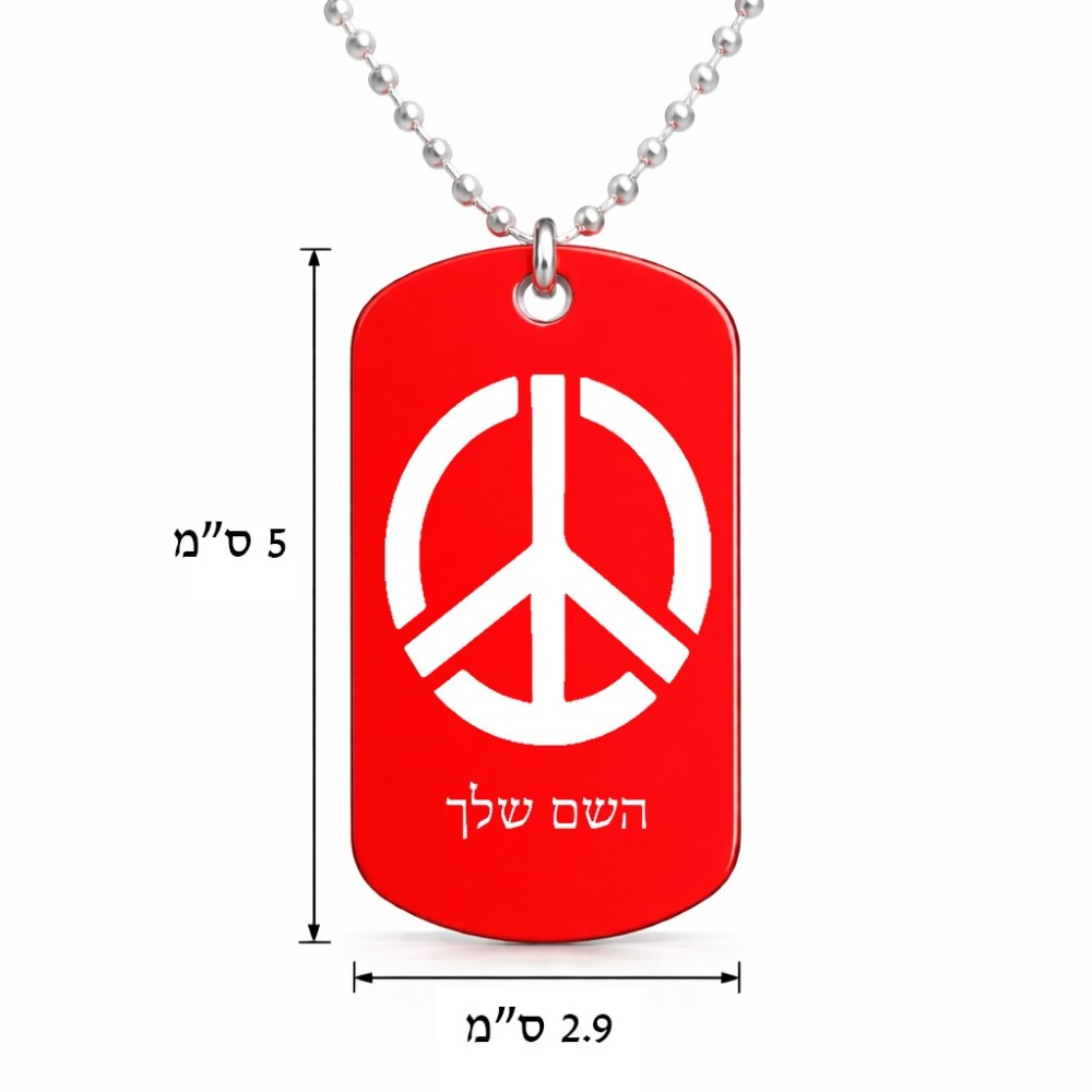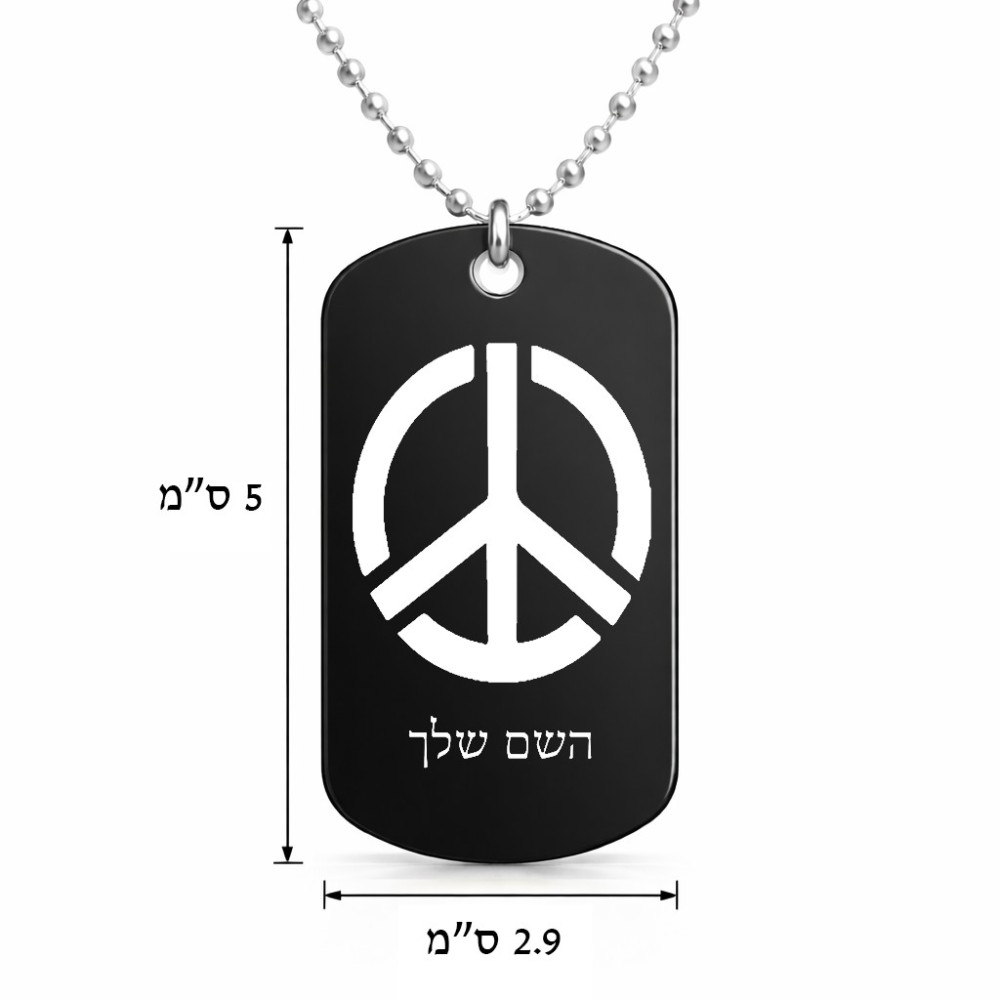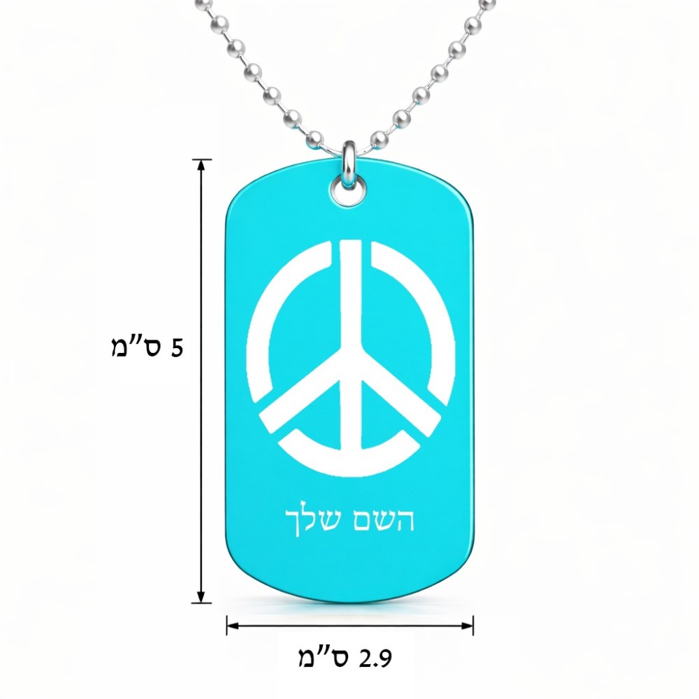 שרשרת דיסקיט מאלומיניום בעיצוב אישי עם השם שלך בעיצוב סמל השלום גודל הדיסקיט 2.9 × 5 ס"מ. את השם המבוקש ניתן לציין בהזמנה, אם לא צויין אנחנו ניצור קשר לבירור.