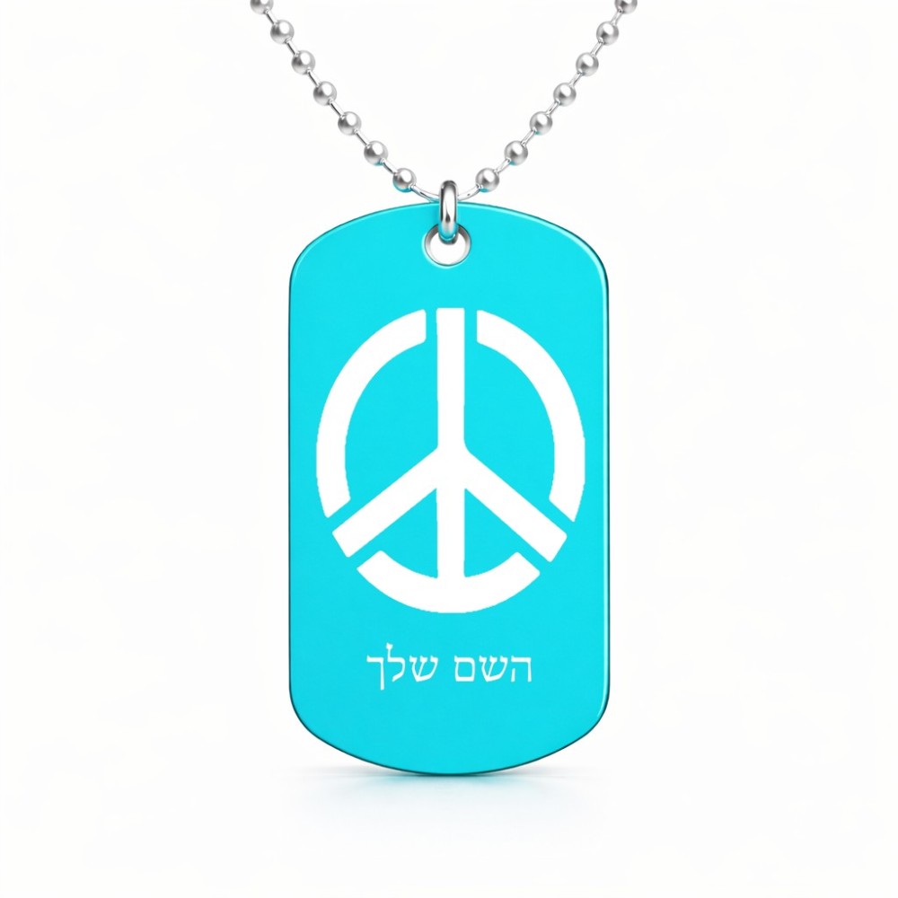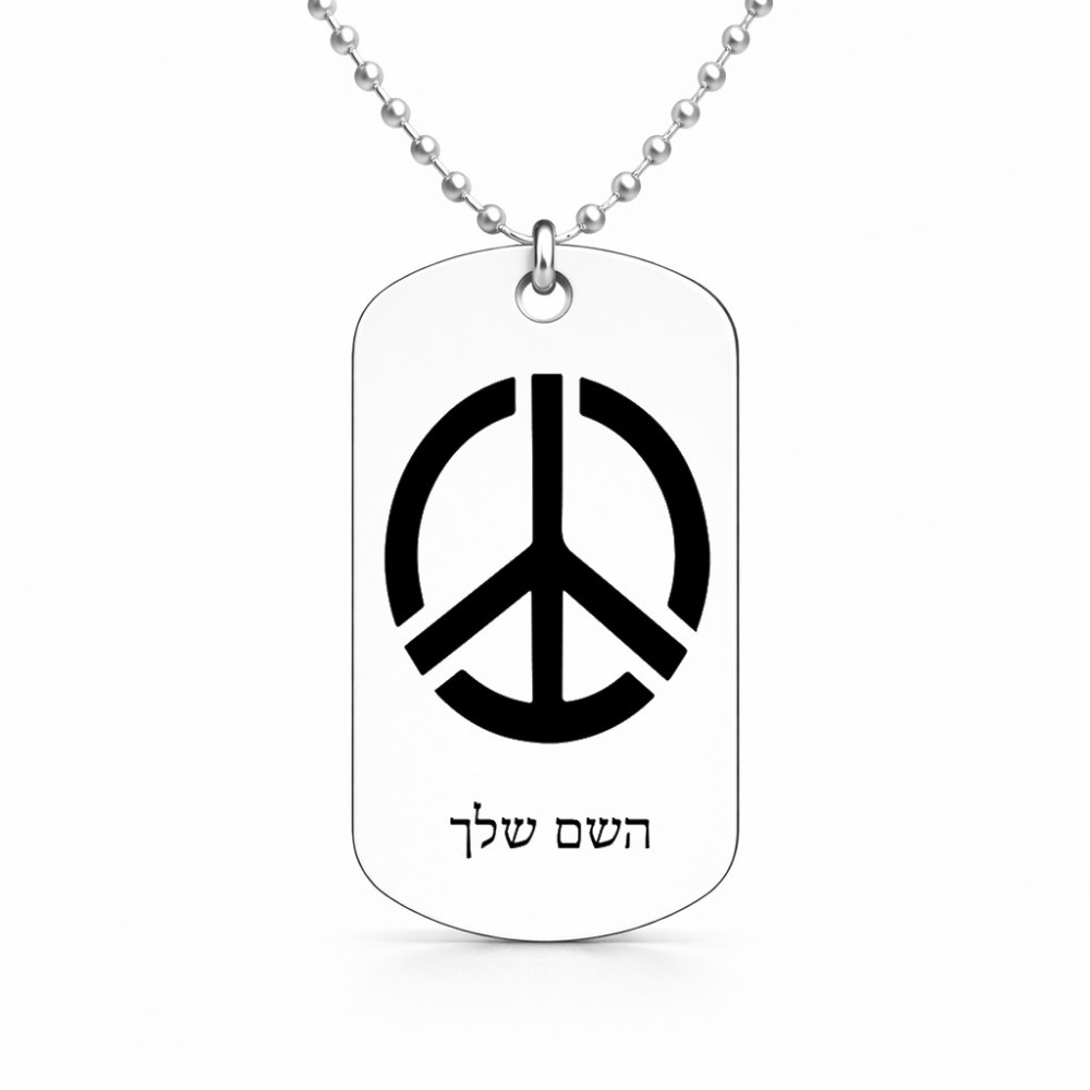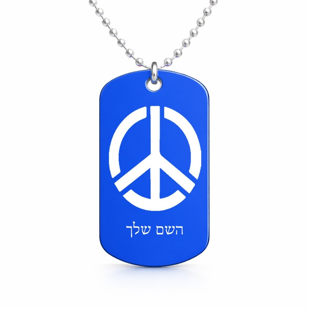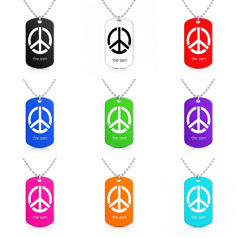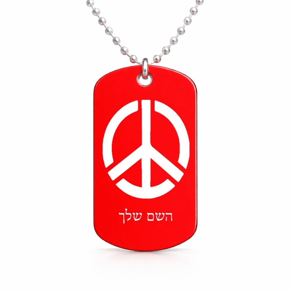 שרשרת דיסקיט מאלומיניום בעיצוב אישי עם השם שלך בעיצוב סמל השלום גודל הדיסקיט 2.9 × 5 ס"מ. את השם המבוקש ניתן לציין בהזמנה, אם לא צויין אנחנו ניצור קשר לבירור.
