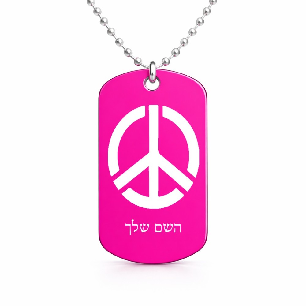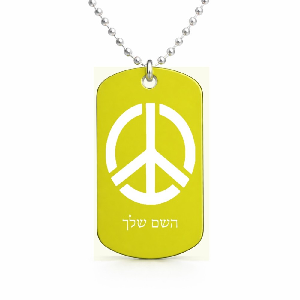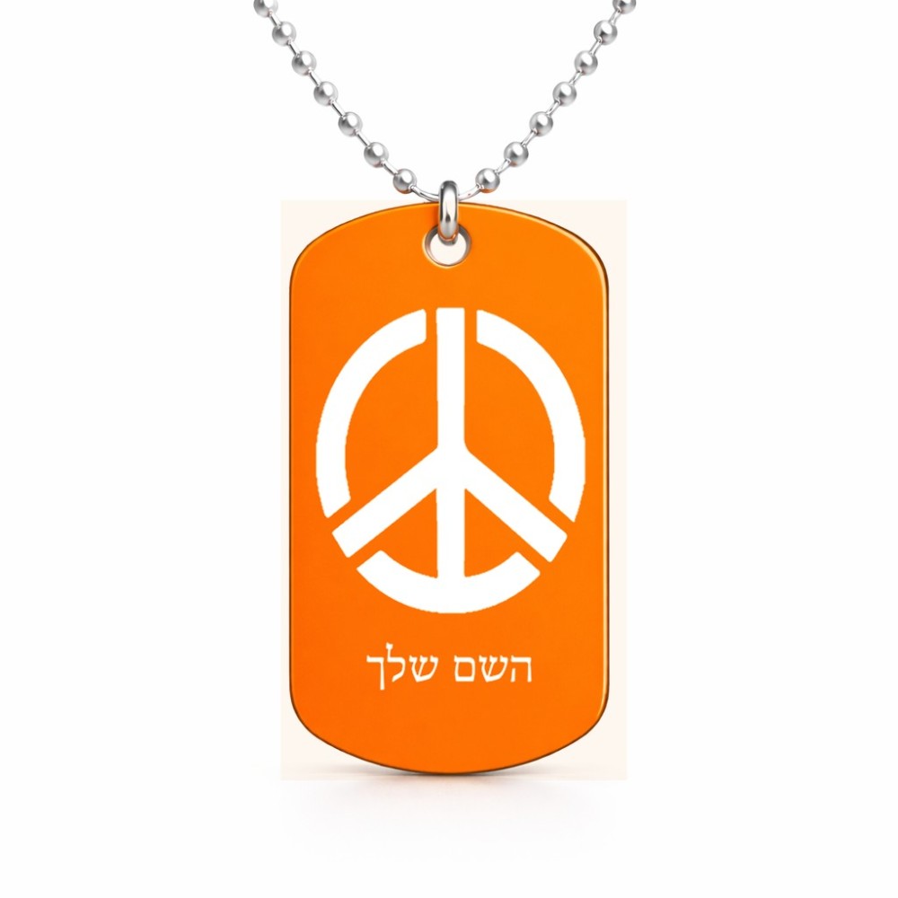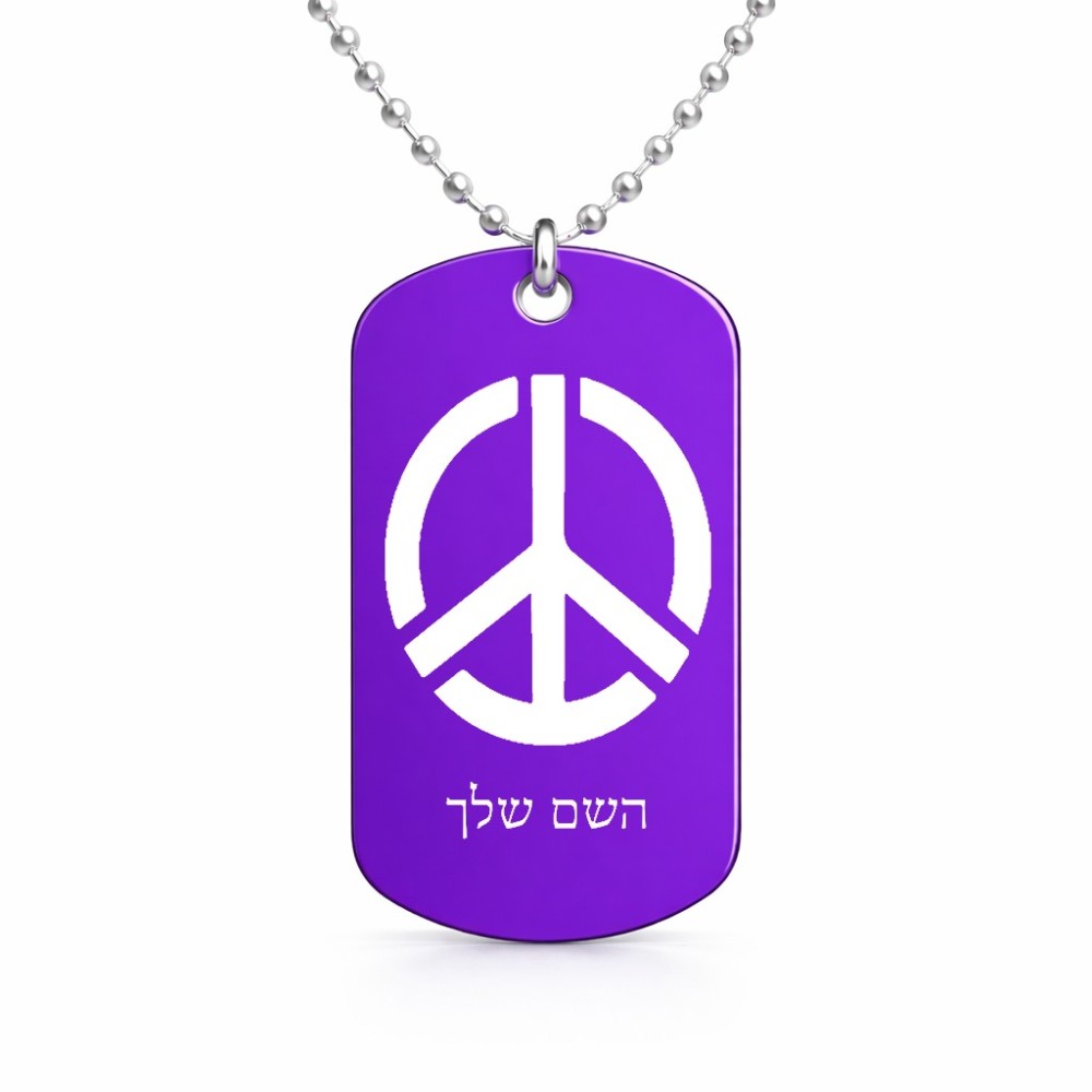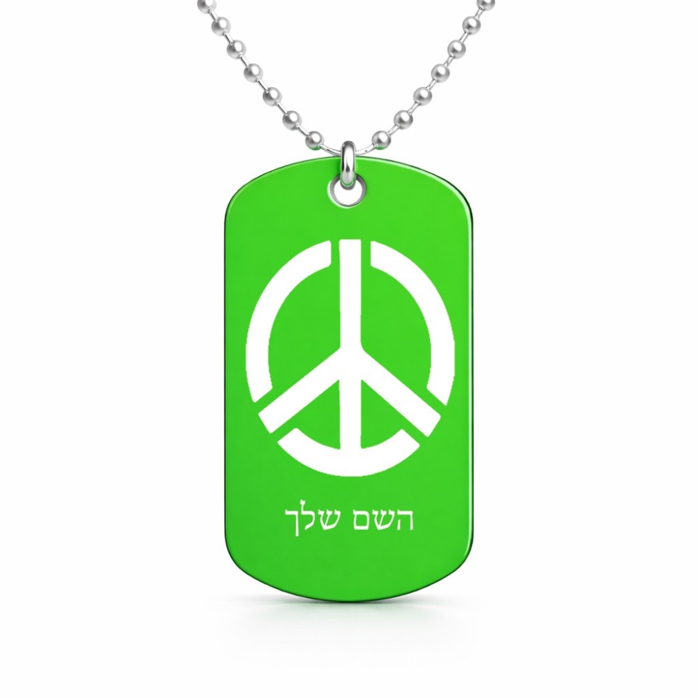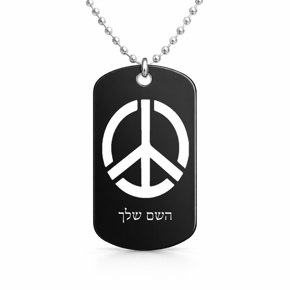 שרשרת דיסקיט מאלומיניום בעיצוב אישי עם השם שלך בעיצוב סמל השלום גודל הדיסקיט 2.9 × 5 ס"מ. את השם המבוקש ניתן לציין בהזמנה, אם לא צויין אנחנו ניצור קשר לבירור.