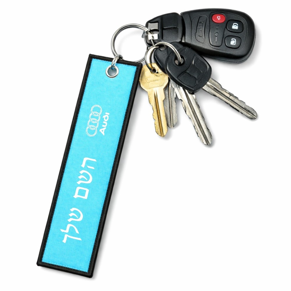 תווית סימון תיקים \ צרור מפתחות בעיצוב אישי עם השם שלך בעיצוב אאודי גודל התווית 12.9 × 3 ס"מ. את השם המבוקש ניתן לציין בהזמנה, אם לא צויין אנחנו ניצור קשר לבירור.